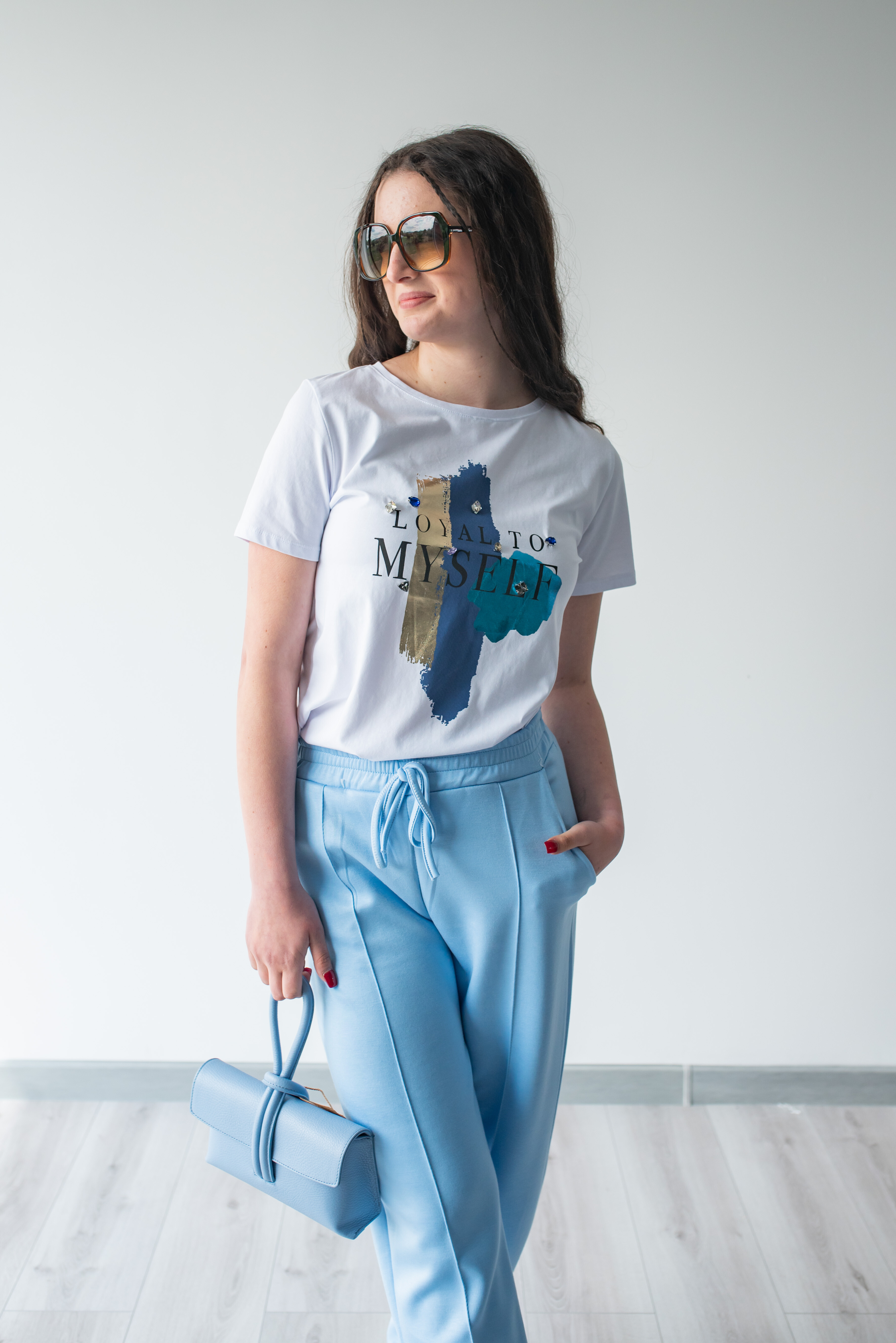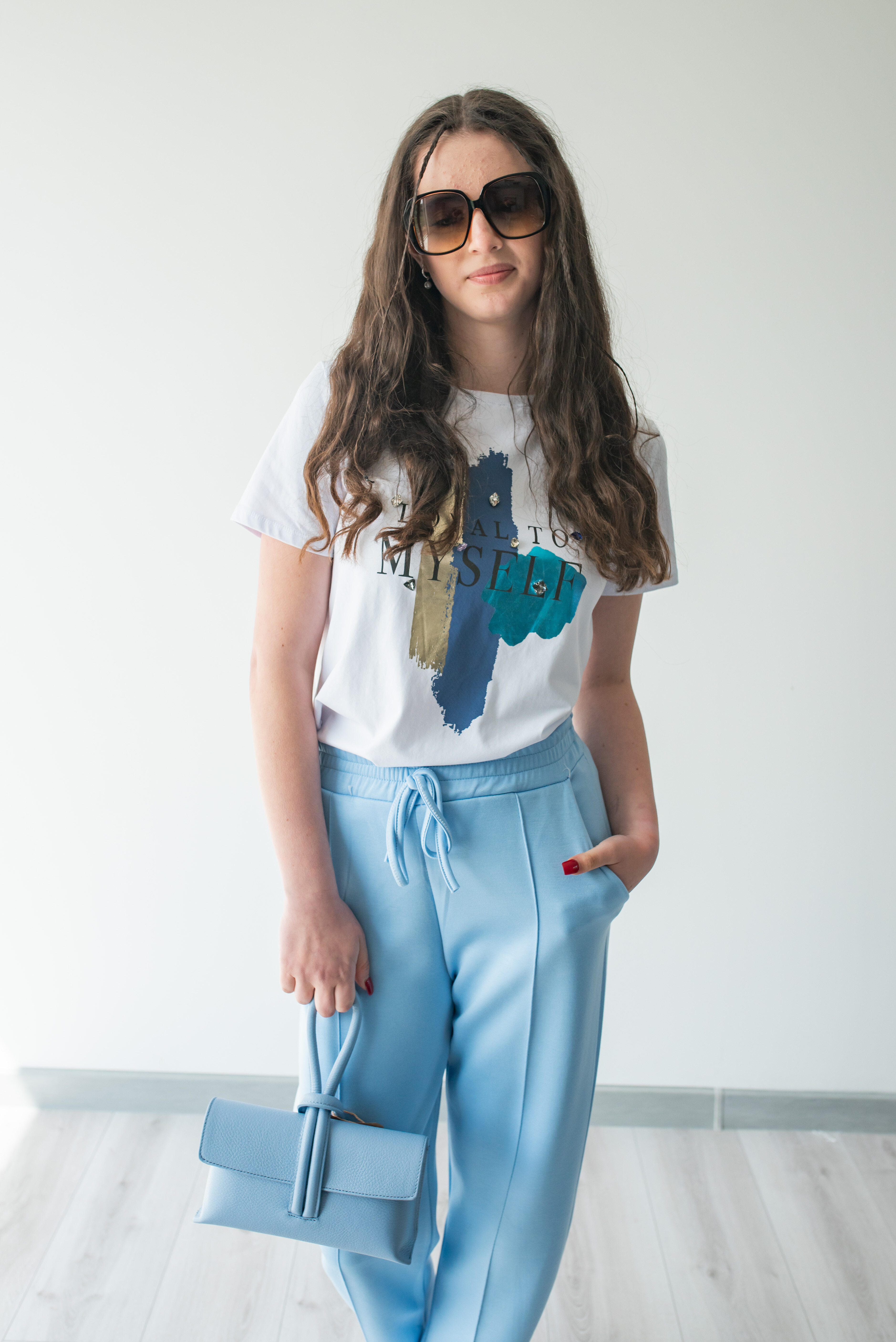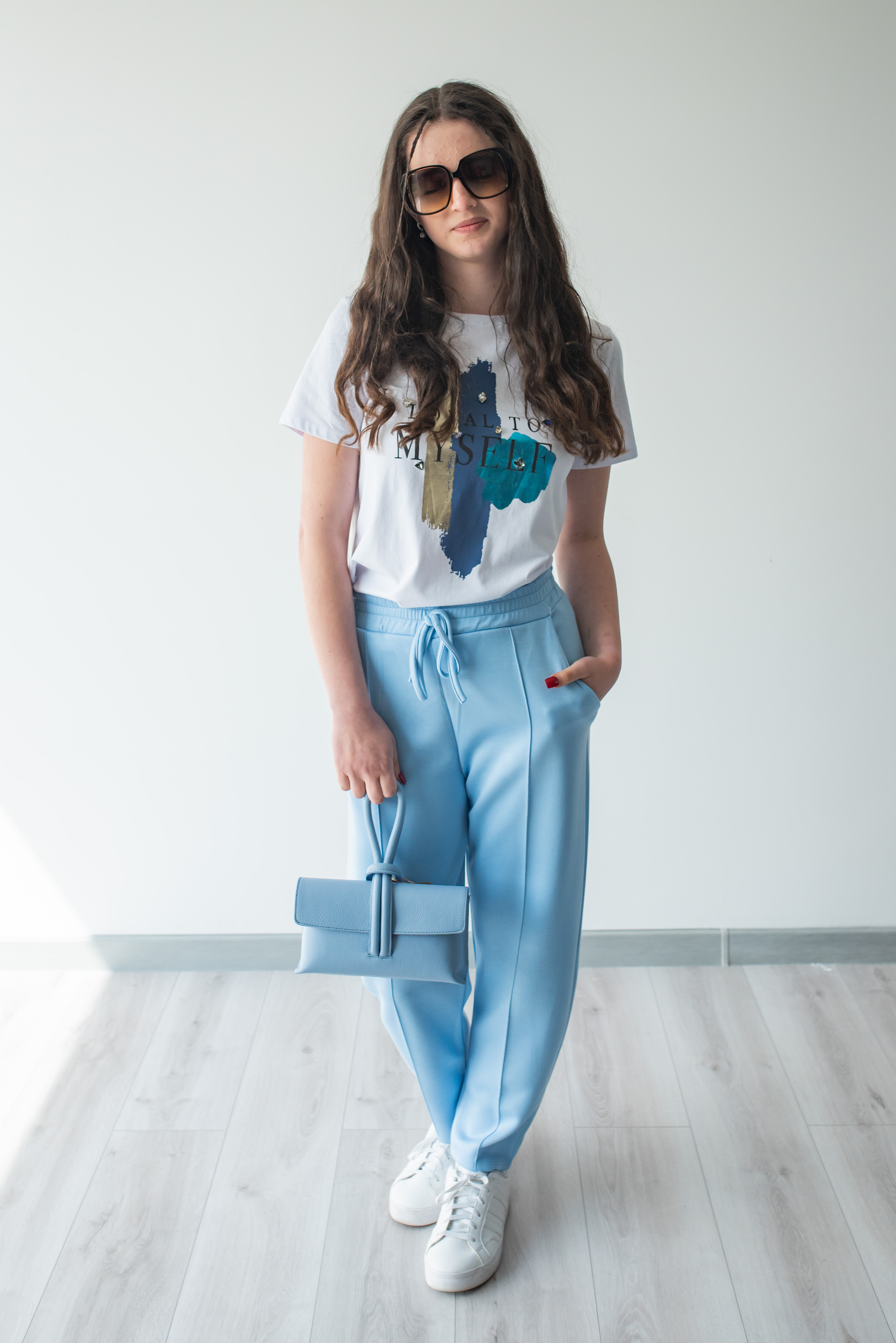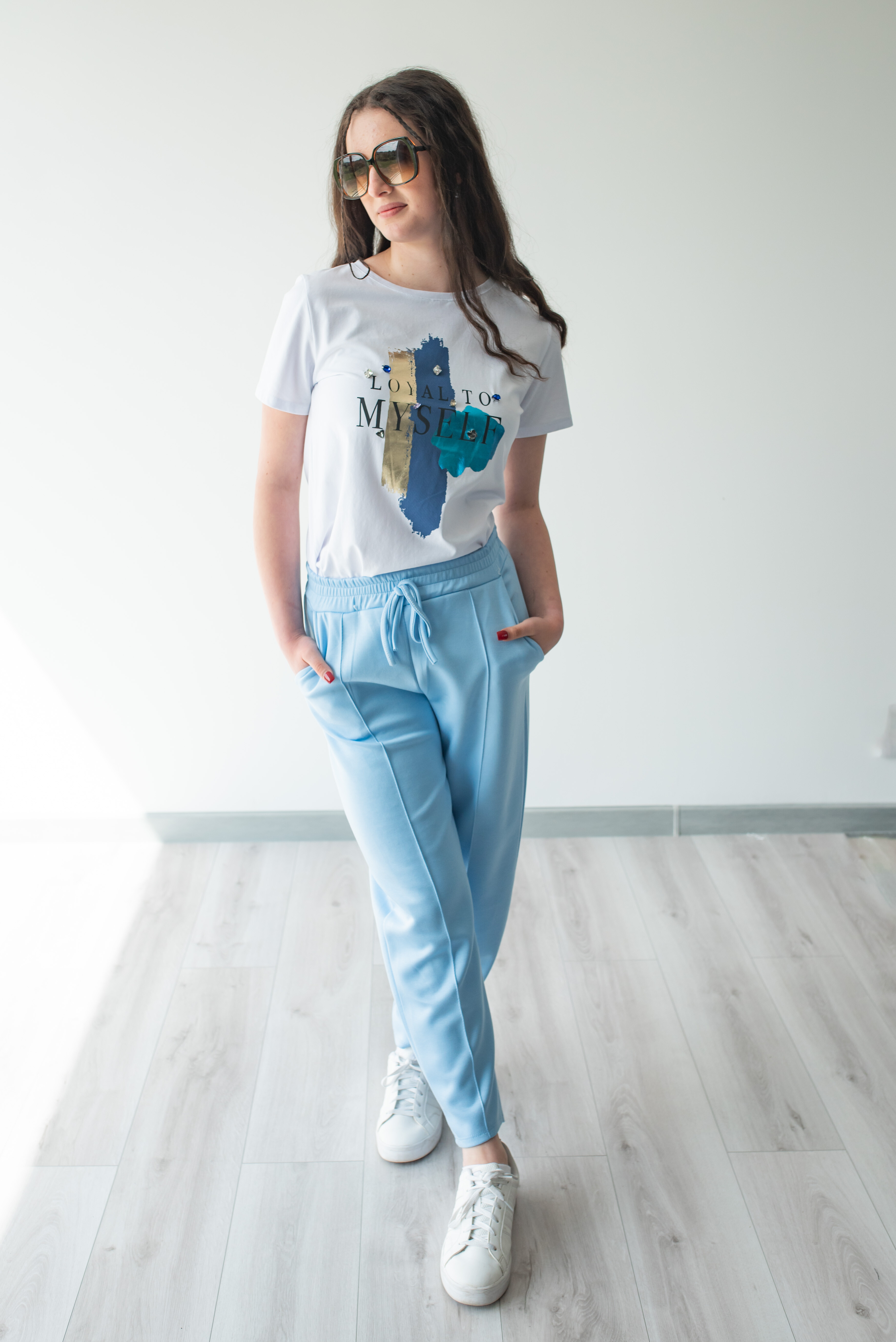 Dámské teplákové kalhoty, v pase do gumy. Kalhoty mají v pase šňůrku a našité kapsy na přední straně.