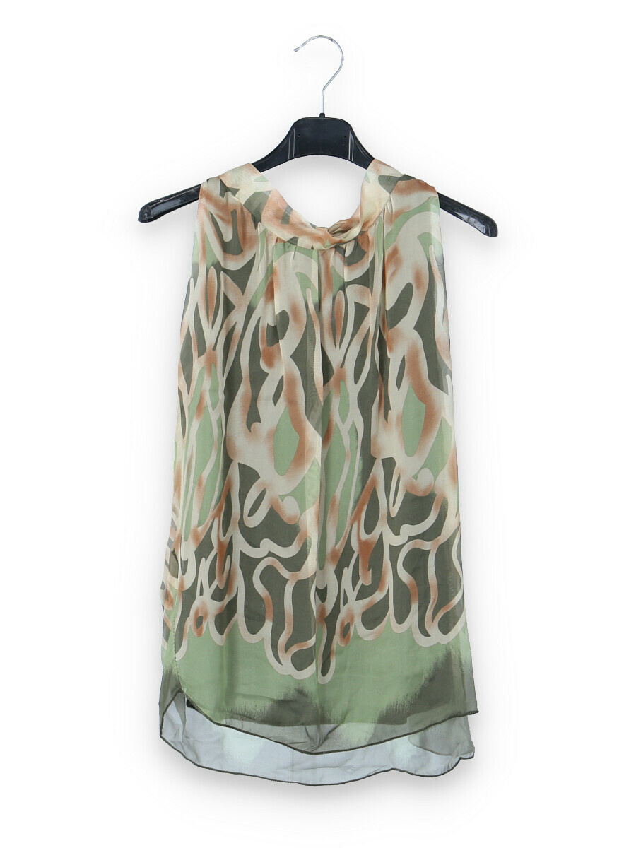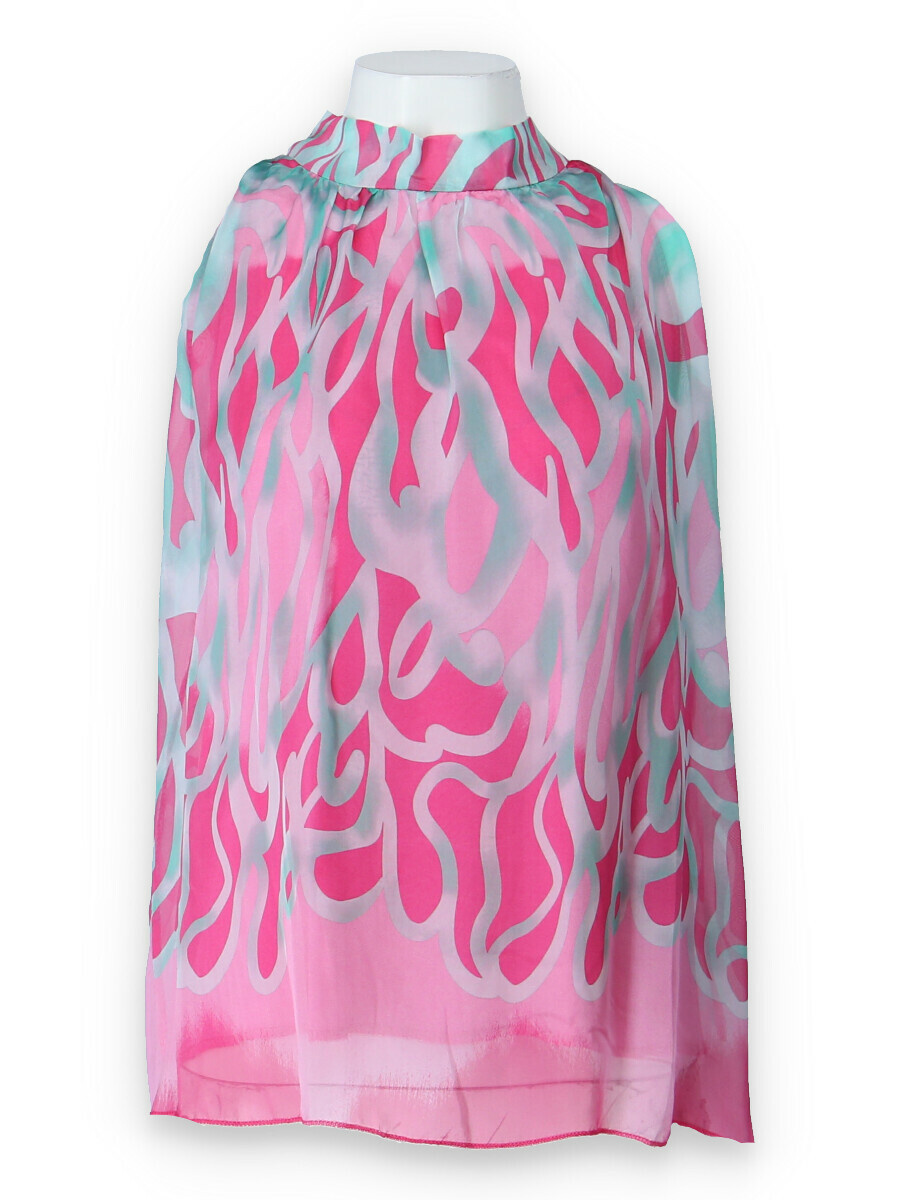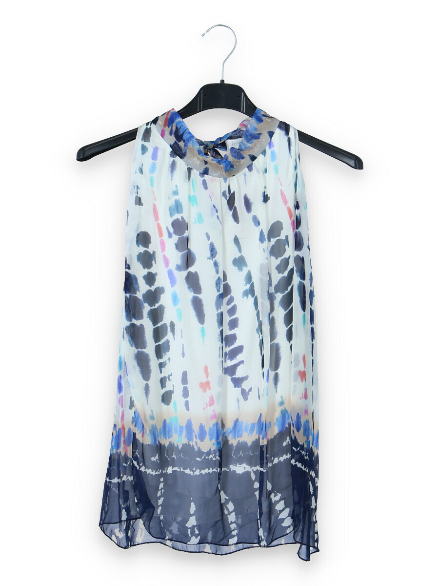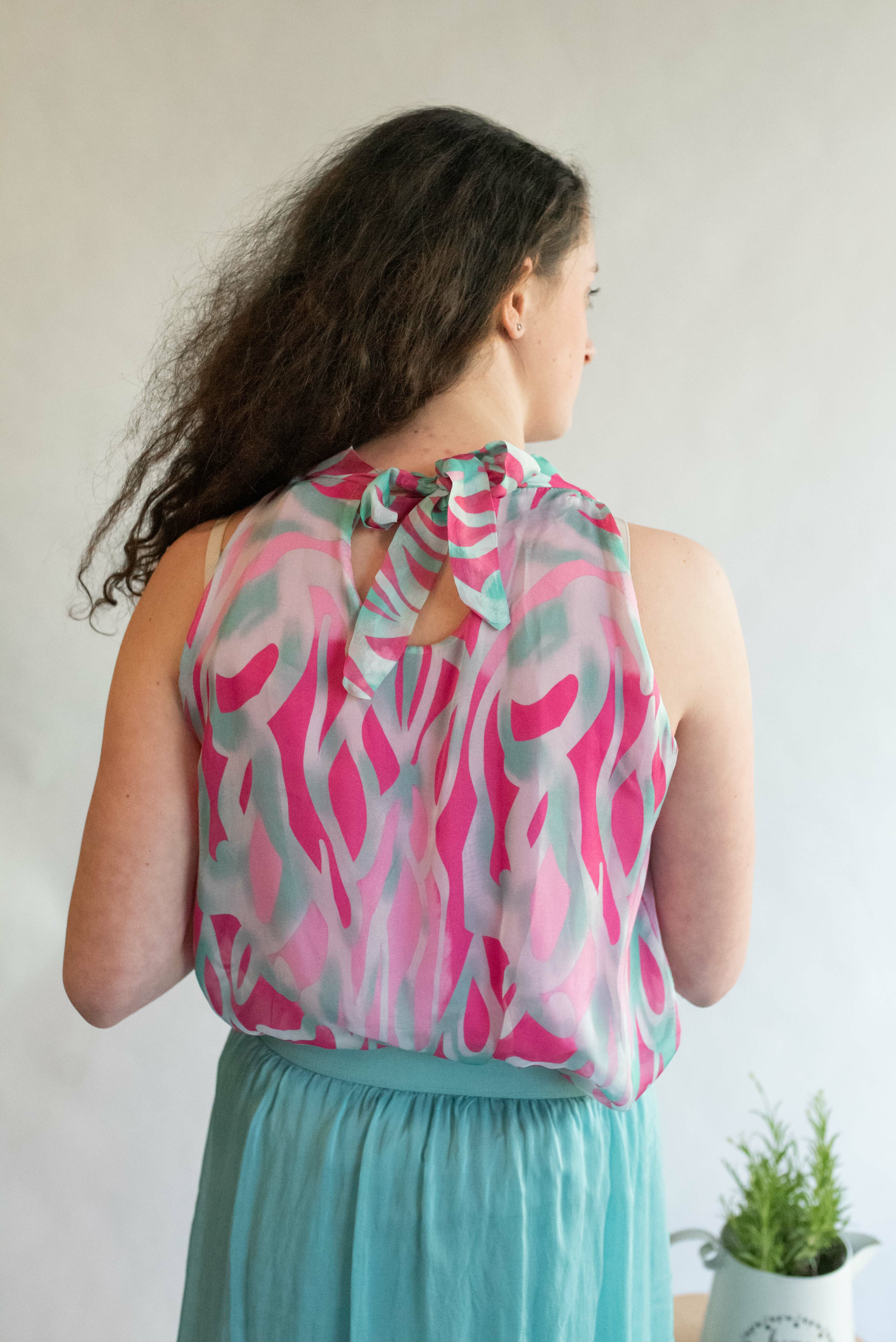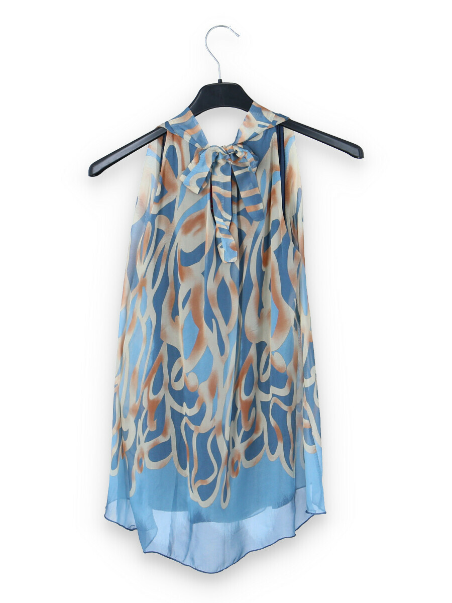 Letní hedvábný top se stojáčkem, se zavazováním na zádech.
