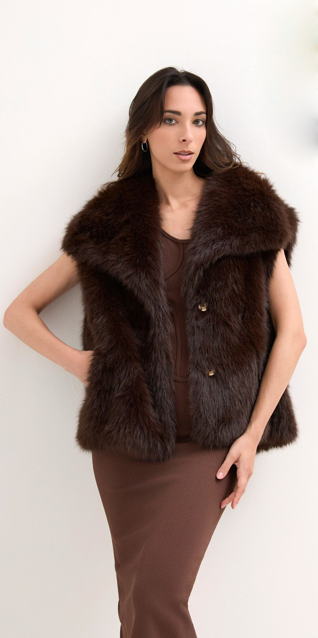 Trendy chlupatá vesta volnějšího střihu. Vesta má zapínání na druky.
