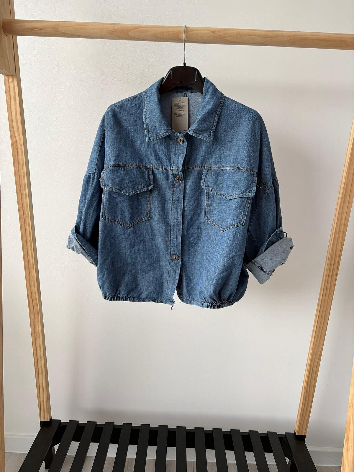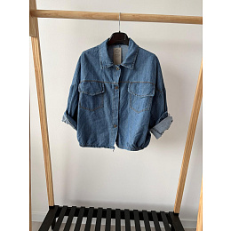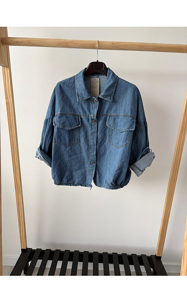 Trendy džínová bunda volnějšího střihu se zapínáním na kovové knoflíky. Bunda má na přední straně našité kapsy s klopami a gumičkové řasení v pase.