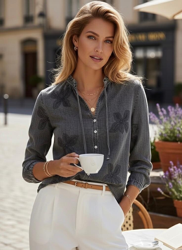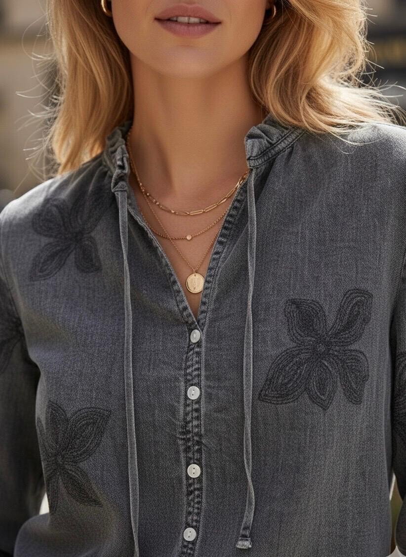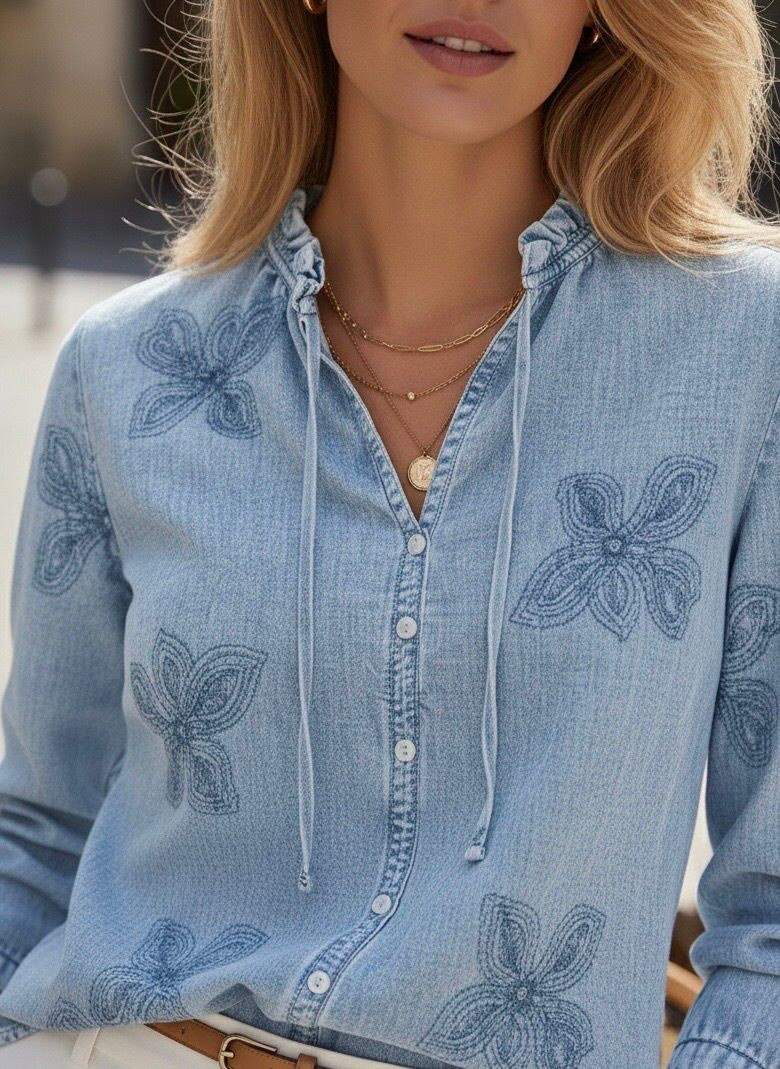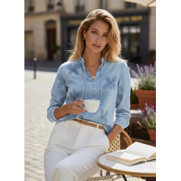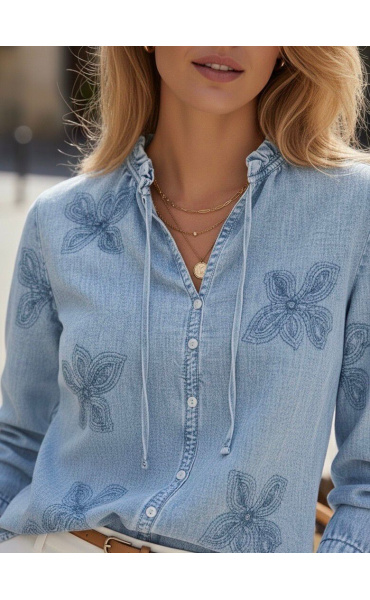 Trendy džínová košile s výšivkou květů. Košile má drobné falešné knoflíčky, není propínací s véčkovým výstřihem, zakončeným řasením u krku se šňůrkou na uvázání. Košile má dlouhý rukáv zakončený do gumy s drobným řasením.