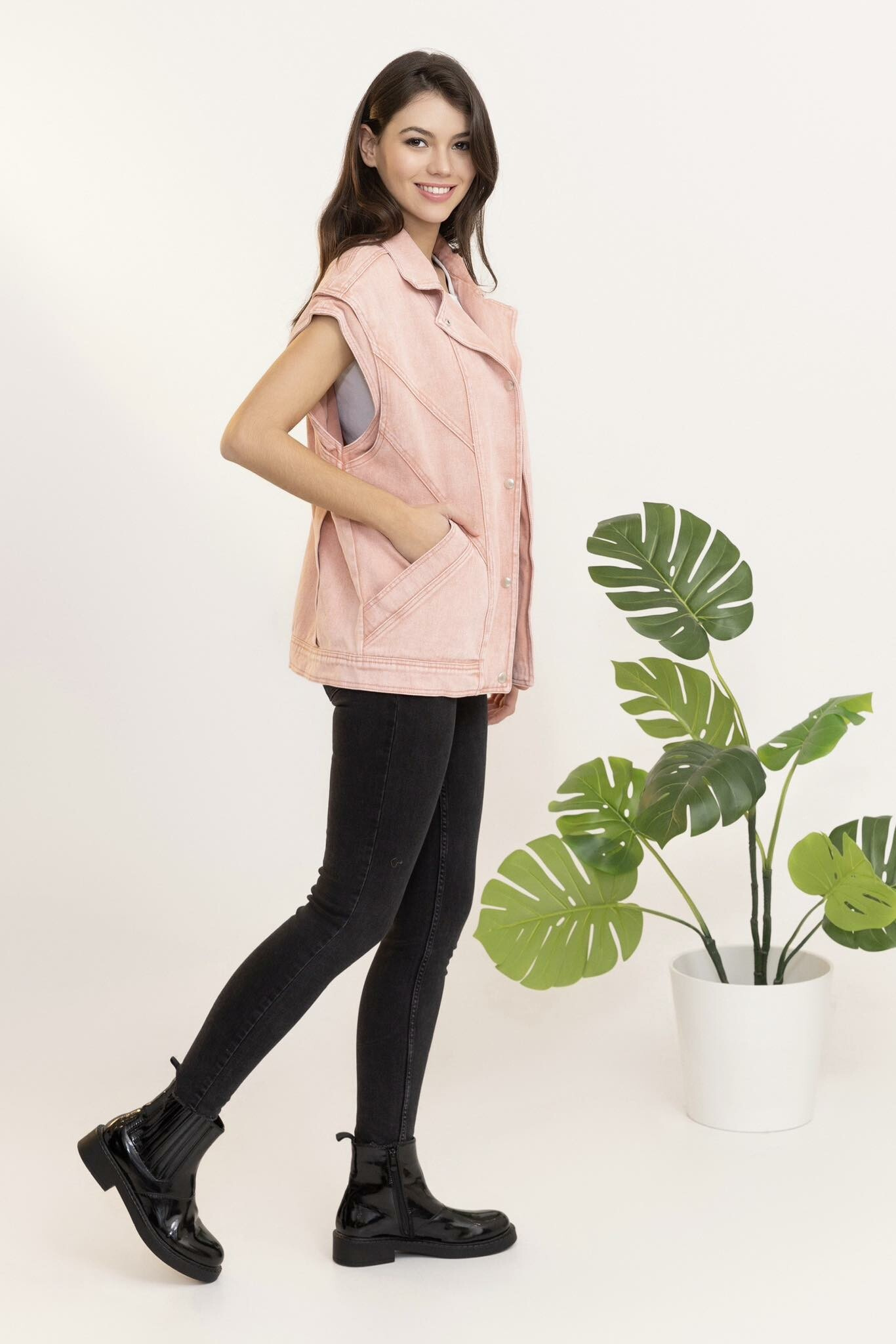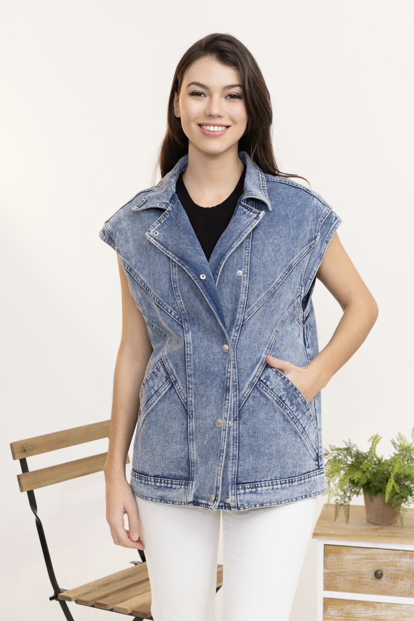 Módní džínová vesta v retro stylu. Vesta je v oversized střihu, má klopový límec a raglanové kapsy.