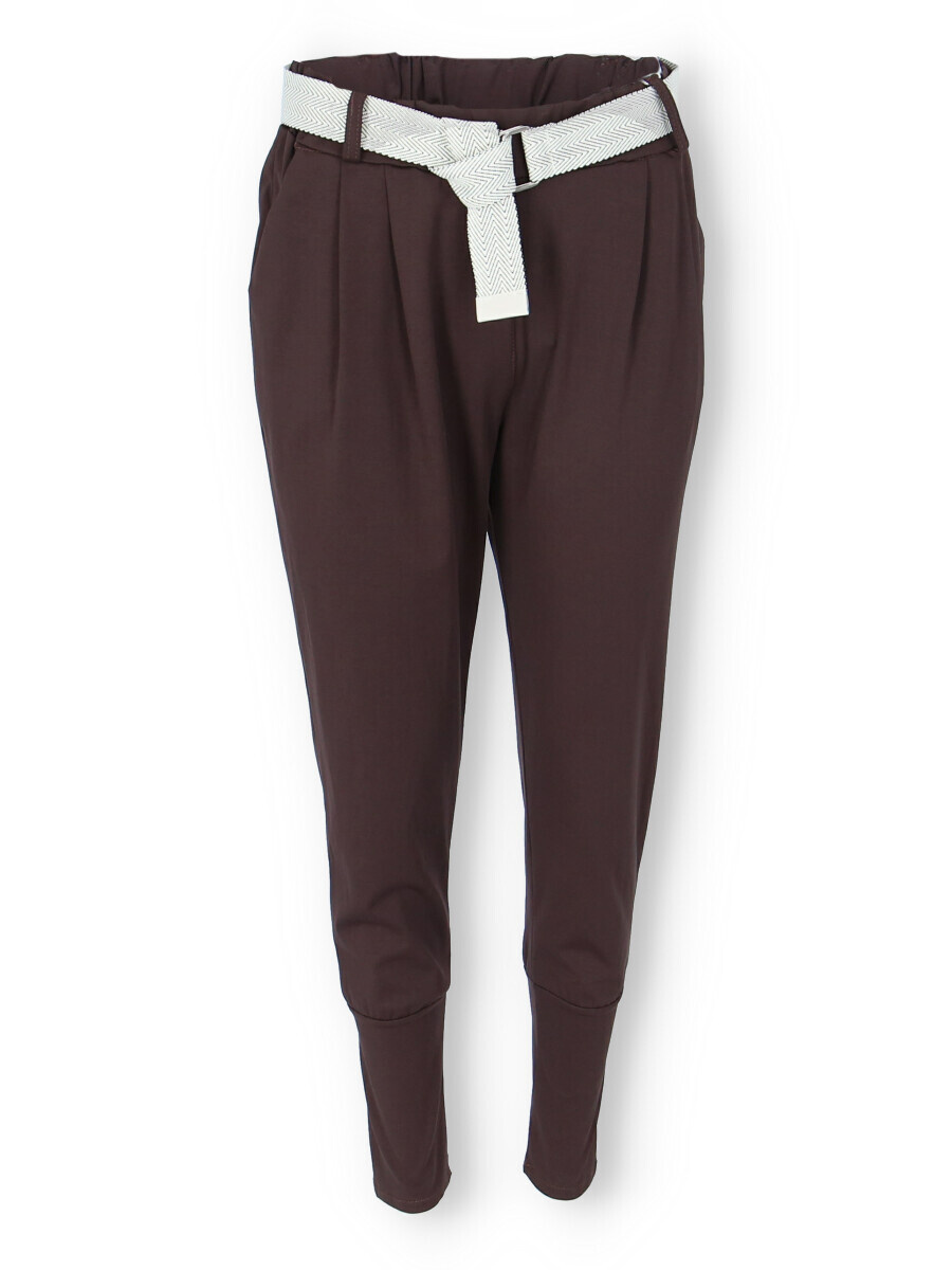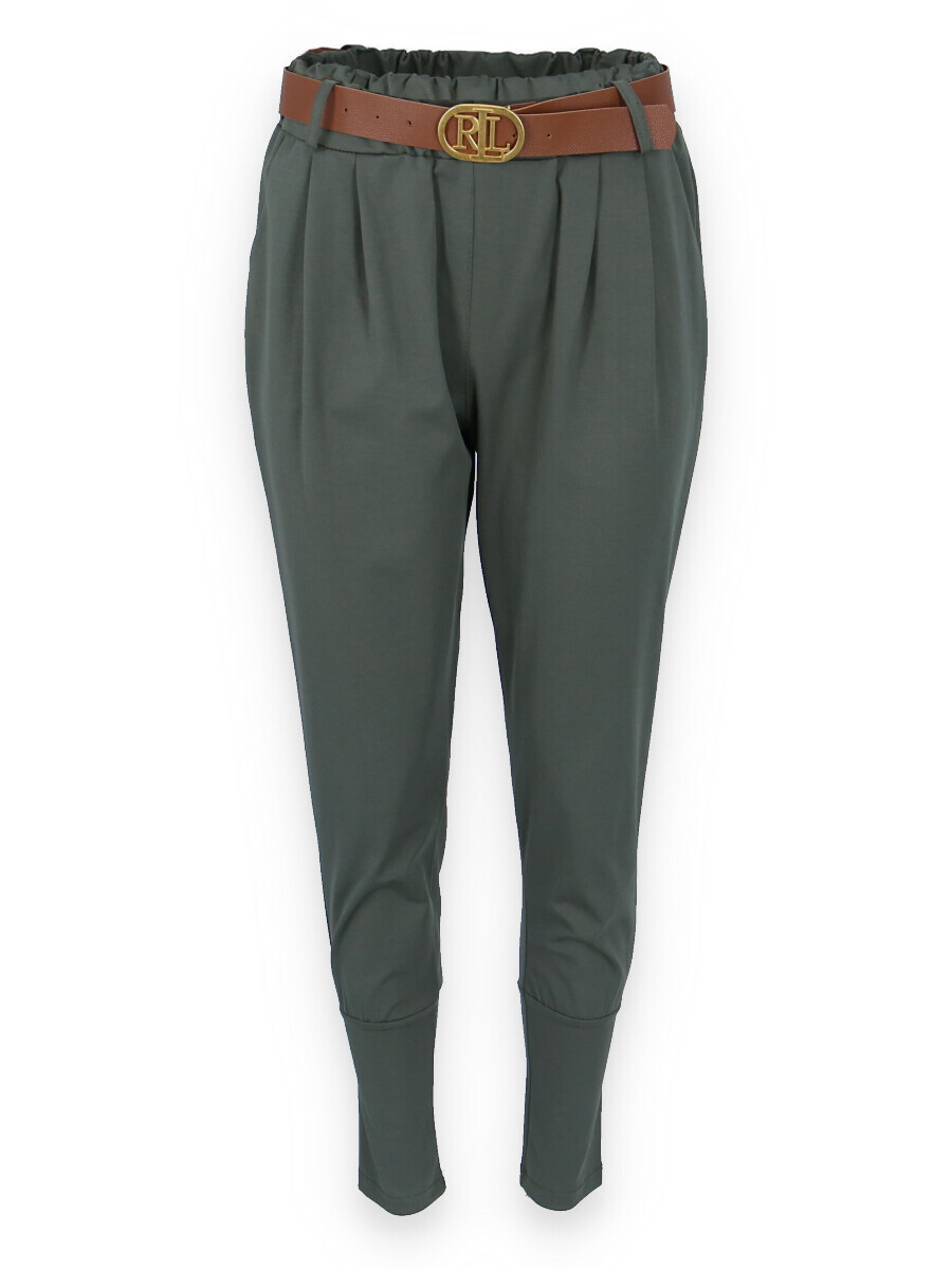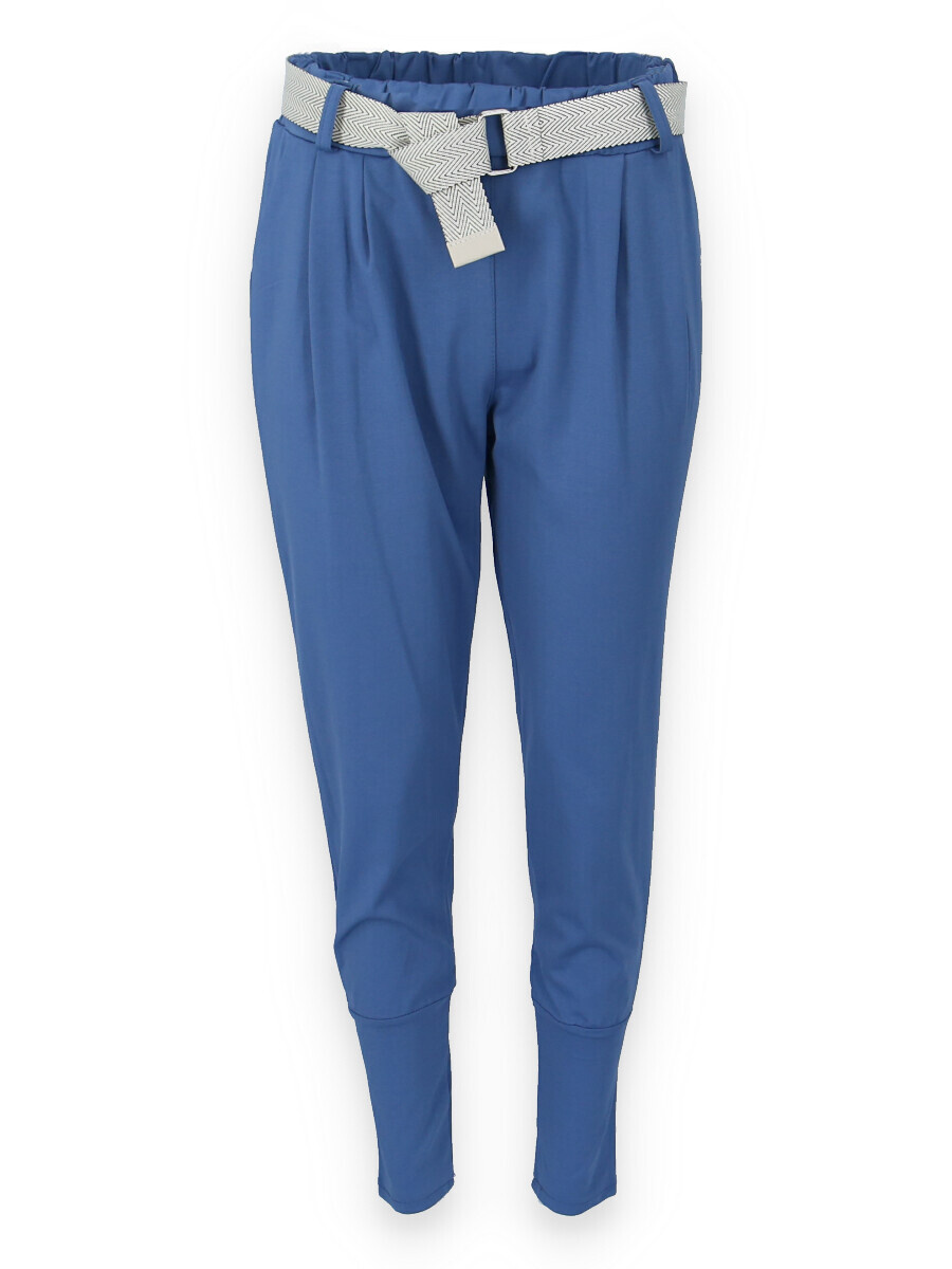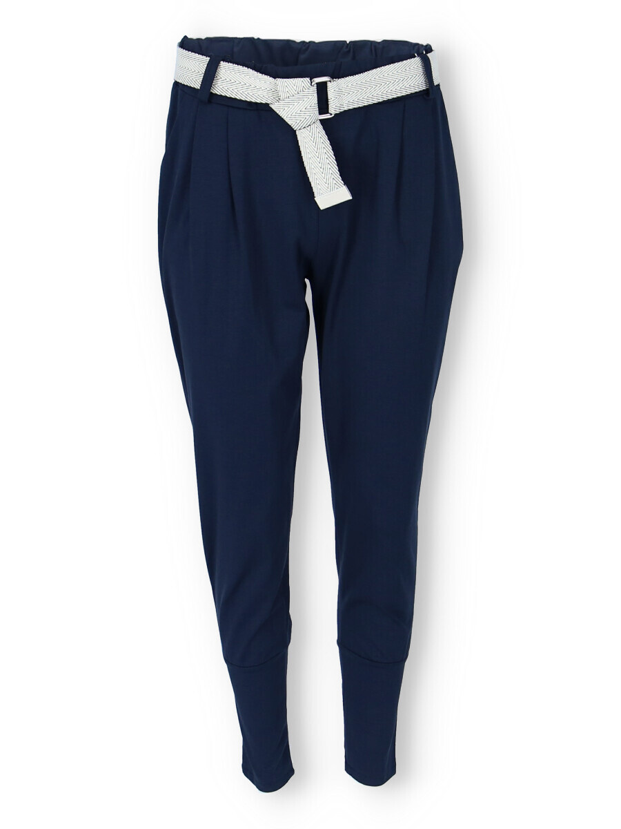 Dámské trendy kalhoty do gumy, doplněny módním páskem. Kalhoty mají ve spodní části zúženou nohavici a všité kapsy.