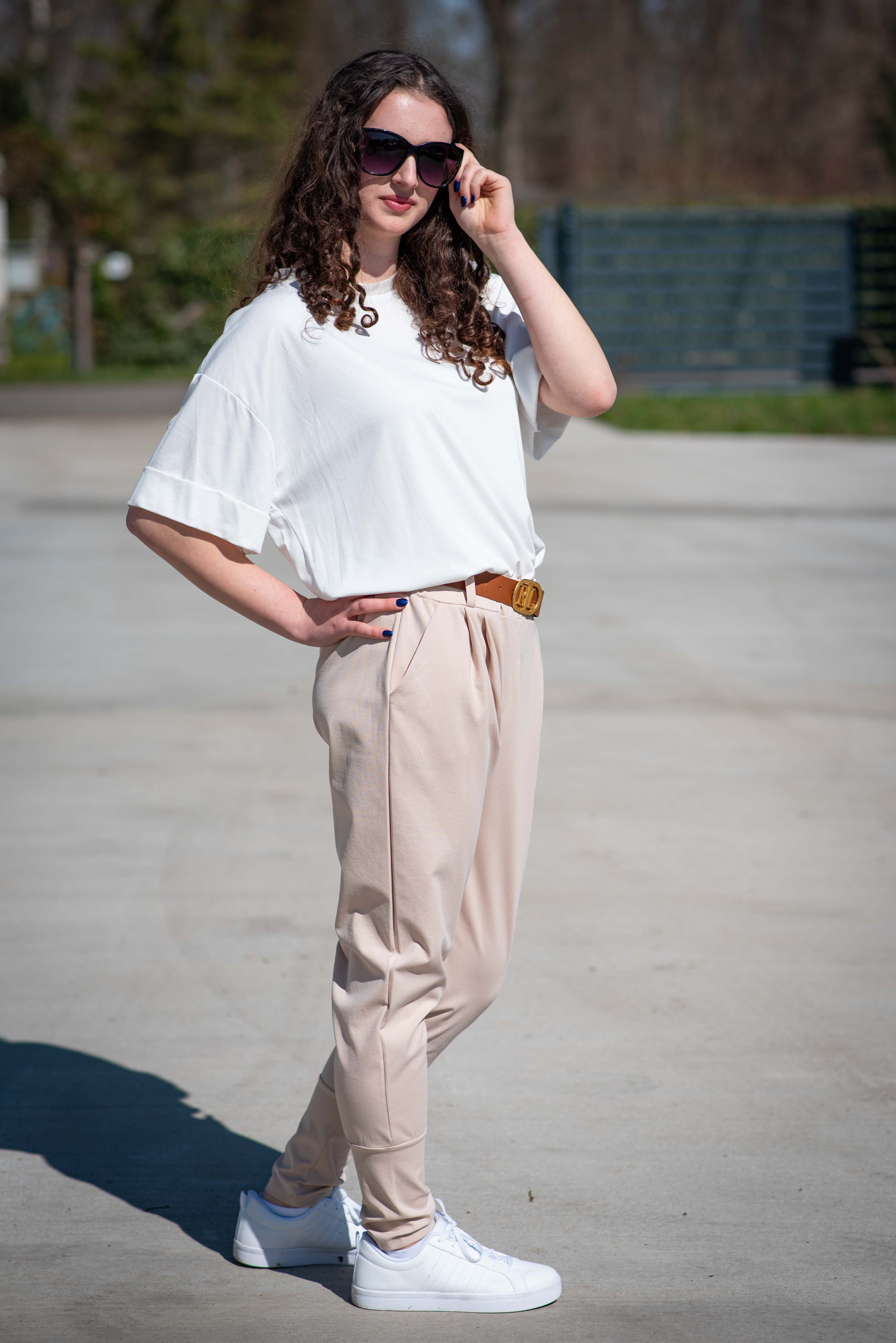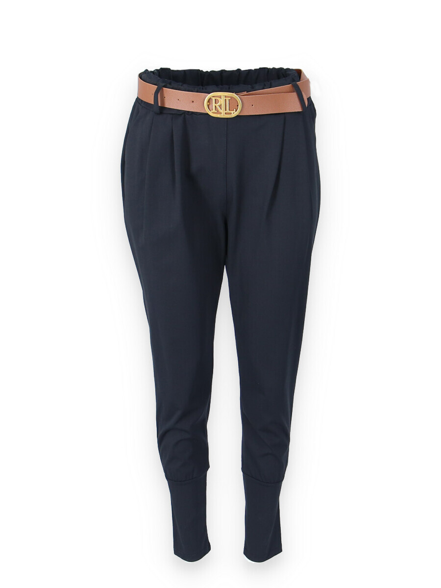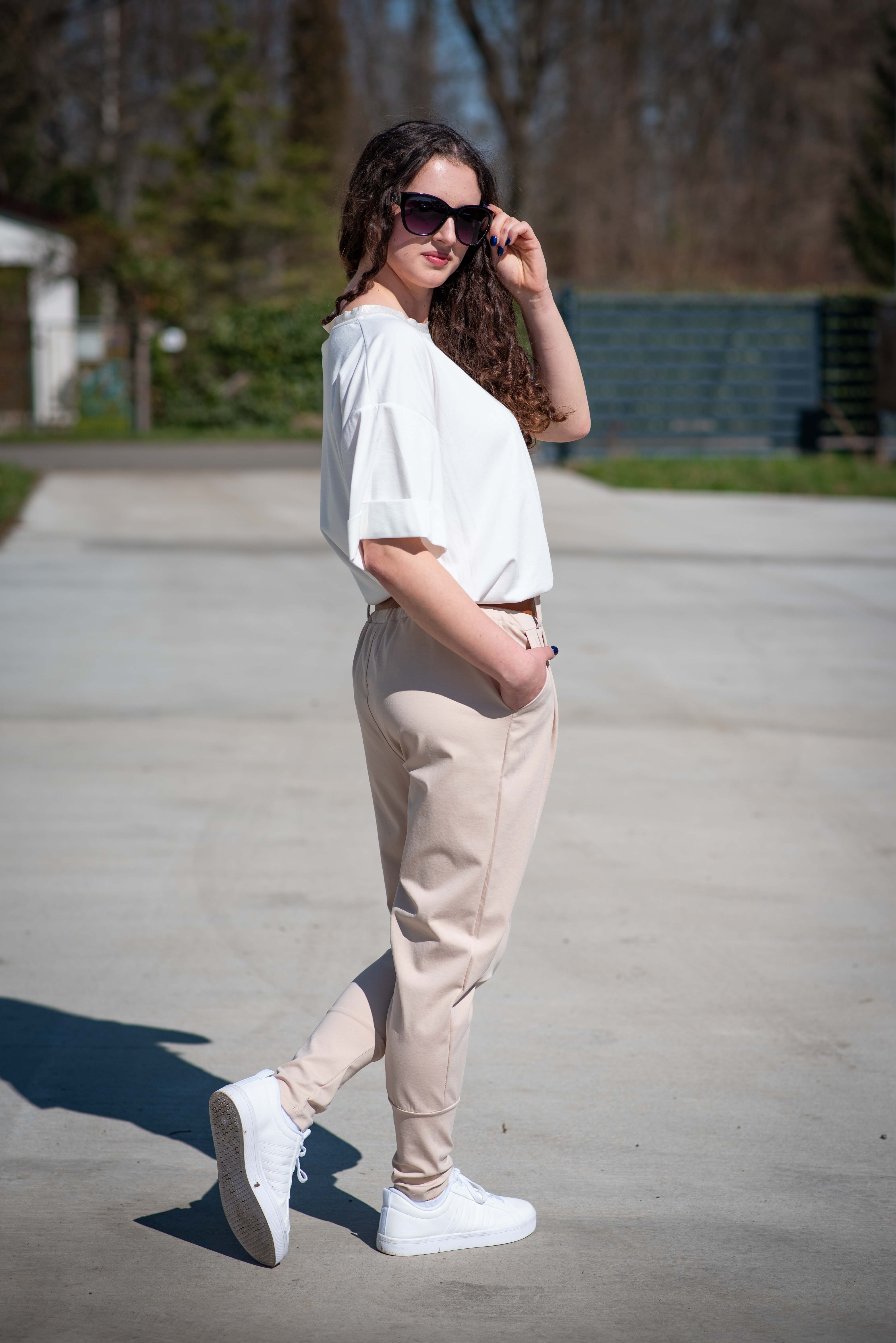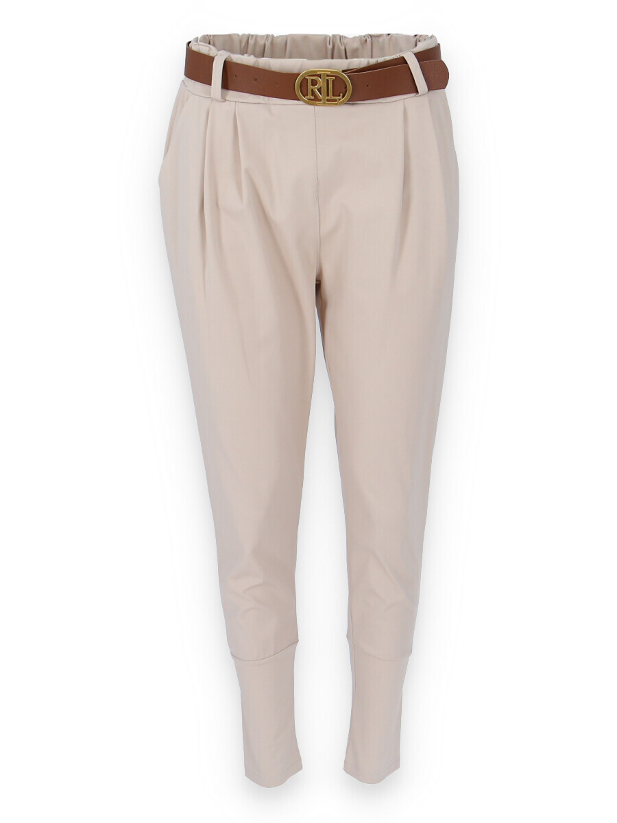 Dámské trendy kalhoty do gumy, doplněny módním páskem. Kalhoty mají ve spodní části zúženou nohavici a všité kapsy.