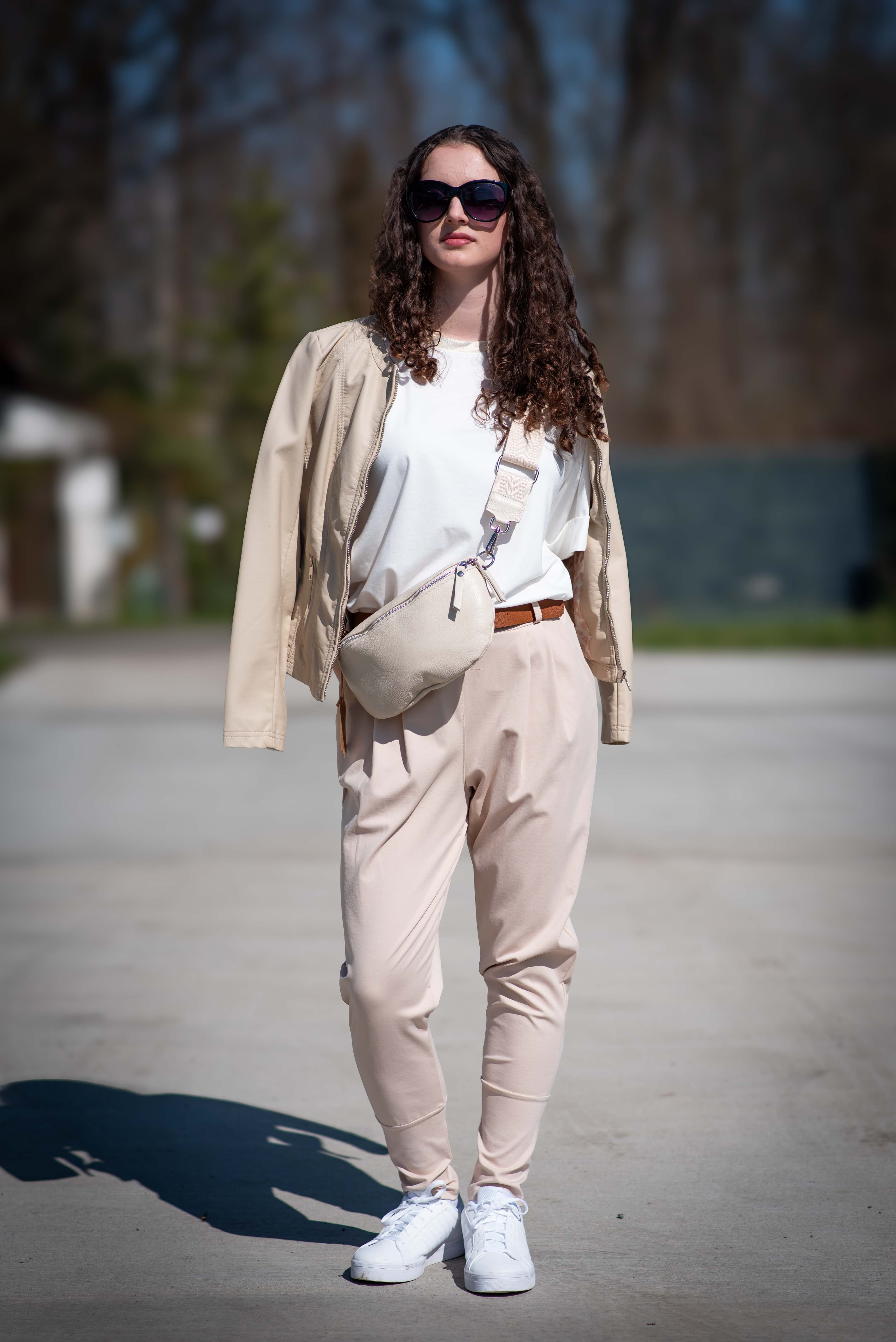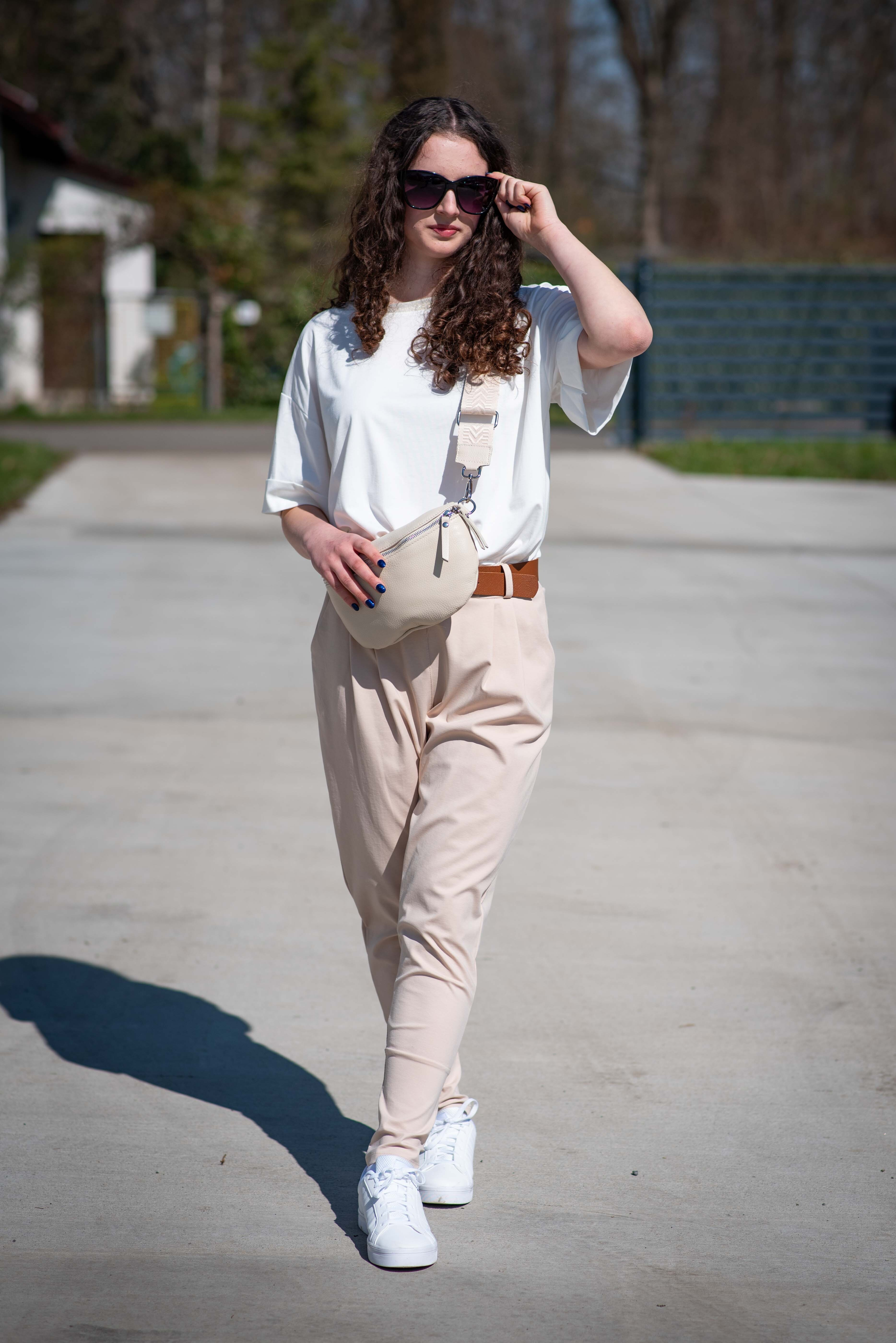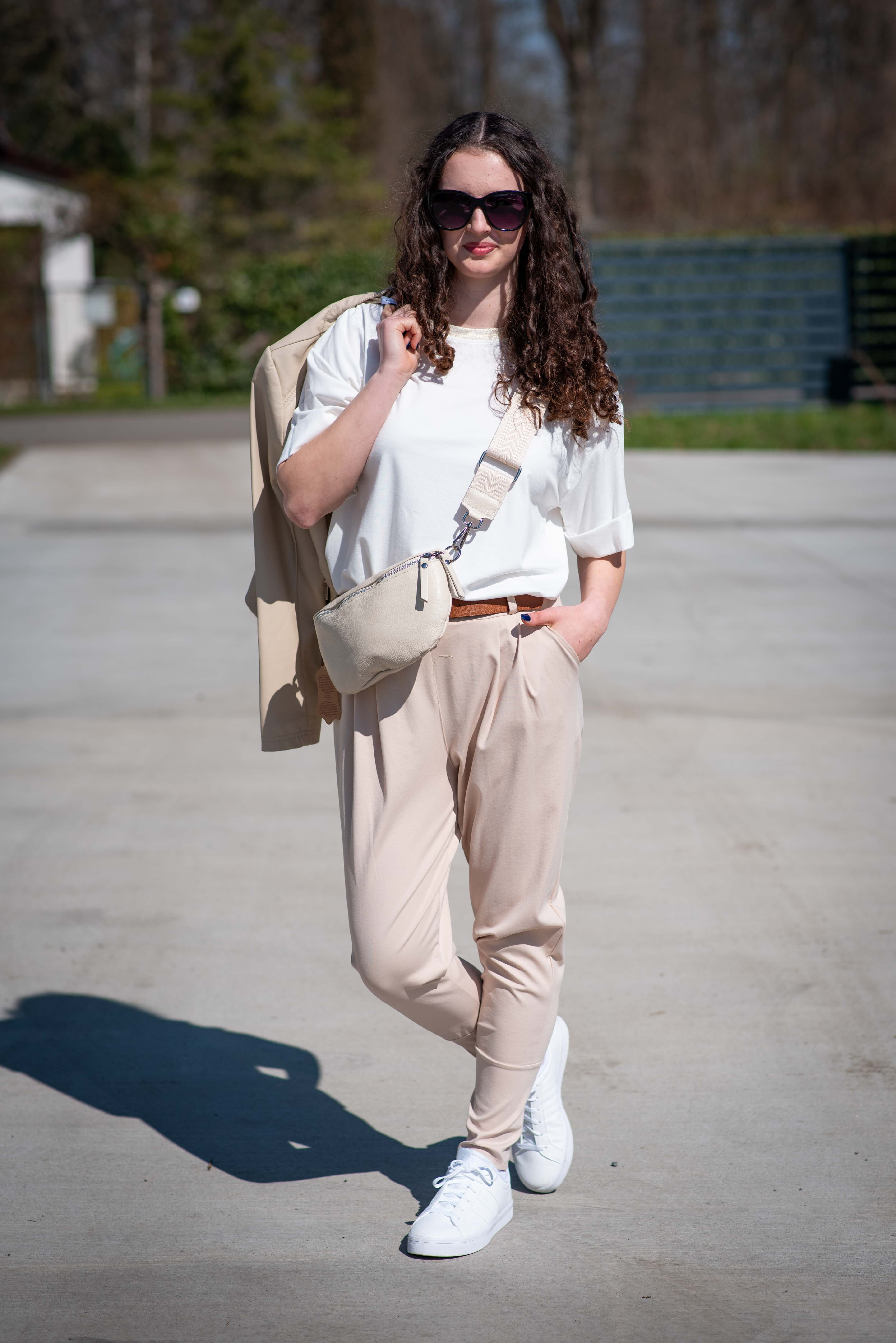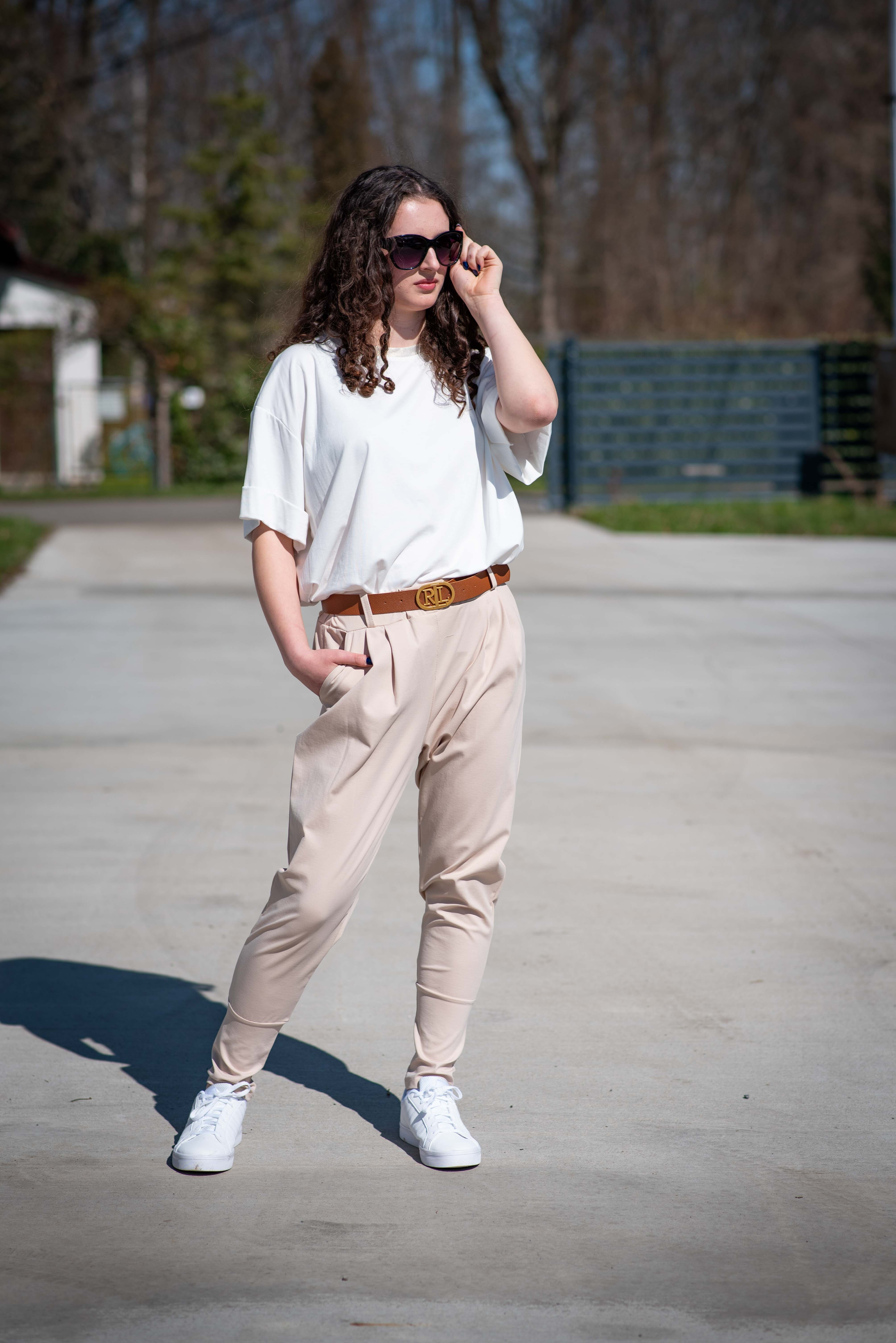 Dámské trendy kalhoty do gumy, doplněny módním páskem. Kalhoty mají ve spodní části zúženou nohavici a všité kapsy.