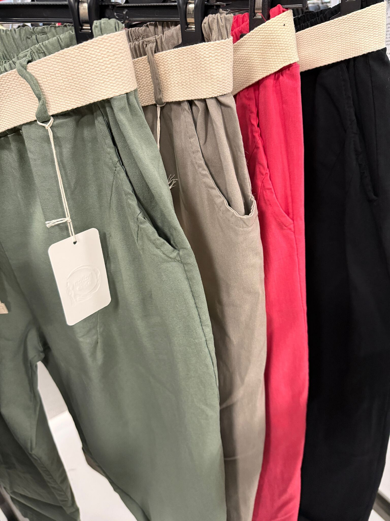 Trendy kalhoty v pase do gumy, doplněny stylovým páskem. Kalhoty mají po stranách všité kapsy.