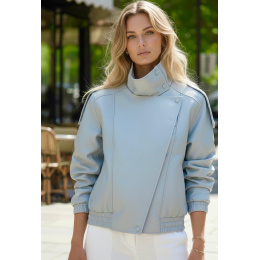 Trendy koženková krátká bunda se stojáčkem. Bunda má zapínání na druky a všité kapsy po stranách.