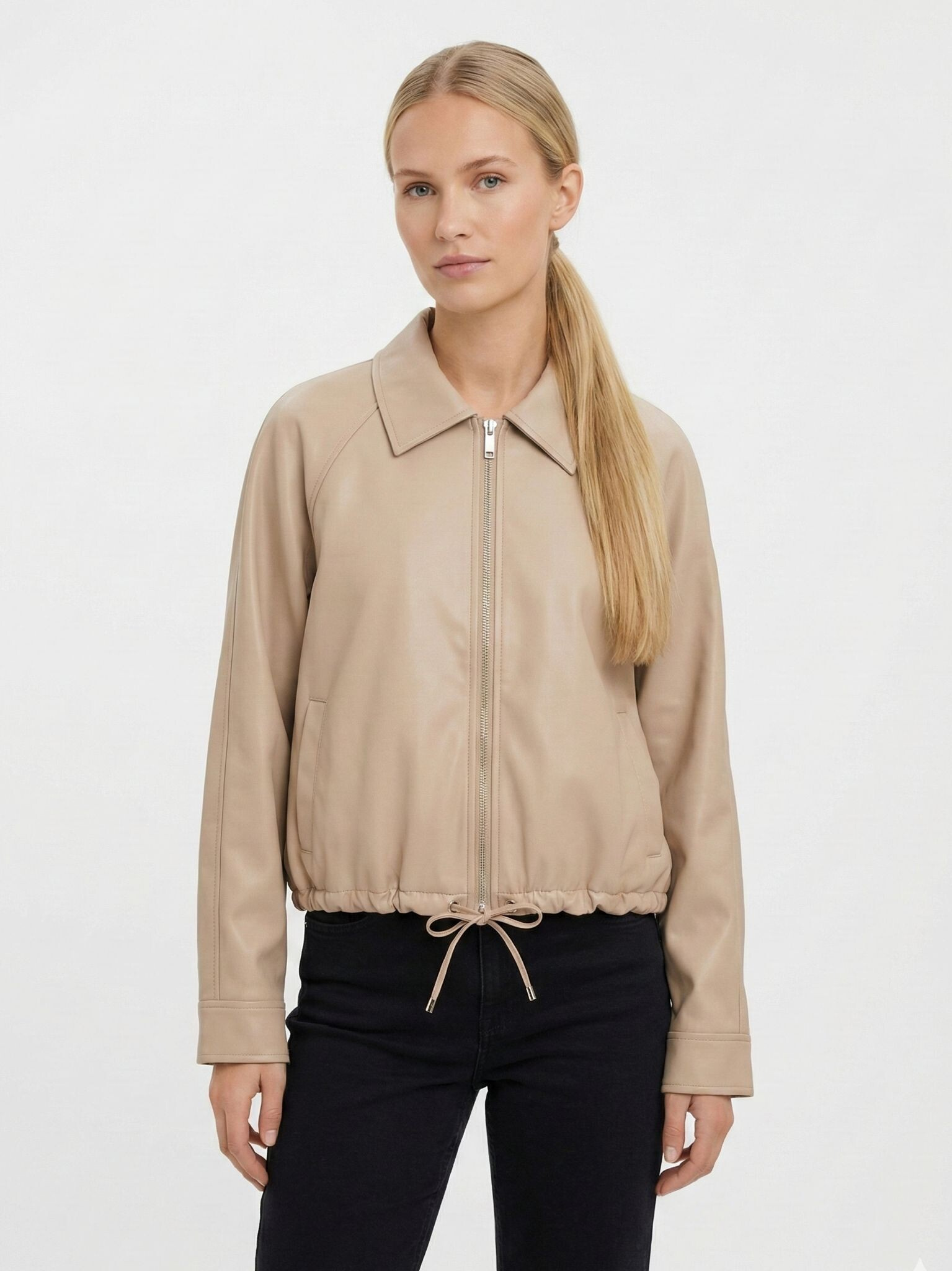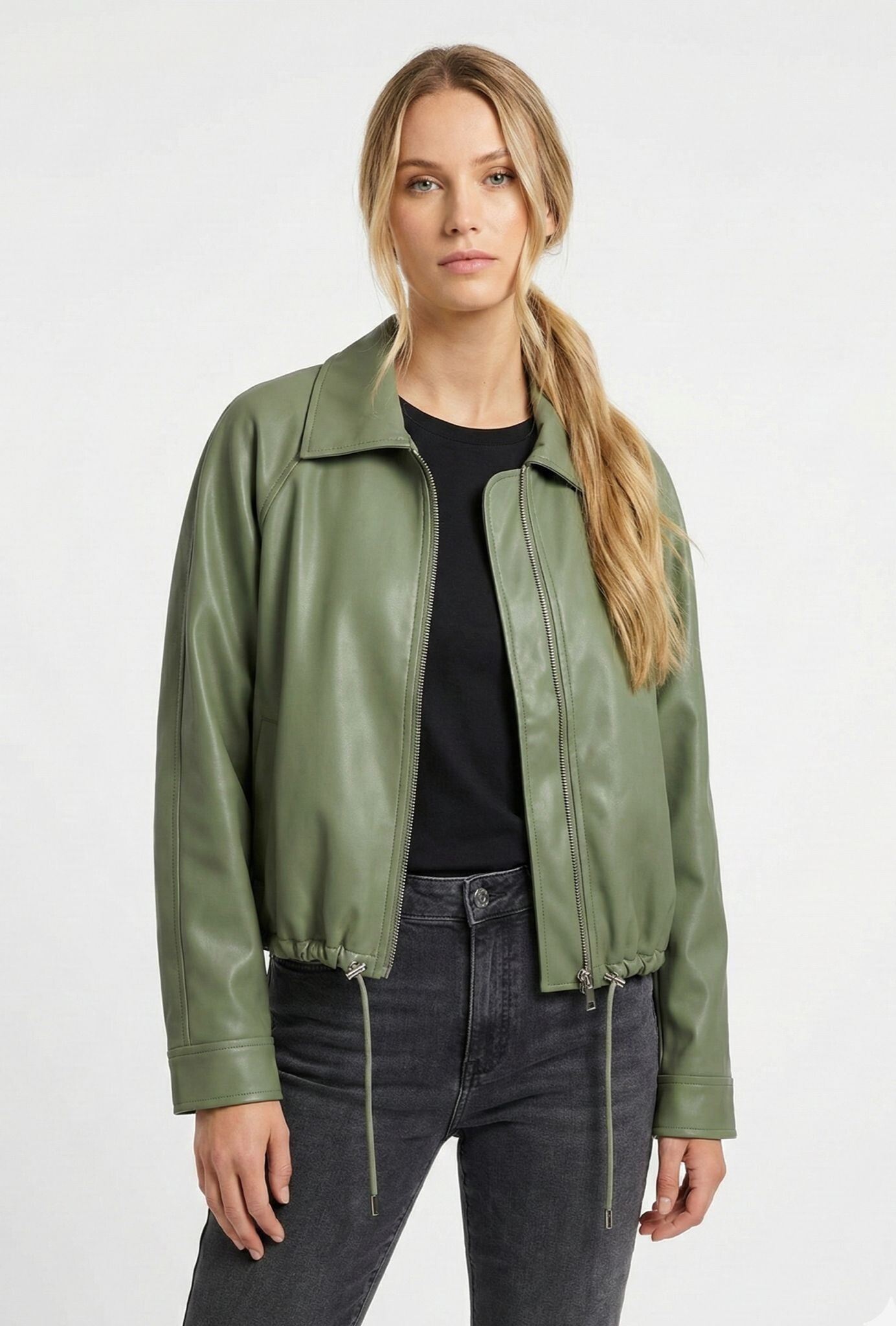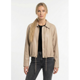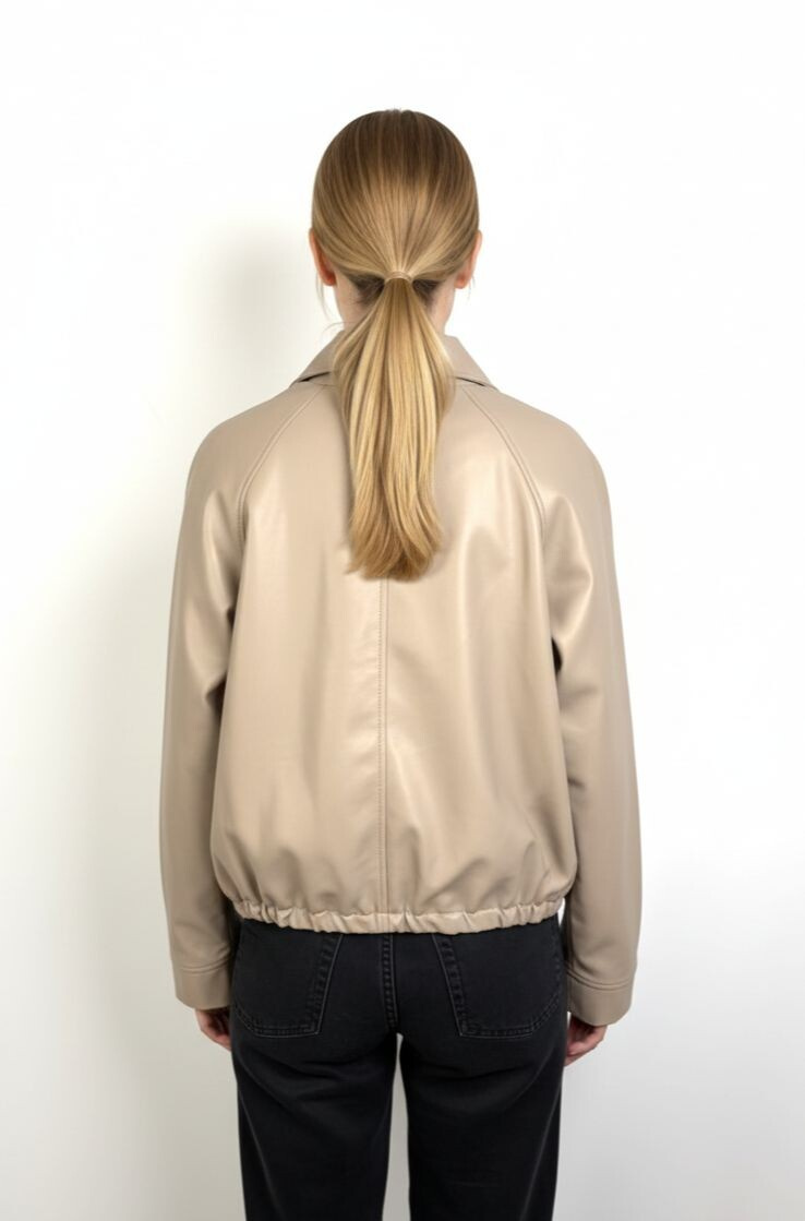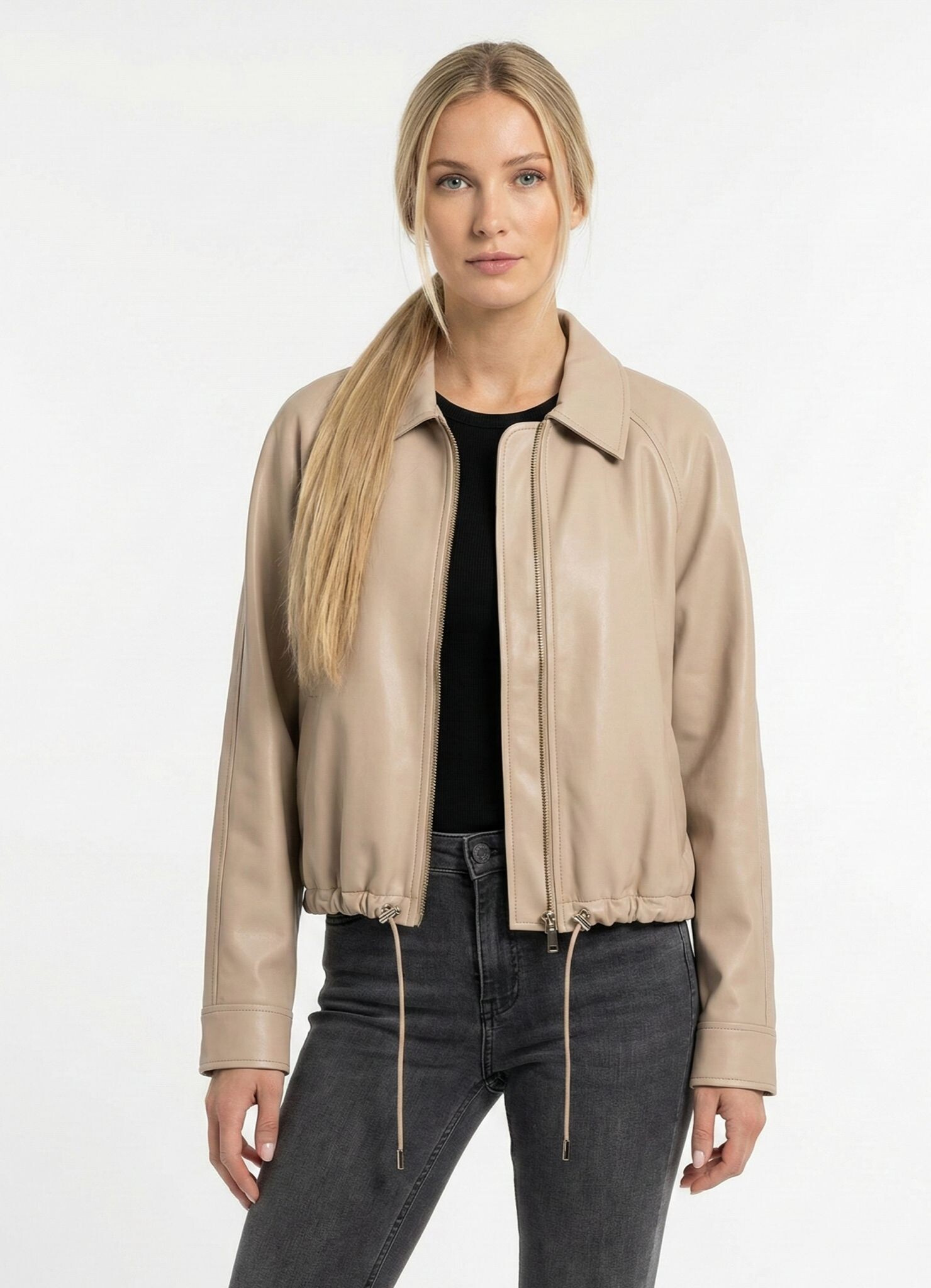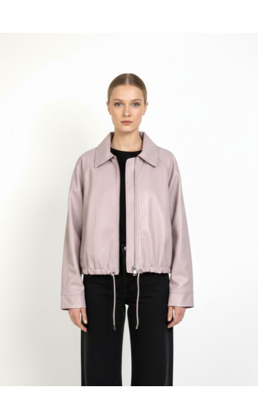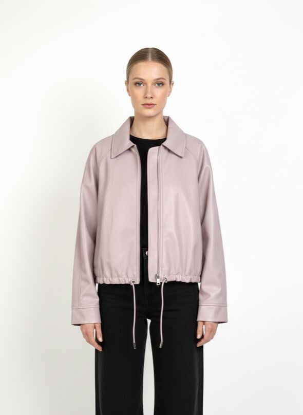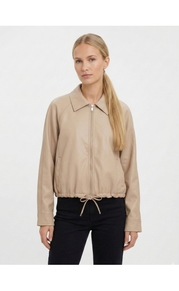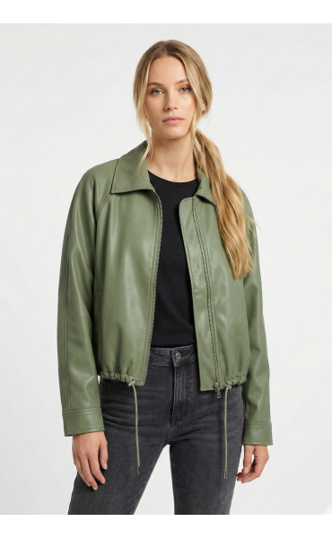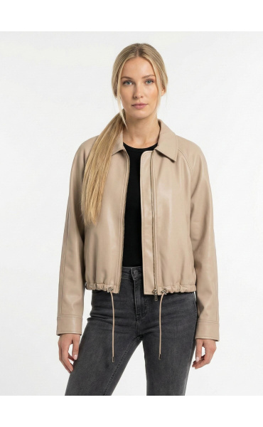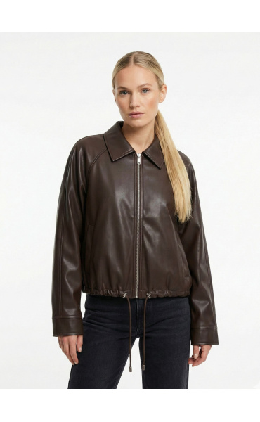 Trendy koženková krátká bunda se zapínáním na zip. Bunda má límec a ve spodní části regulaci s možnosti stažení na šňůrku.