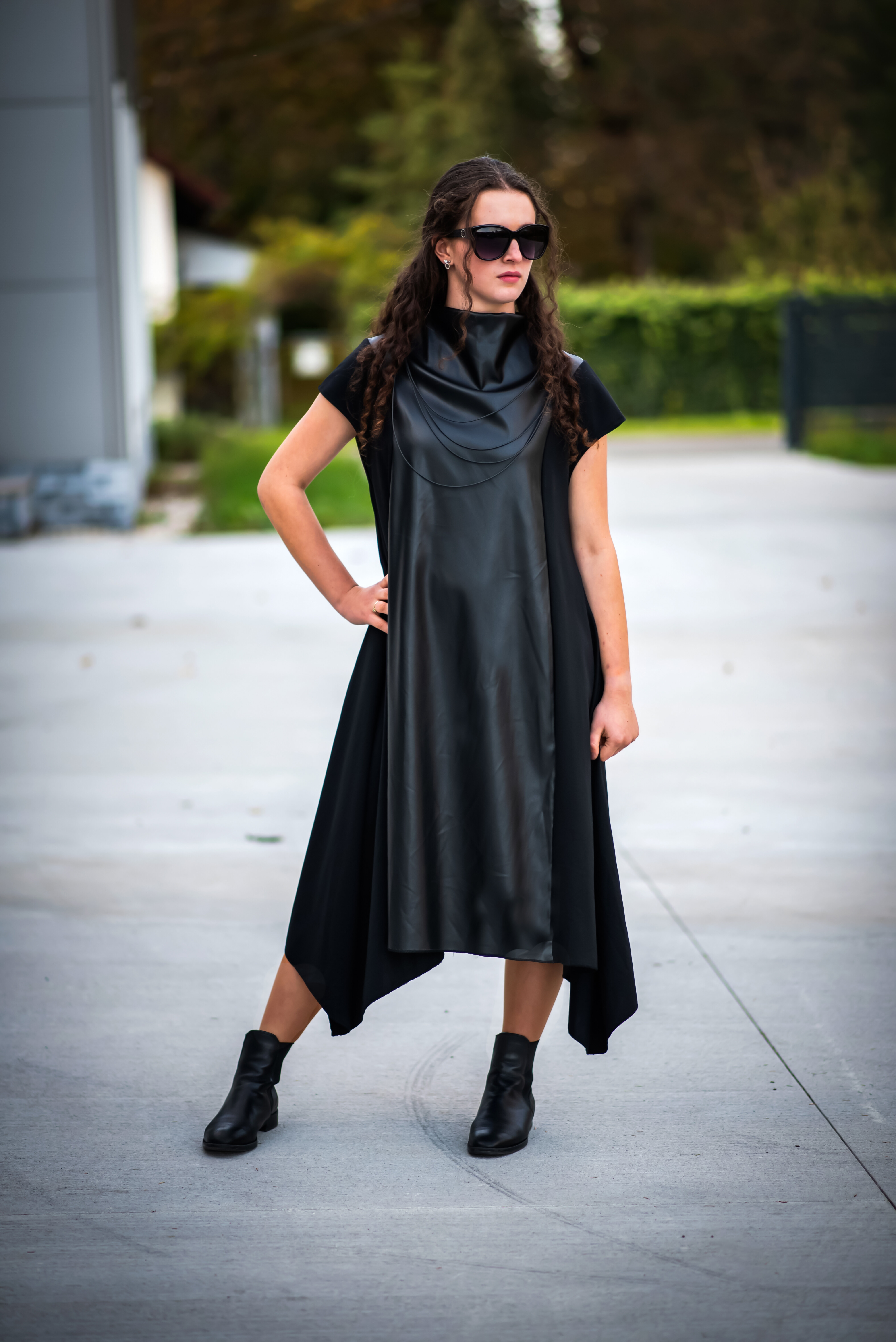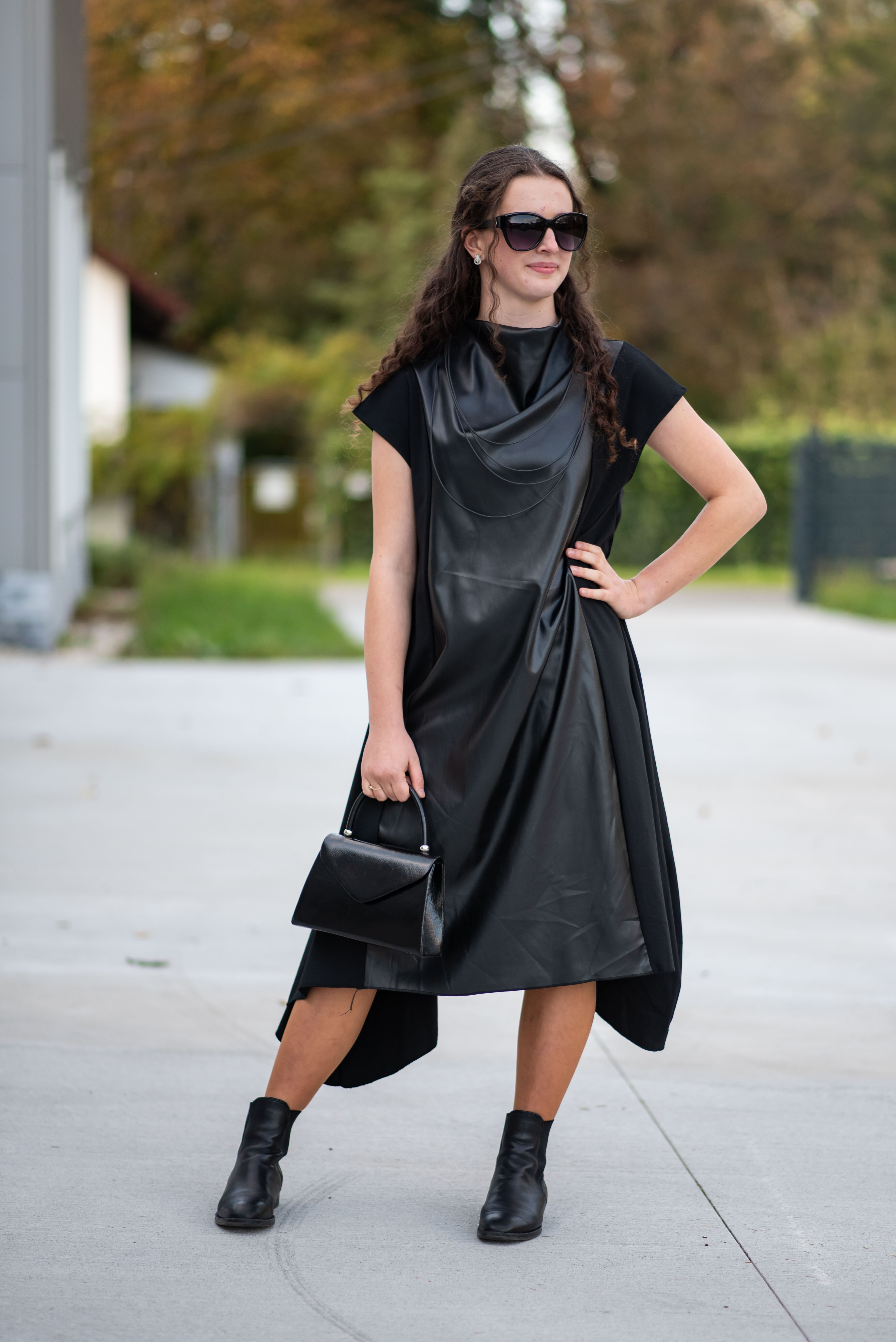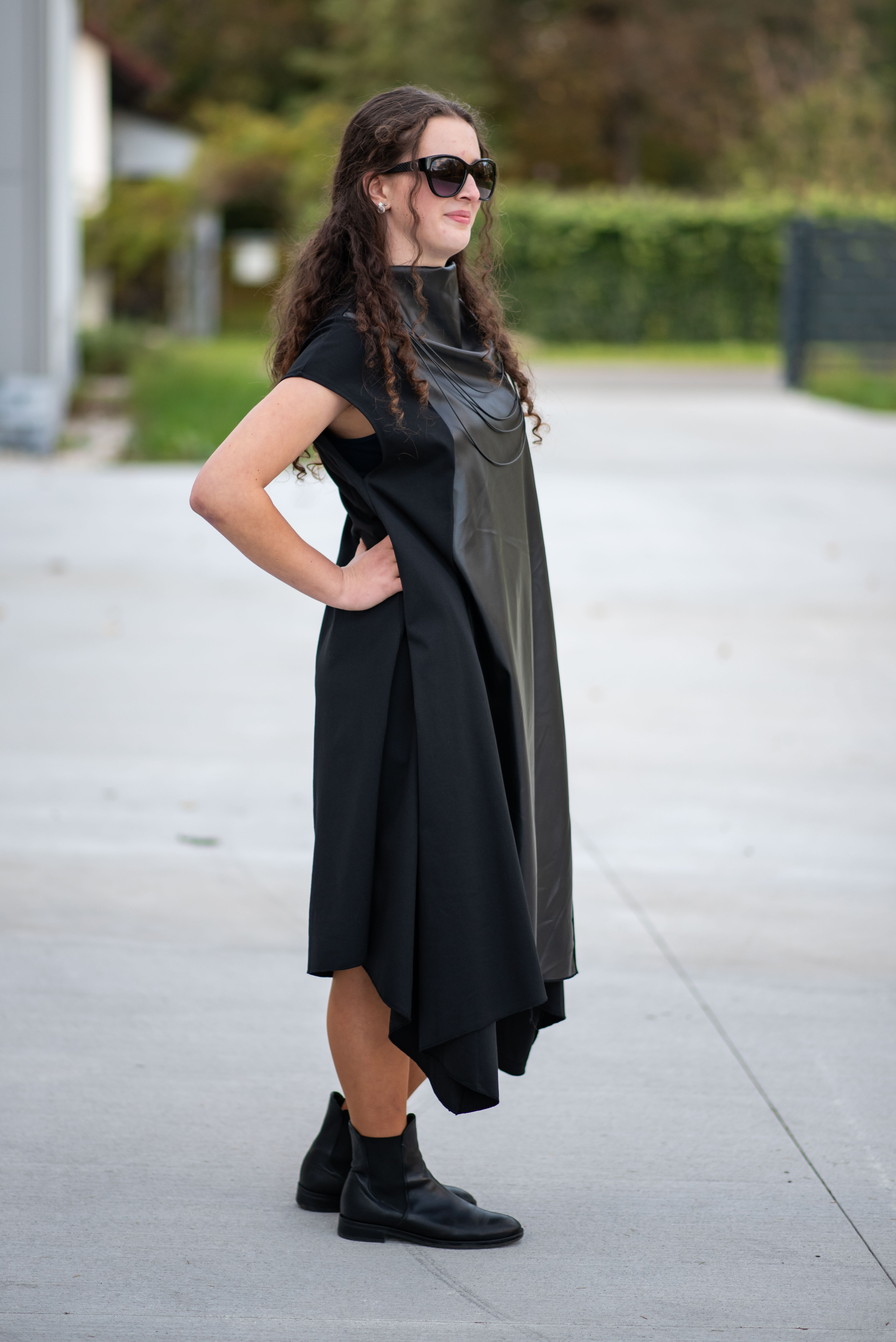 Trendy šaty s aplikací koženky s krátkým rukávem. Šaty/šatovka je ve spodní části po stranách do cípu.