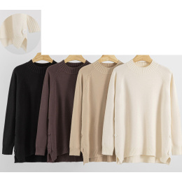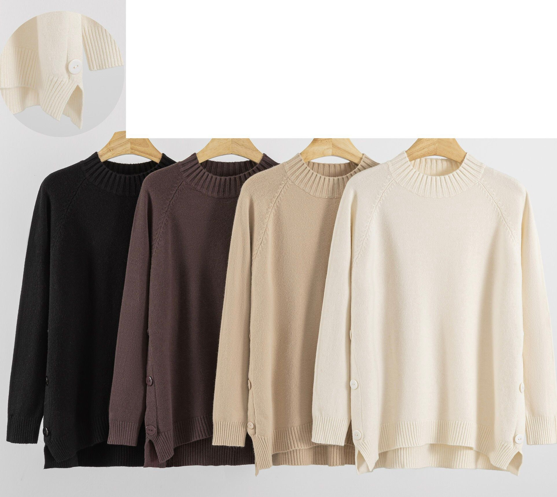 Trendy svetřík s knoflíky a rozparky po stranách. Svetr je z příjemného úpletového materiálu, s mírným stojáčkem z žebrovaného úpletu. Rovněž rukávy a spodní lem jsou z žebrovaného úpletu.