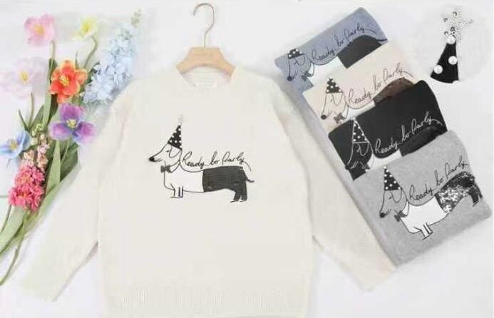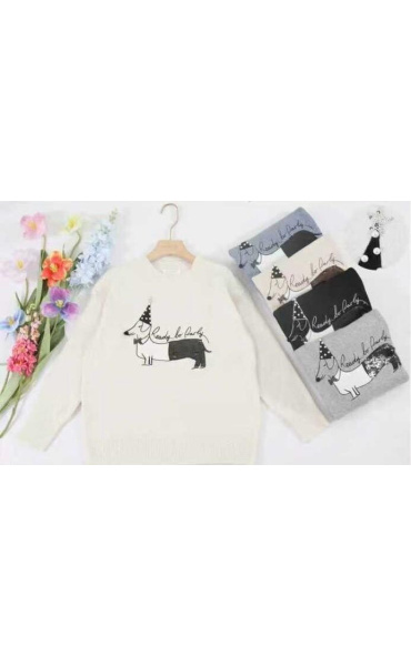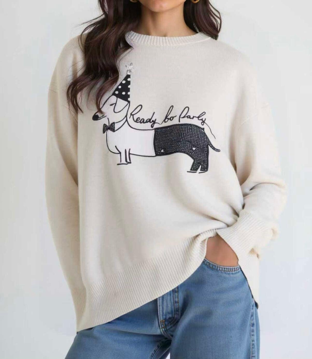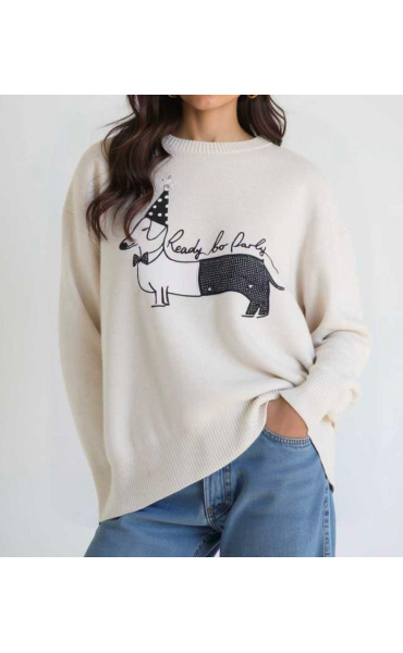Trendy svetr s potiskem jezevčíka s drobnými kamínky.