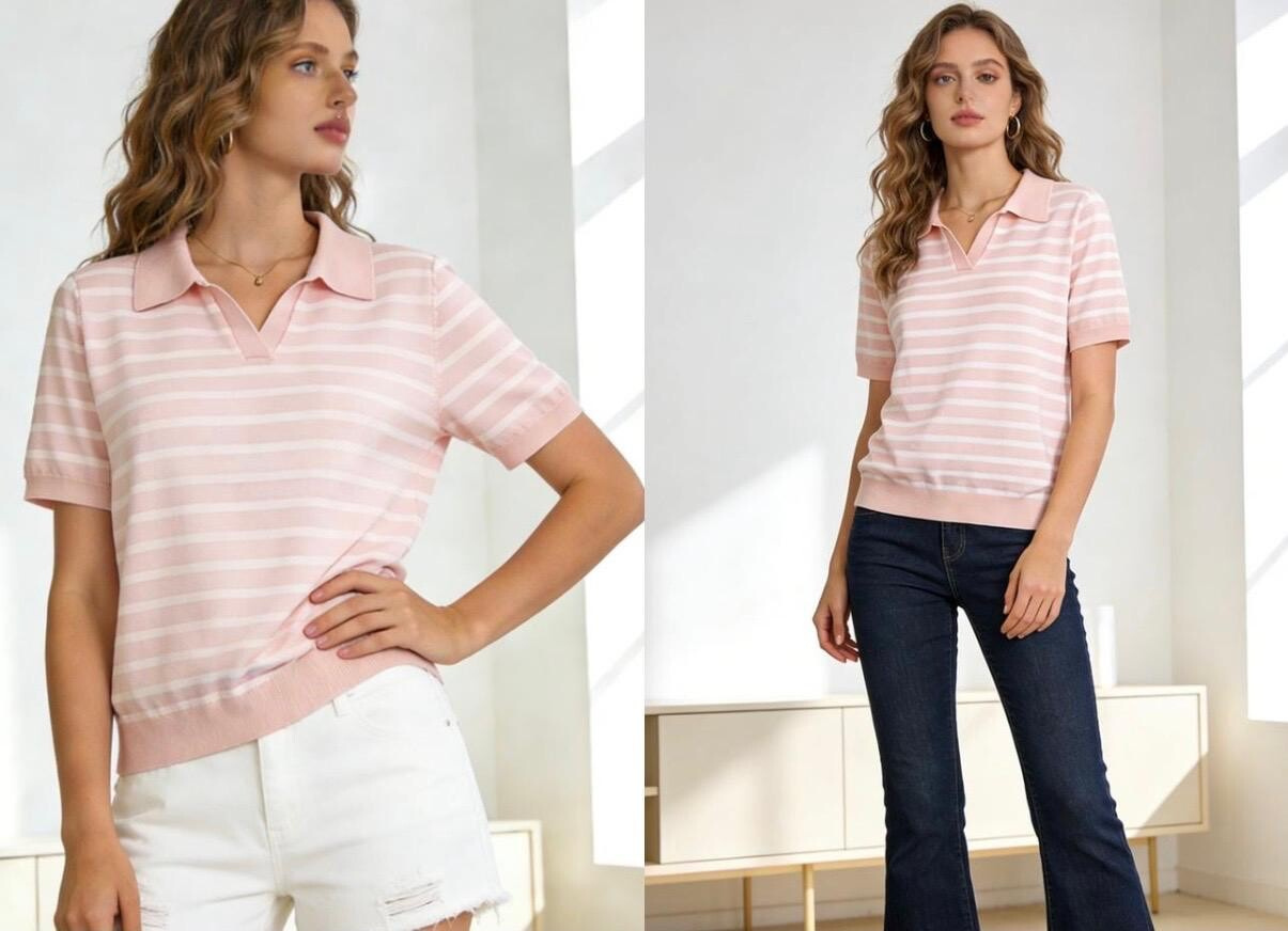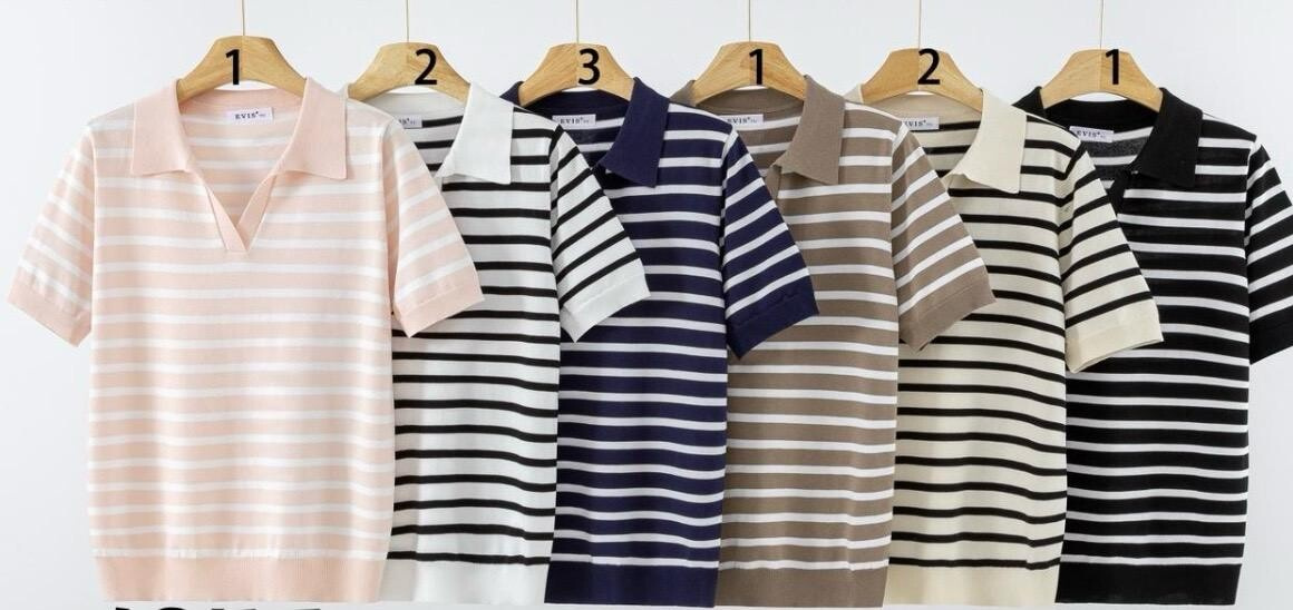 Trendy pruhovaný svetřík s límečkem a krátkým rukávem.