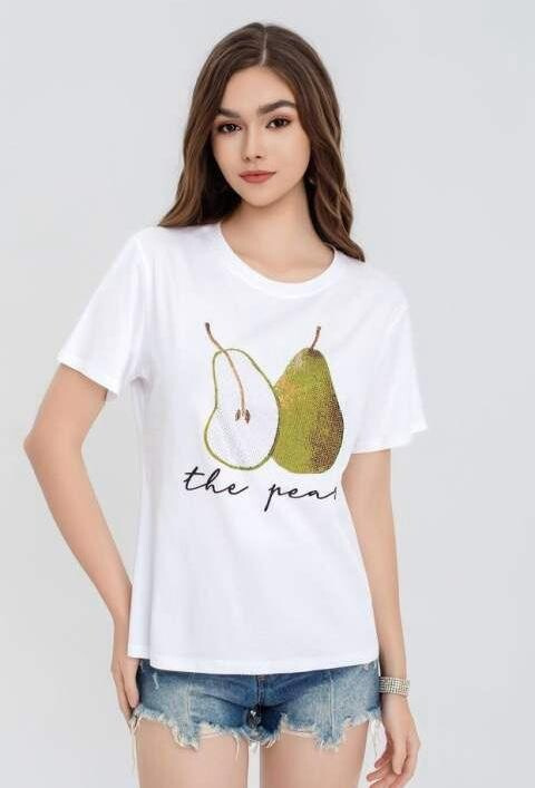 Dámské tričko s potiskem hrušek. Triko má krátký rukáv a kulatý výstřih.