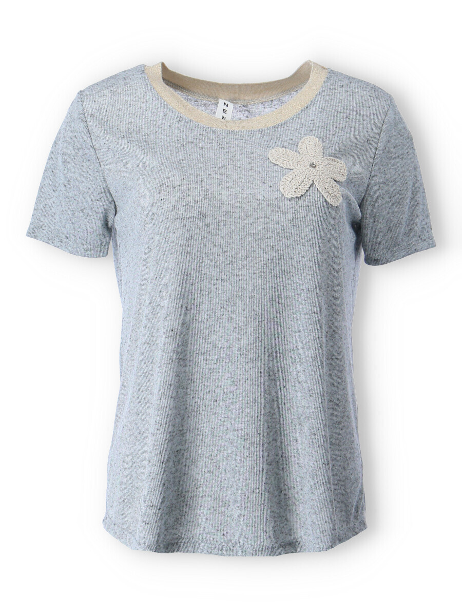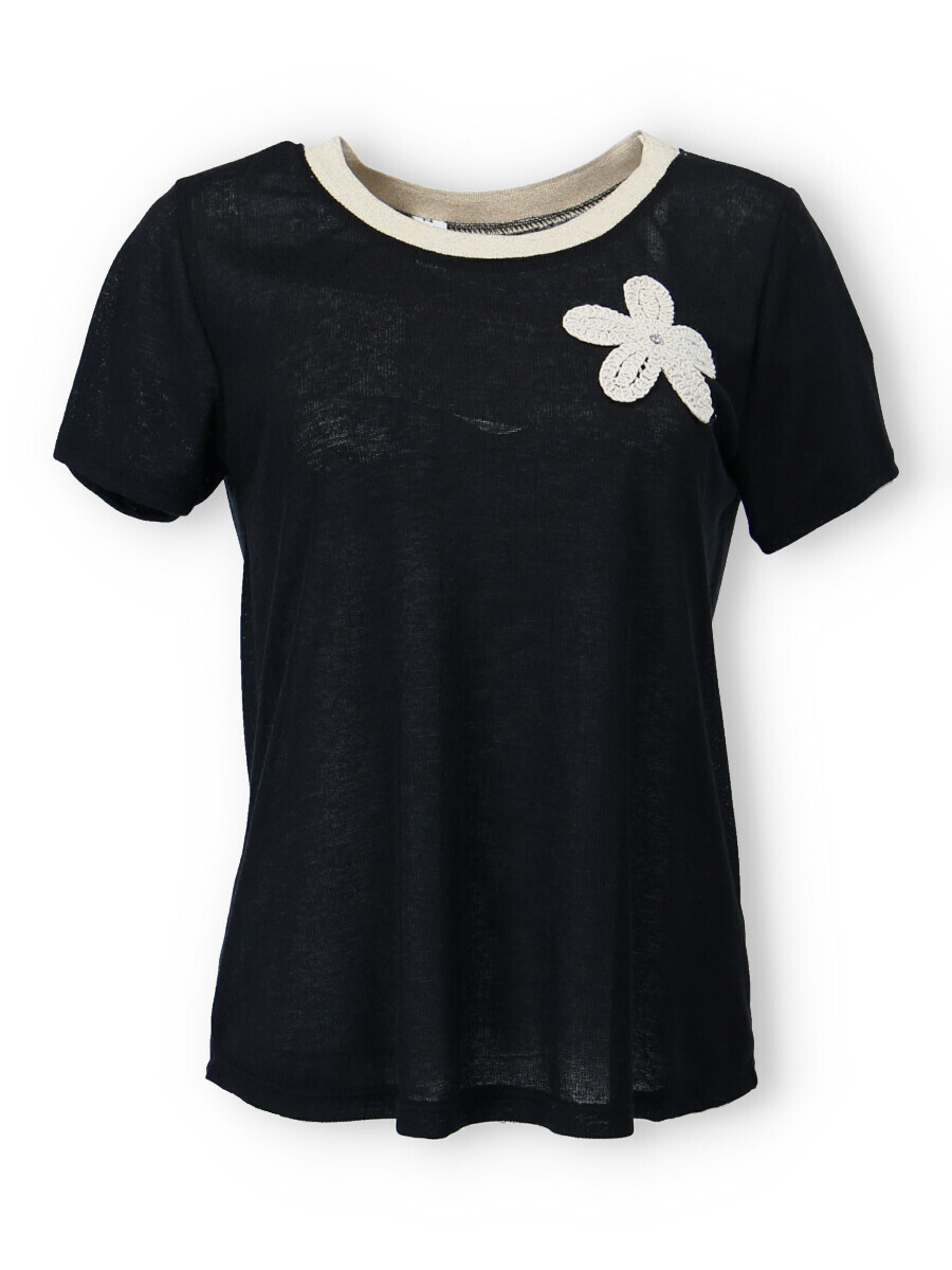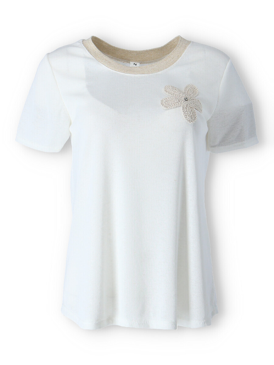 Dámské trendy triko s výšivkou květu na přední straně a krátkým rukávem. Triko je z žebrovaného materiálu, má lurexový lem, kulatý výstřih. Vyrobeno v Itálii