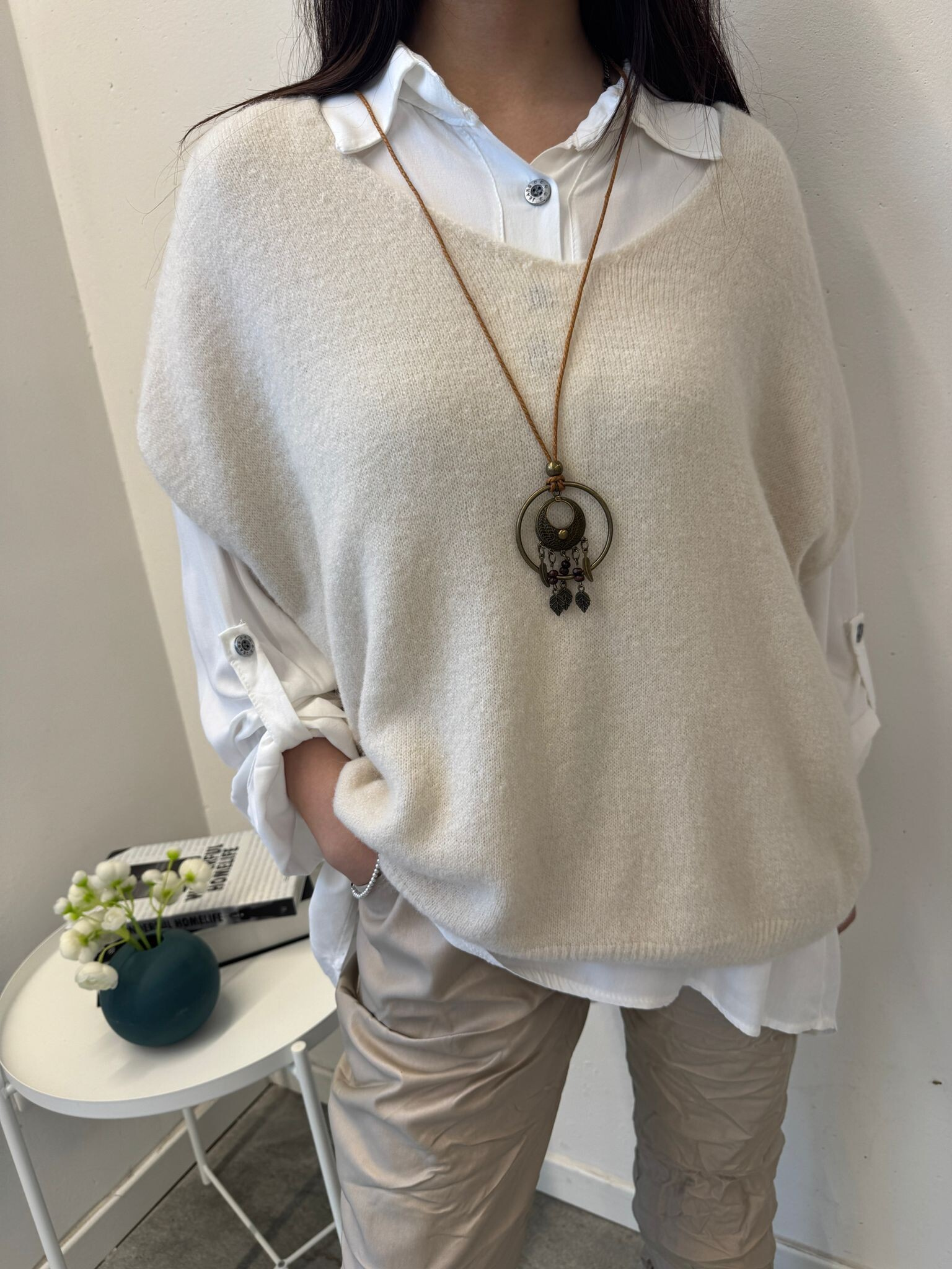 Trendy vlněná vesta volnějšího střihu. Vhodné jako vrchní díl kombinovaný s košilí. Vesta má lehce spadené rukávy a véčkový výstřih.