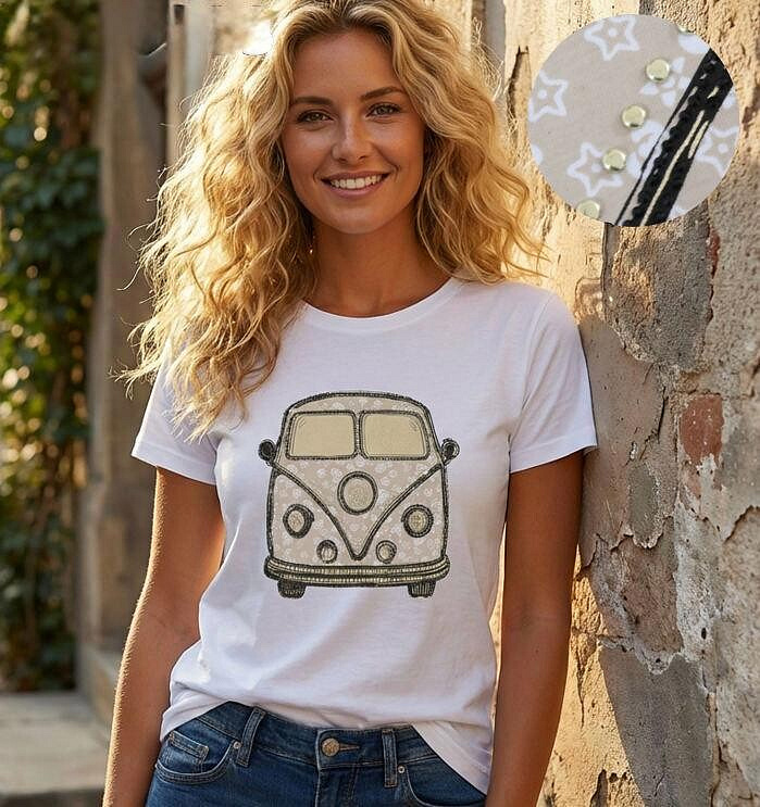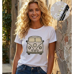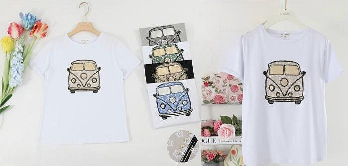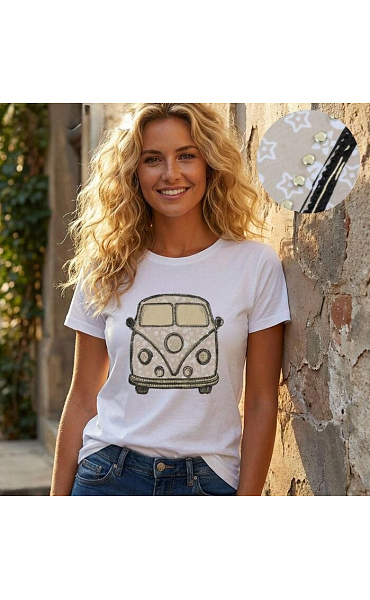 Módní bavlněné triko s potiskem autobusu. Triko má krátký rukáv a kulatý výstřih.