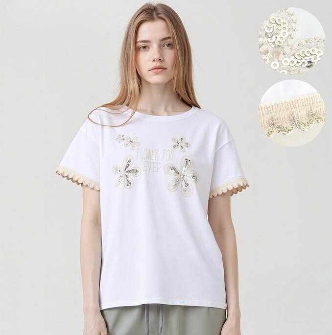 Módní bavlněné triko v BOHO stylu s vyšívanými květy a ozdobným zakončením na rukávech.