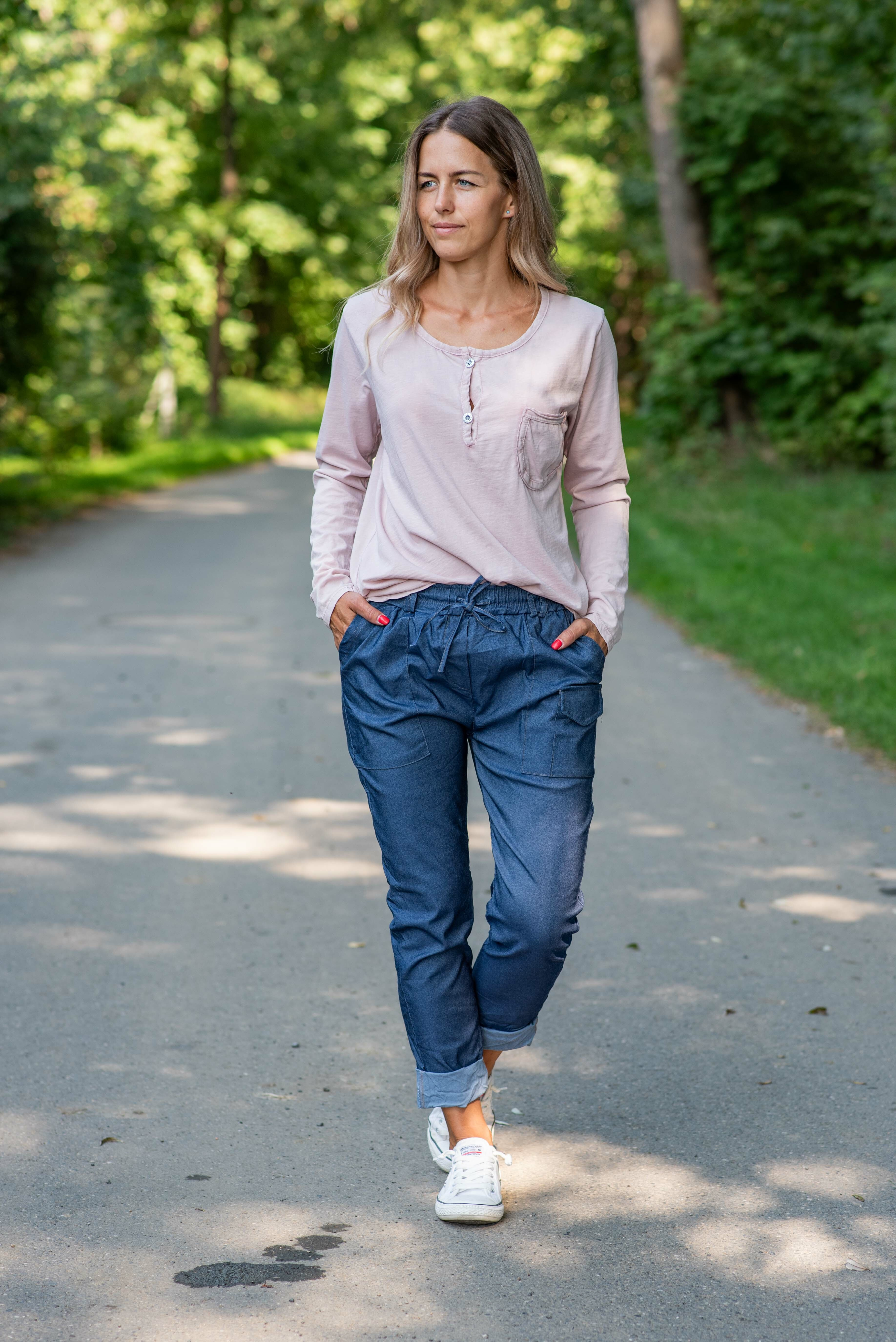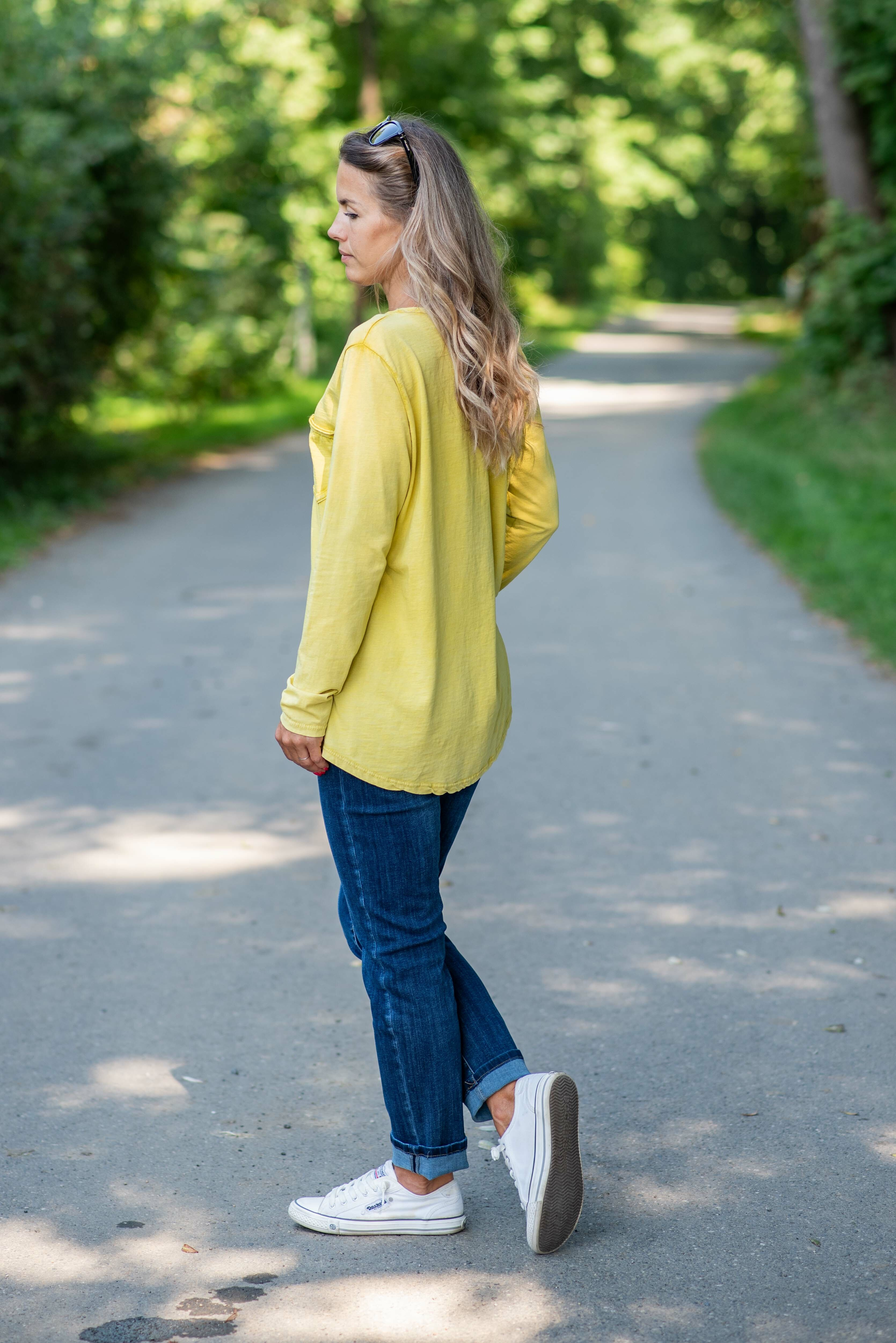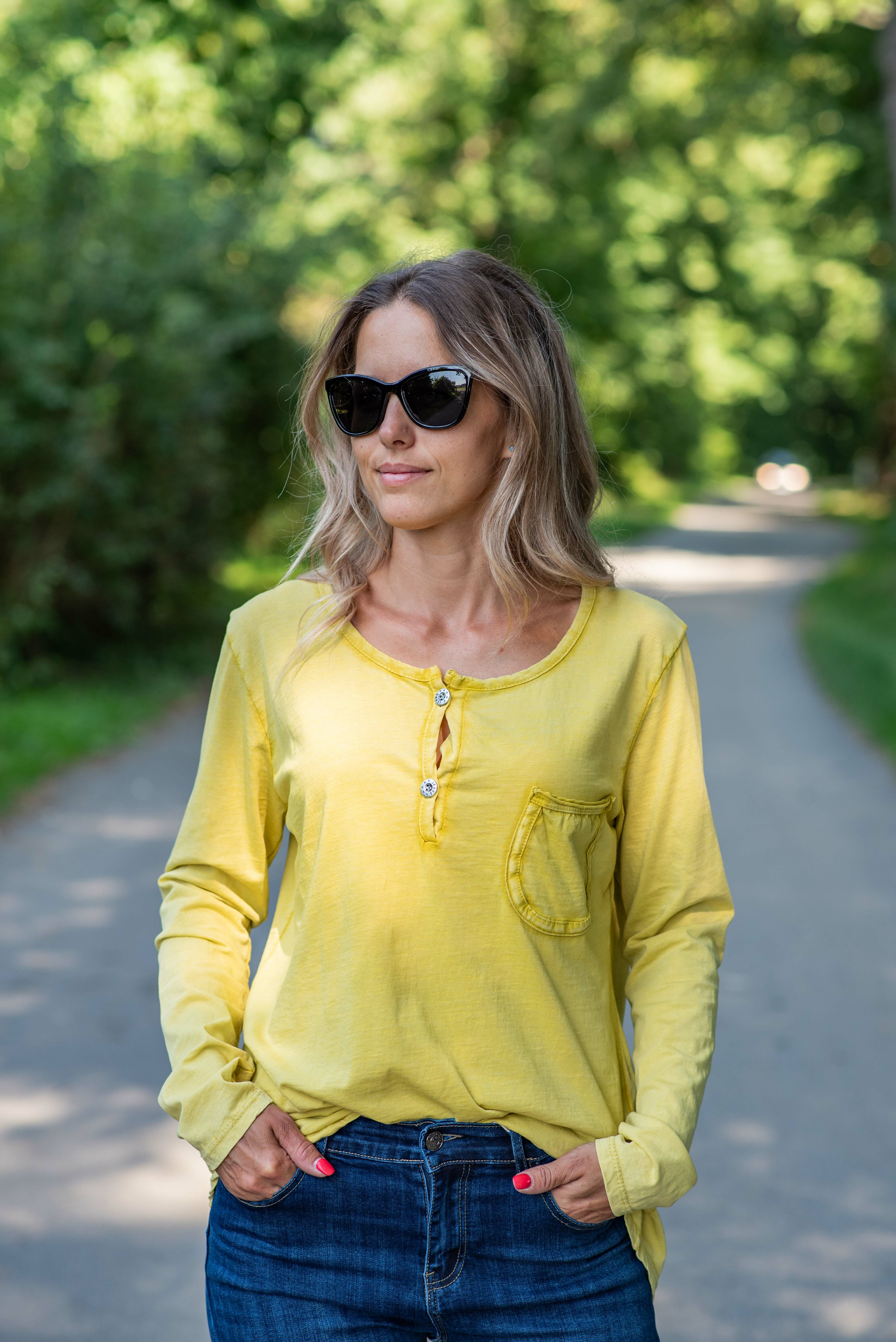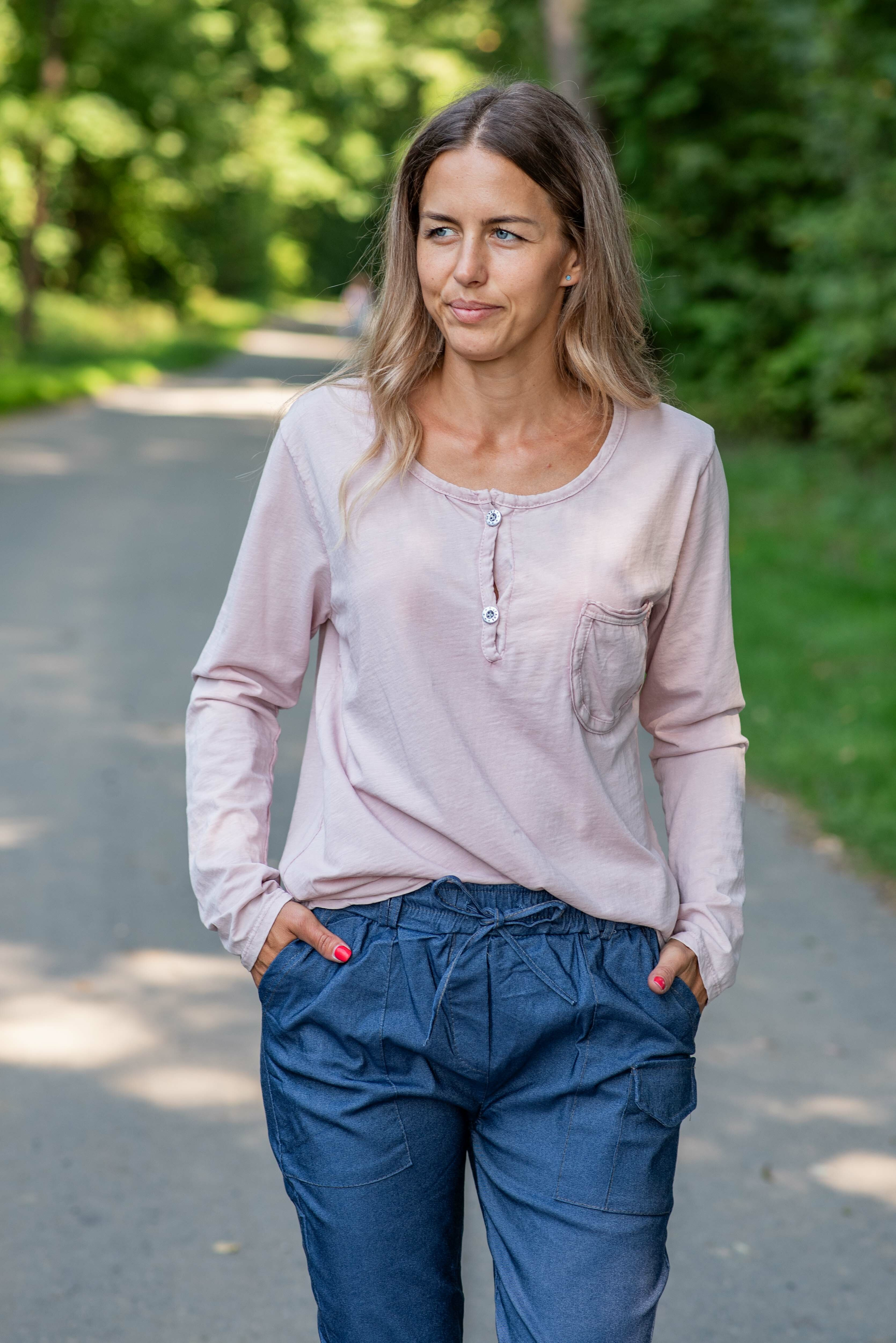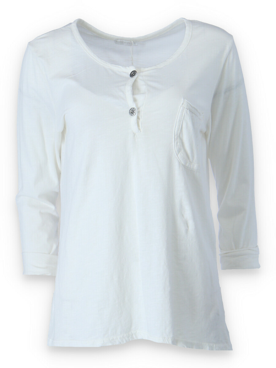 Bavlněné triko s dlouhým rukávem, s kulatým výstřihem a zapínáním u krku na knoflíček.
