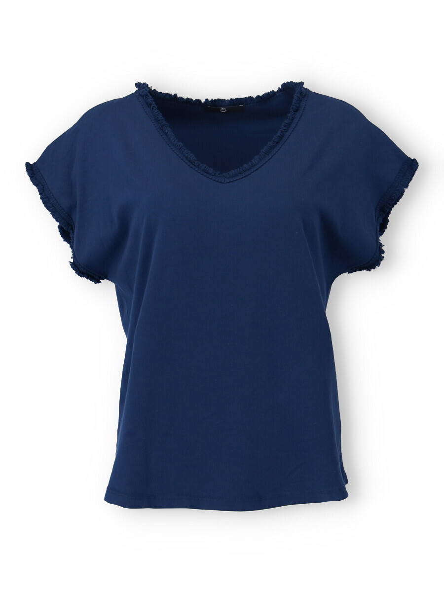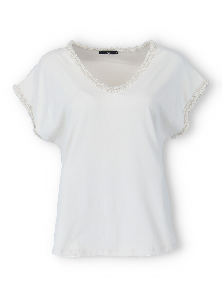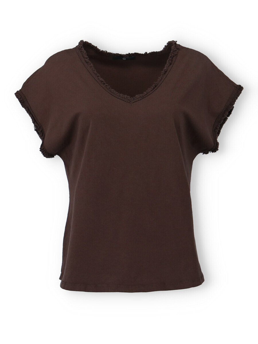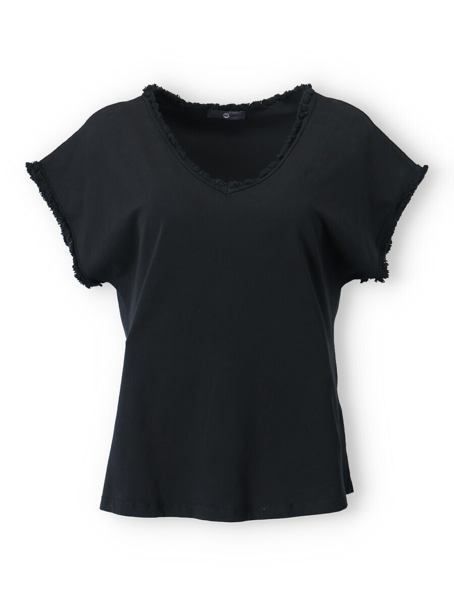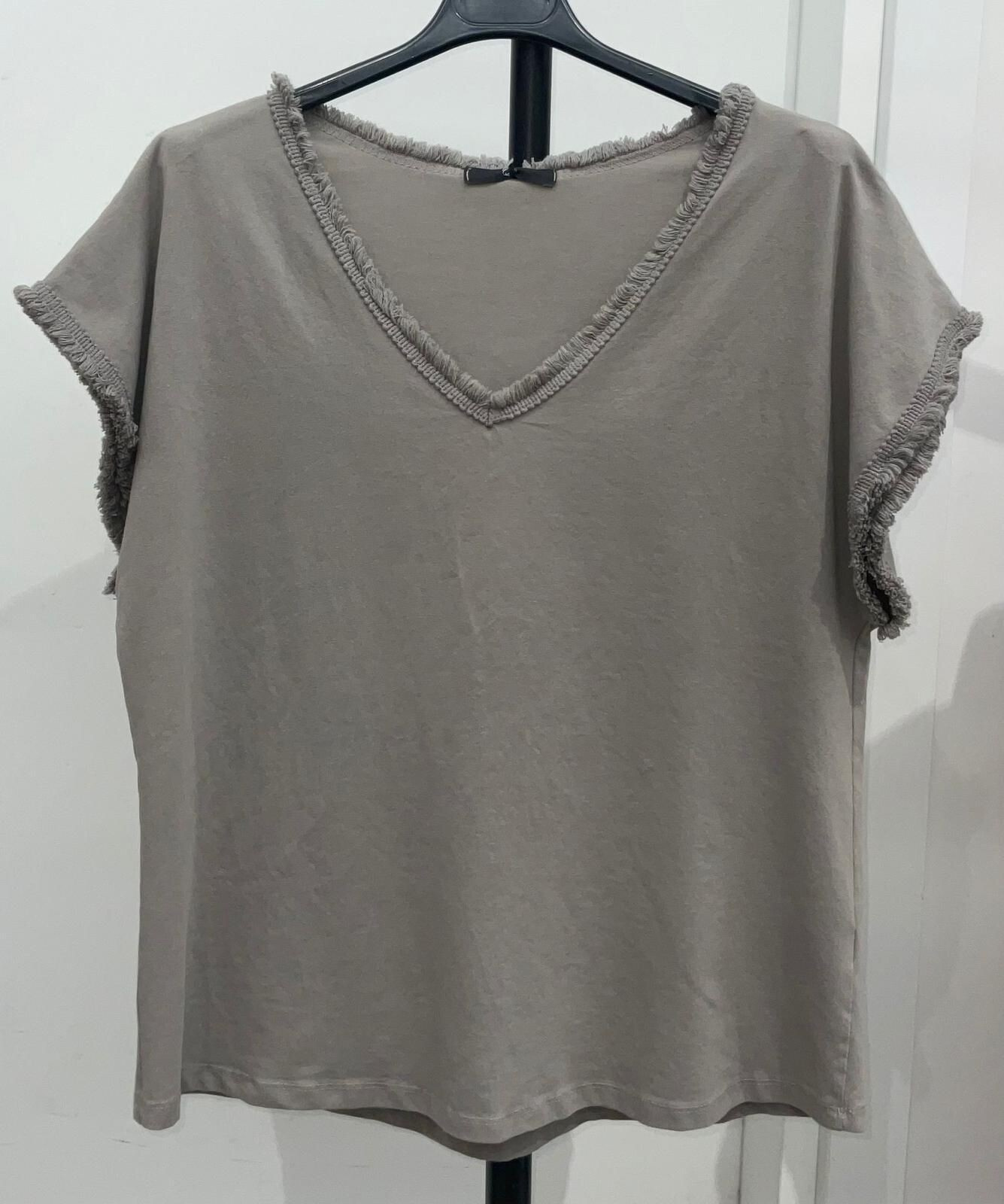 Dámské triko s krátkým rukávem a výstřihem do V. Jednoduché BASIC tričko s aplikací třepení ve výstřihu a na rukávech. Dovoz Itálie