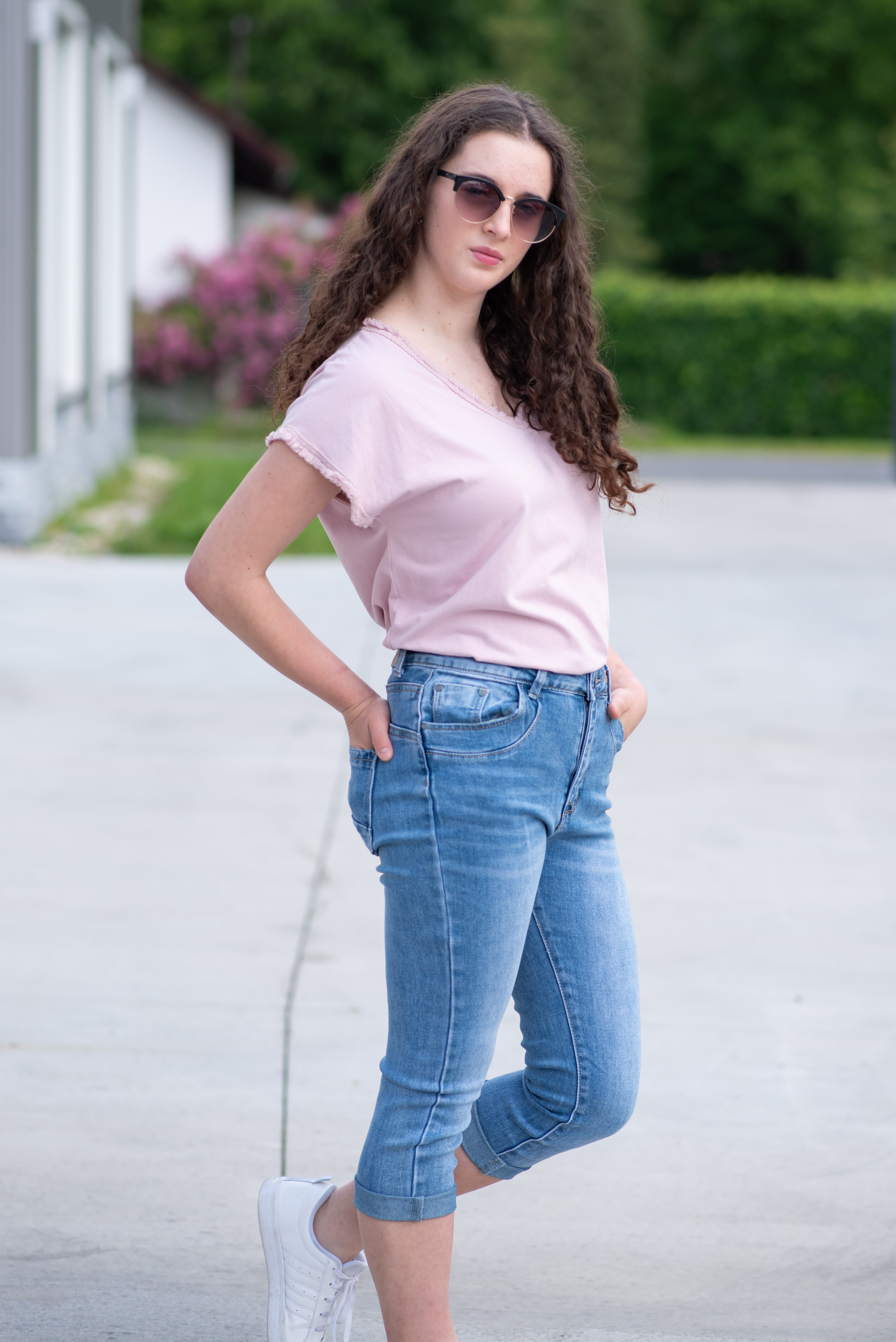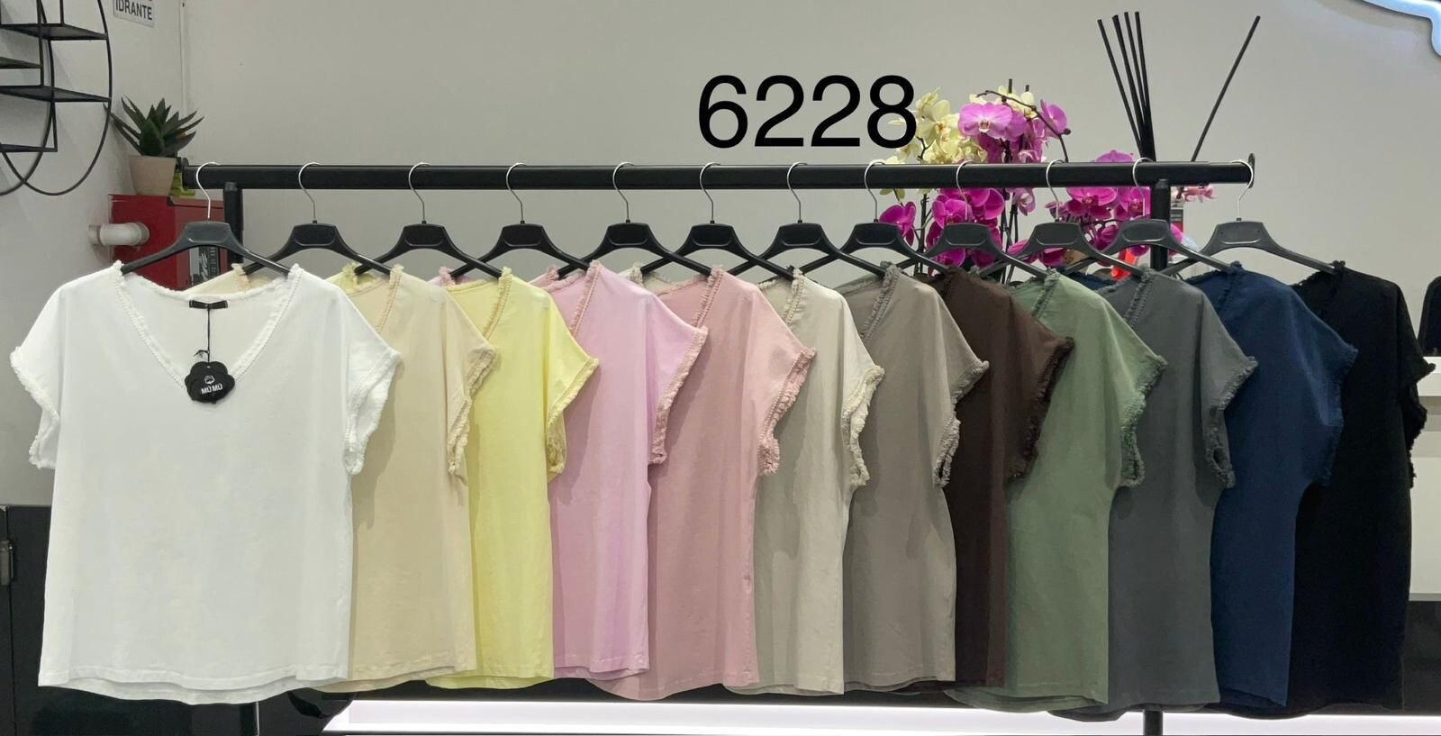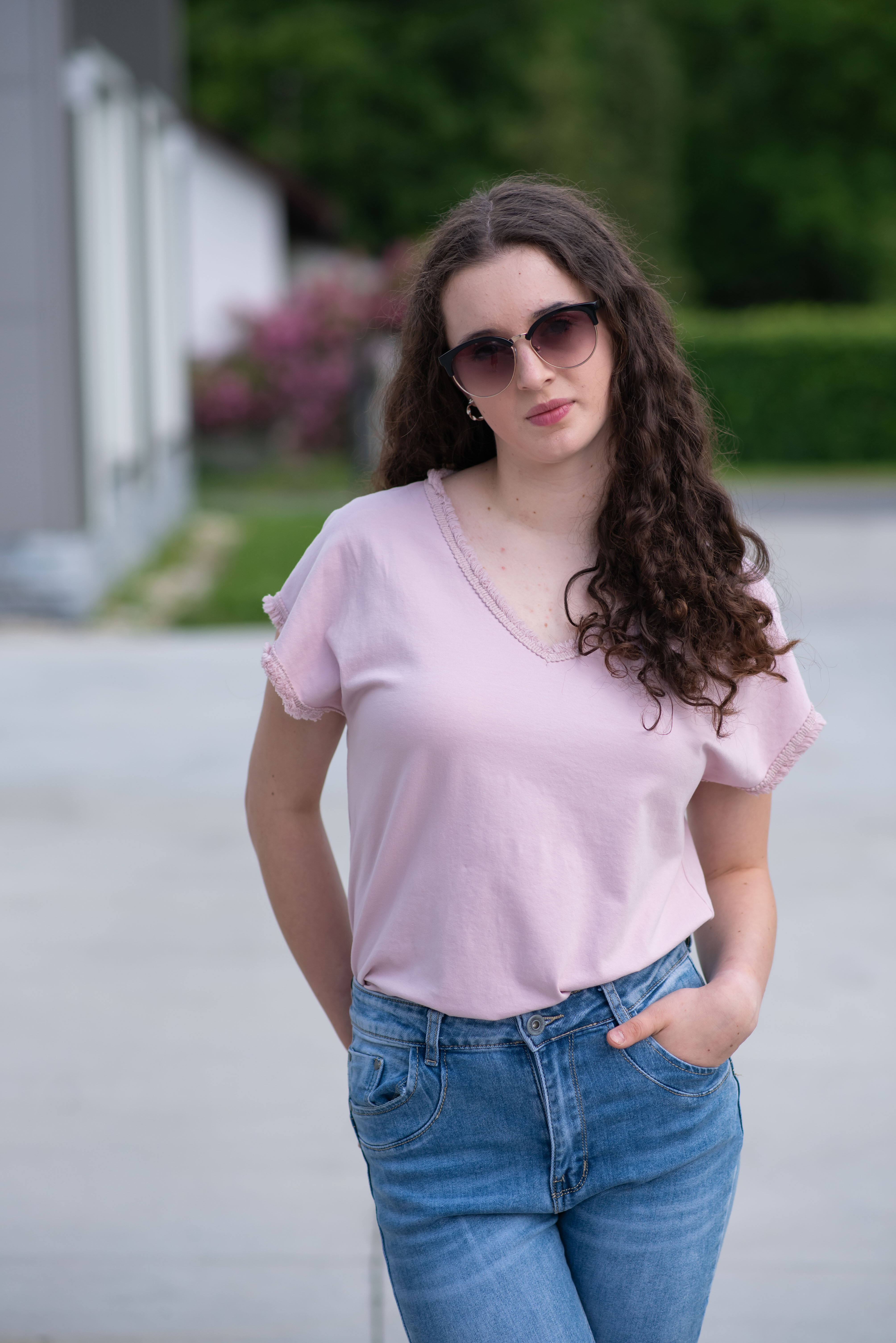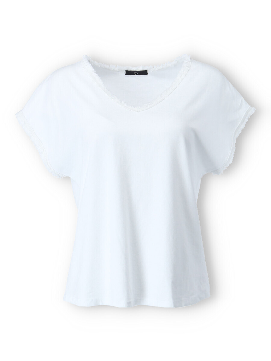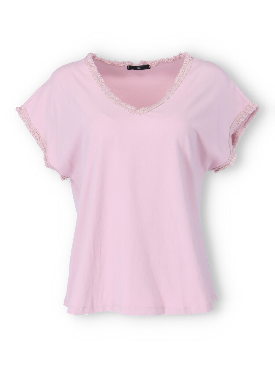 Dámské triko s krátkým rukávem a výstřihem do V. Jednoduché BASIC tričko s aplikací třepení ve výstřihu a na rukávech. Dovoz Itálie