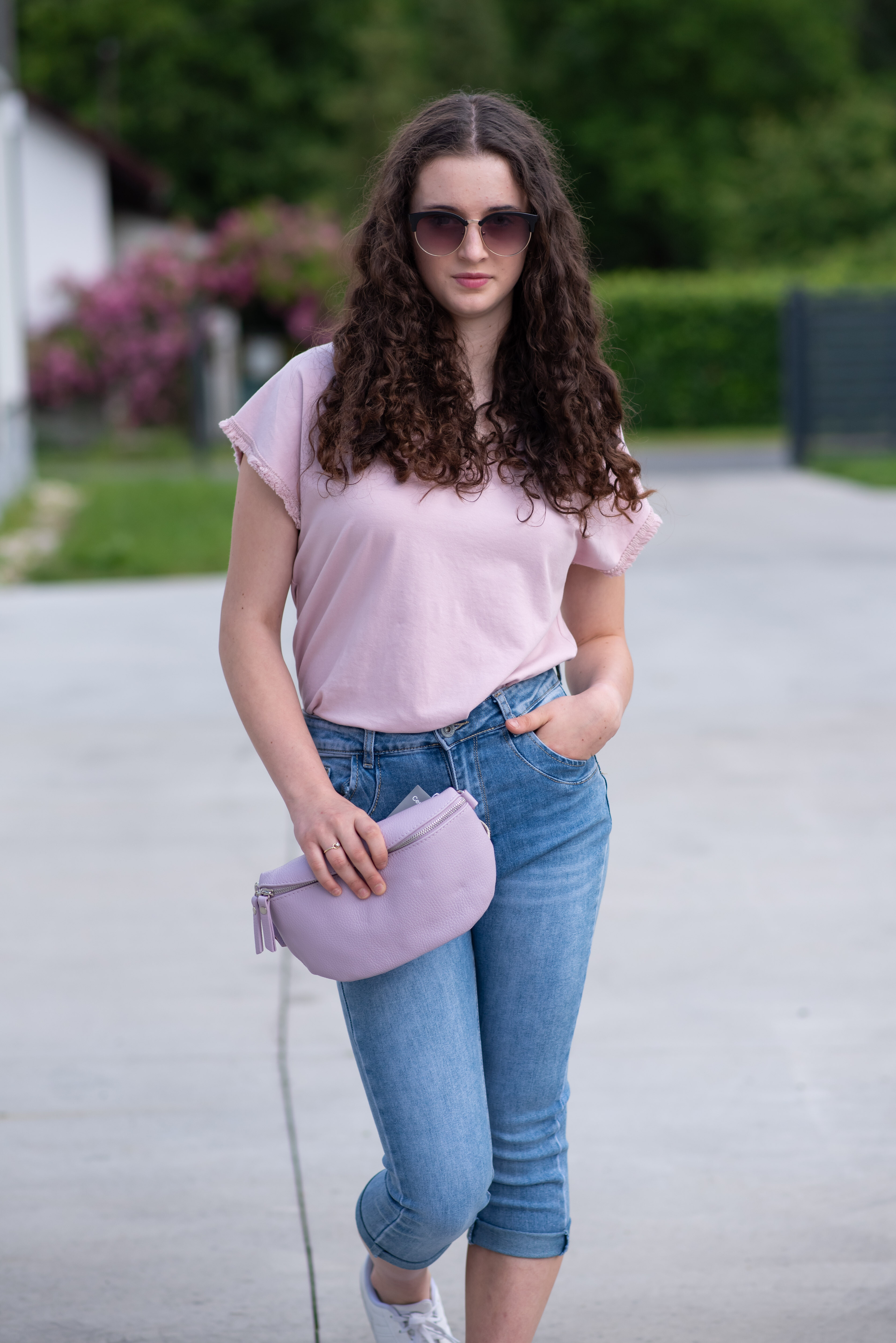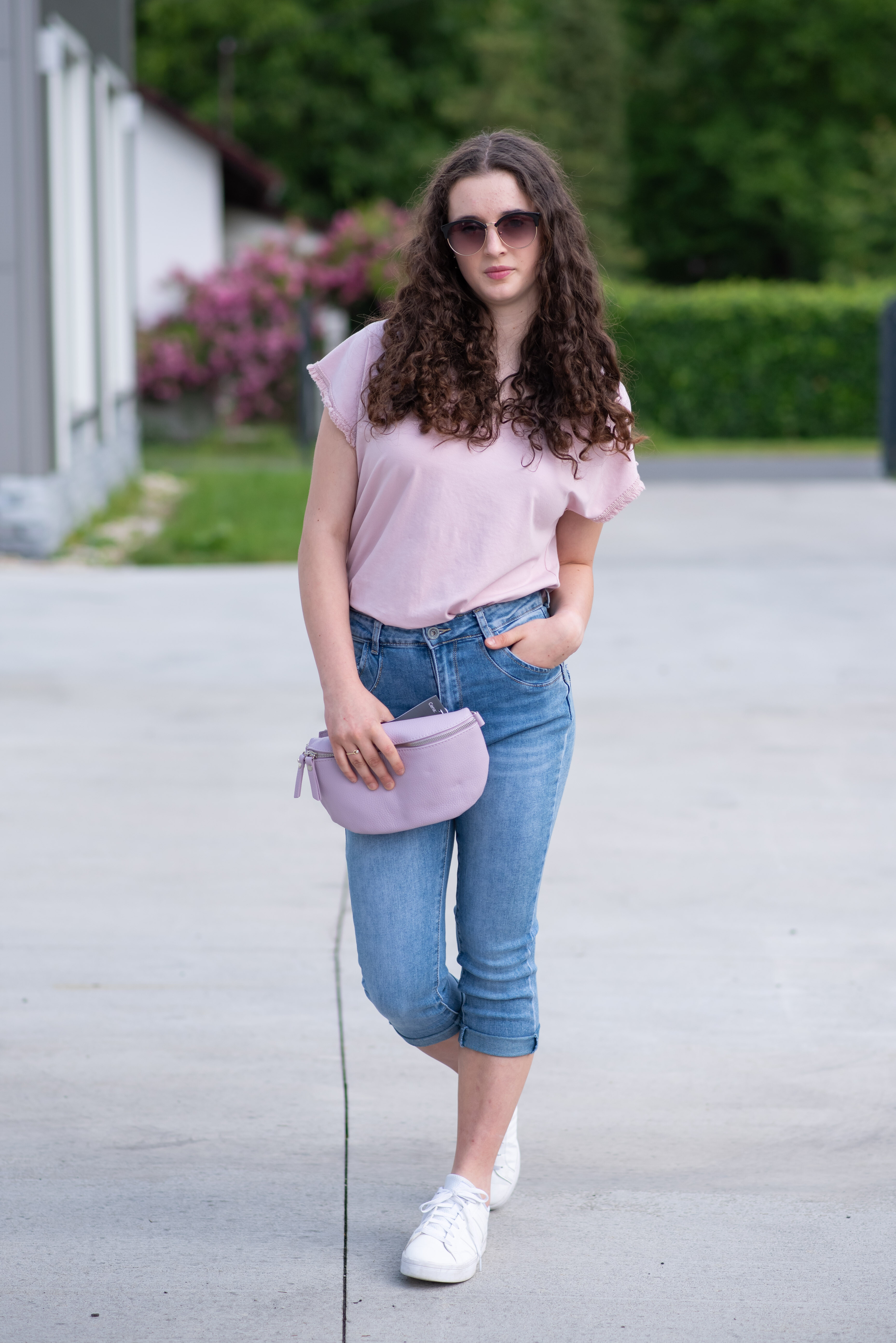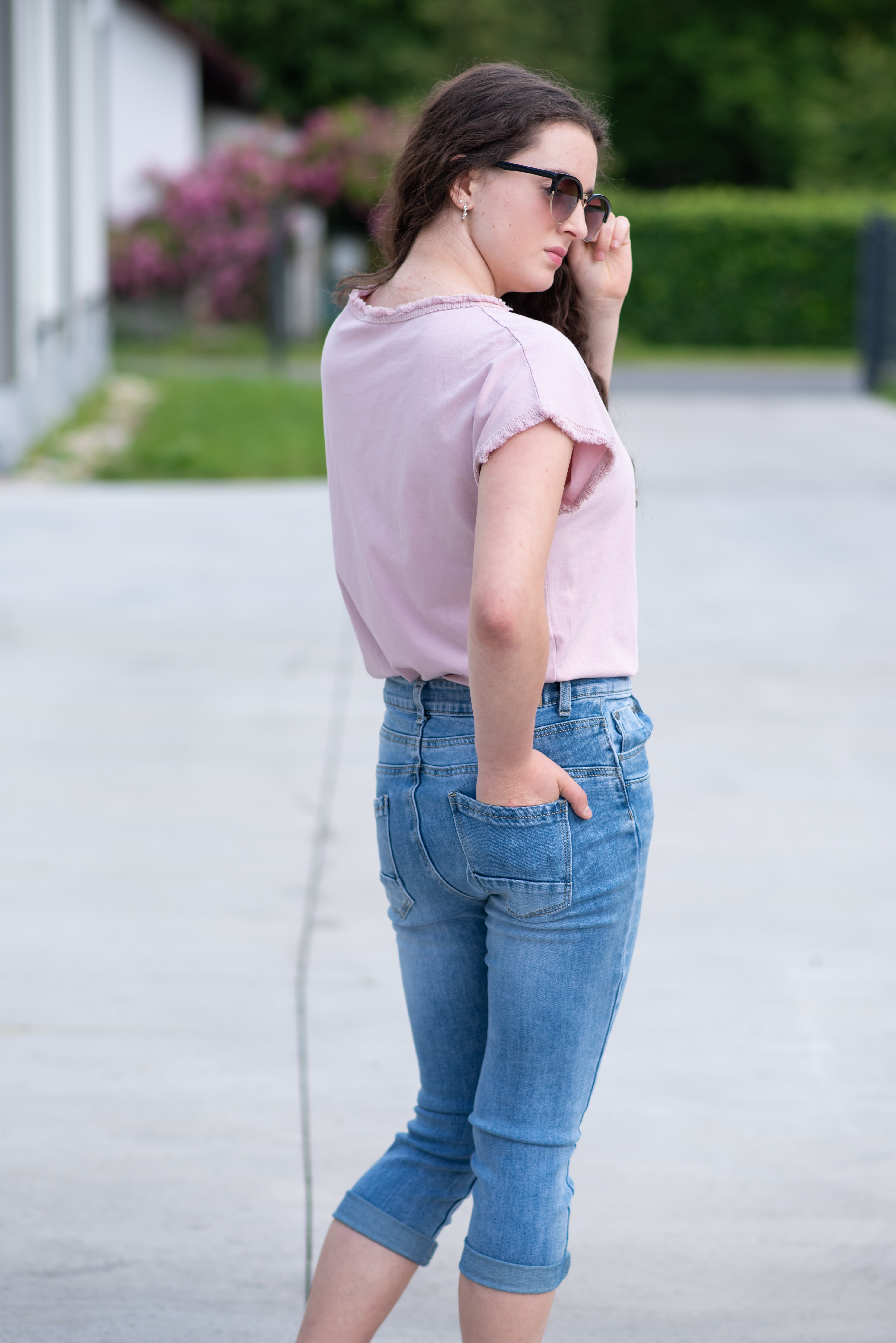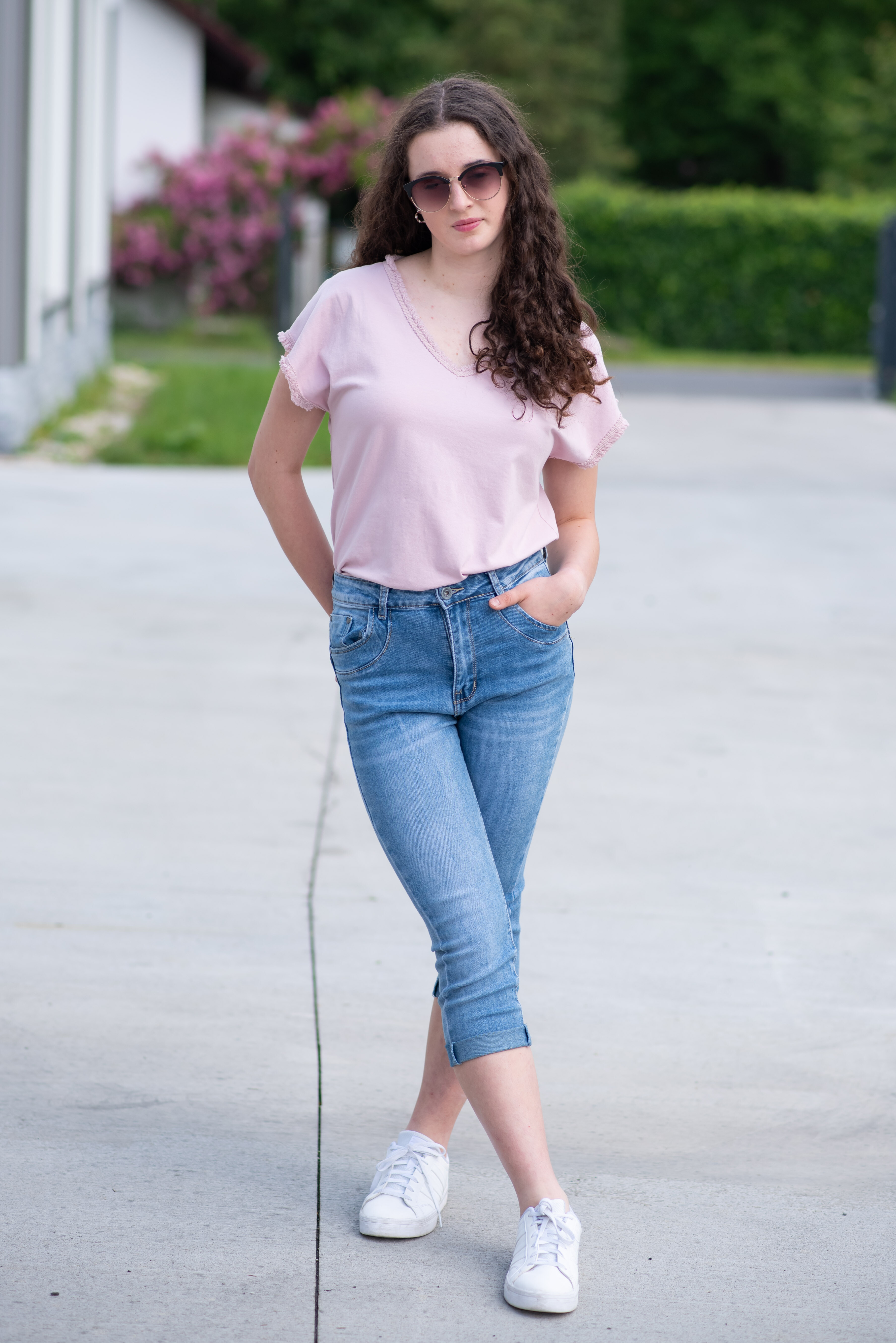 Dámské triko s krátkým rukávem a výstřihem do V. Jednoduché BASIC tričko s aplikací třepení ve výstřihu a na rukávech. Dovoz Itálie