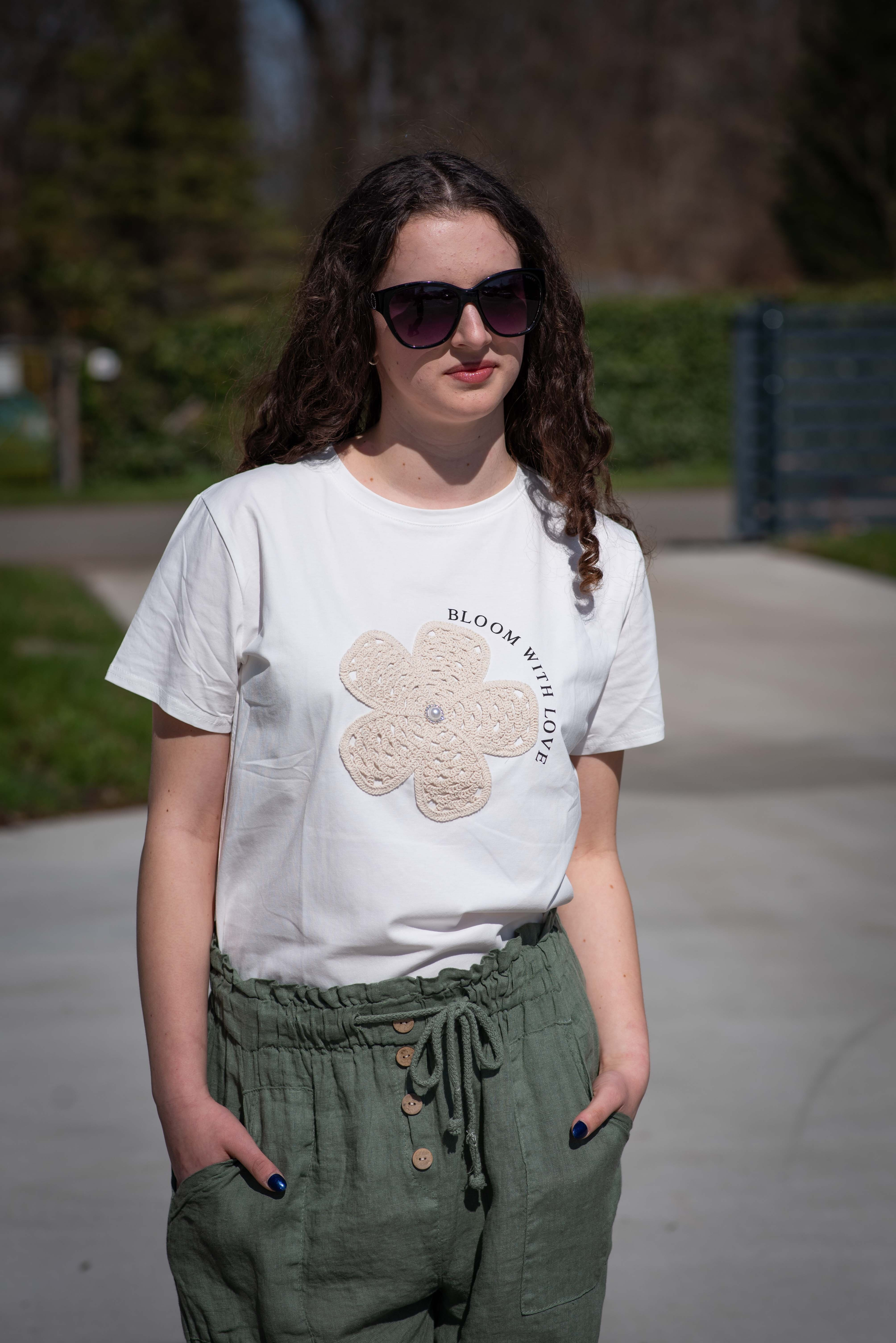 Dámské triko s aplikací výšivky květu. Triko má krátký rukáv a kulatý výstřih. Dovoz Itálie