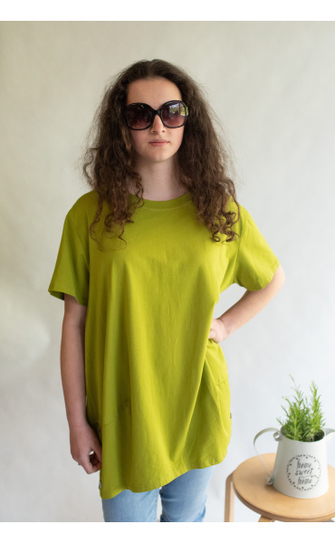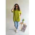 Basic triko oversize střihu s krátkým rukávem a kulatým výstřihem. Po stranách má ozdobné knoflíky a zadní prodlouženou délku.