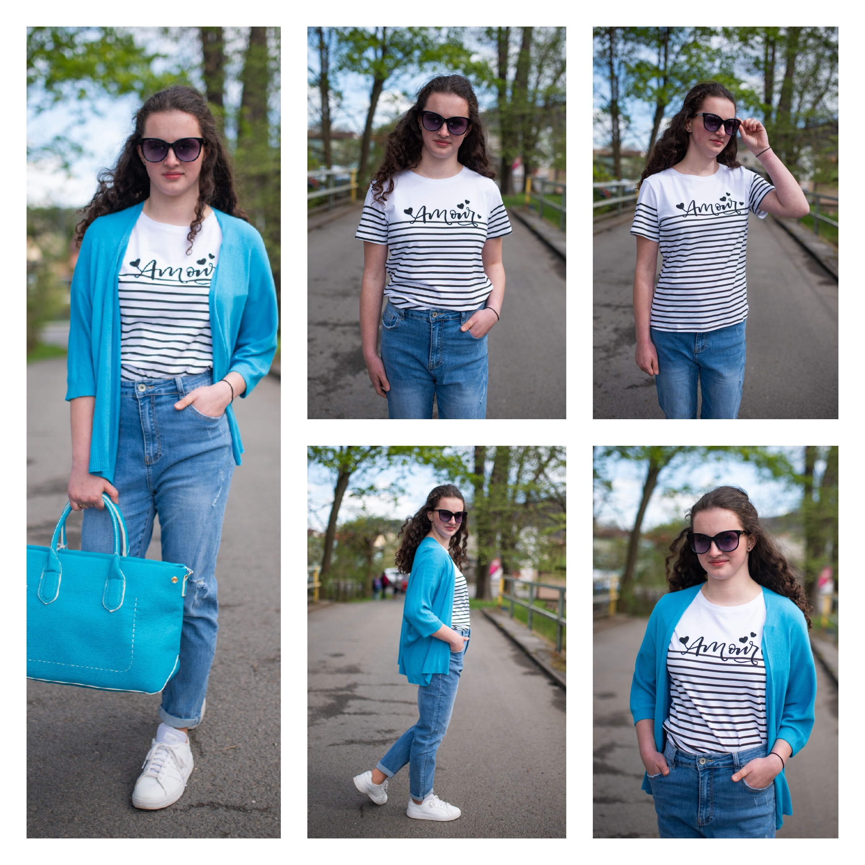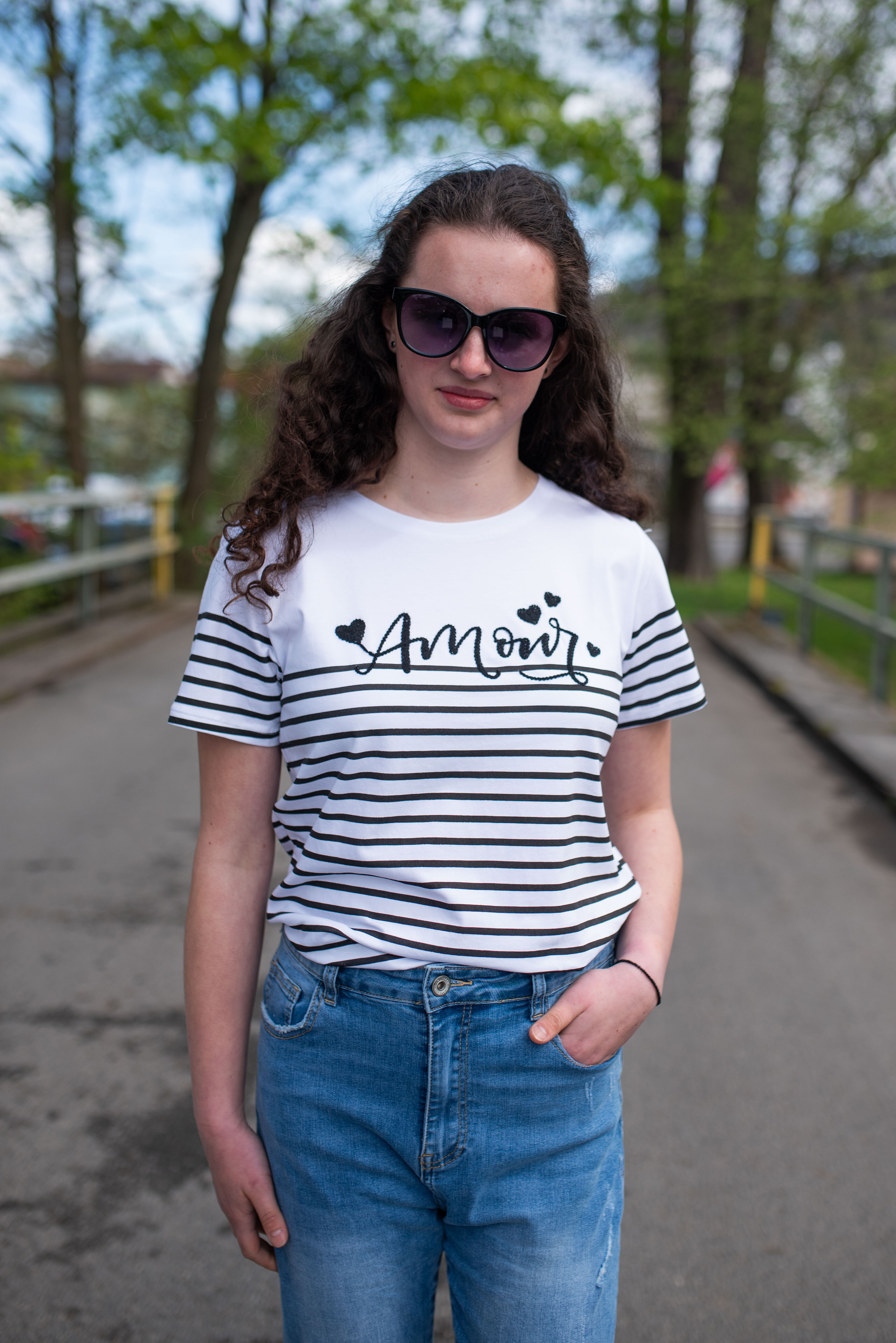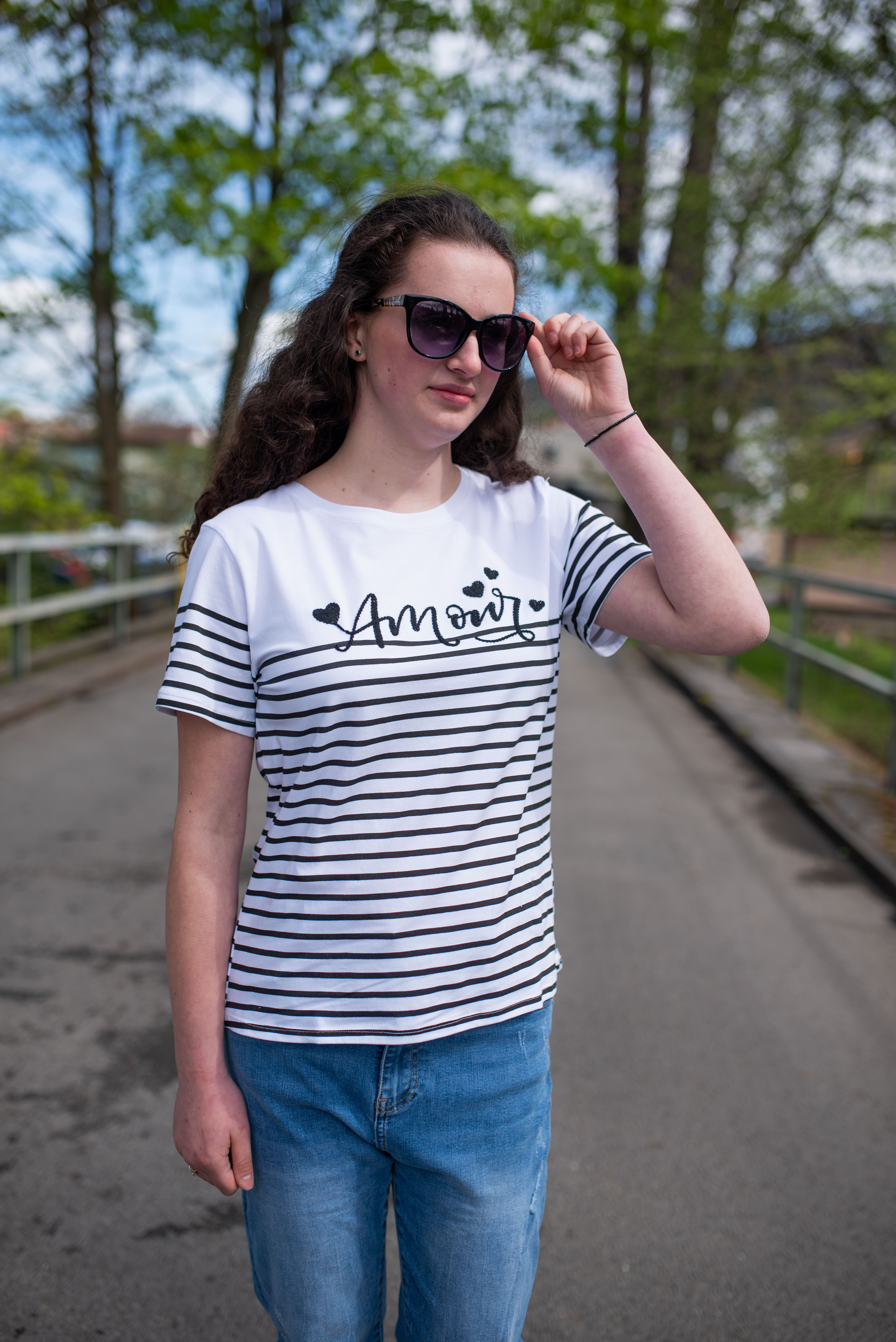 Triko s krátkým rukávem a proužkem nápis Amour