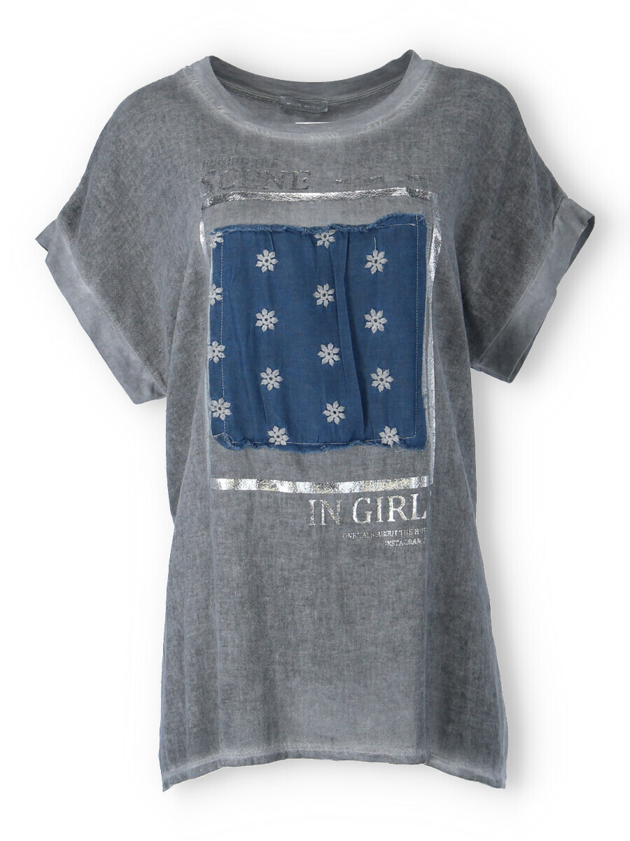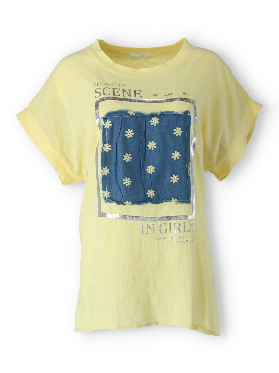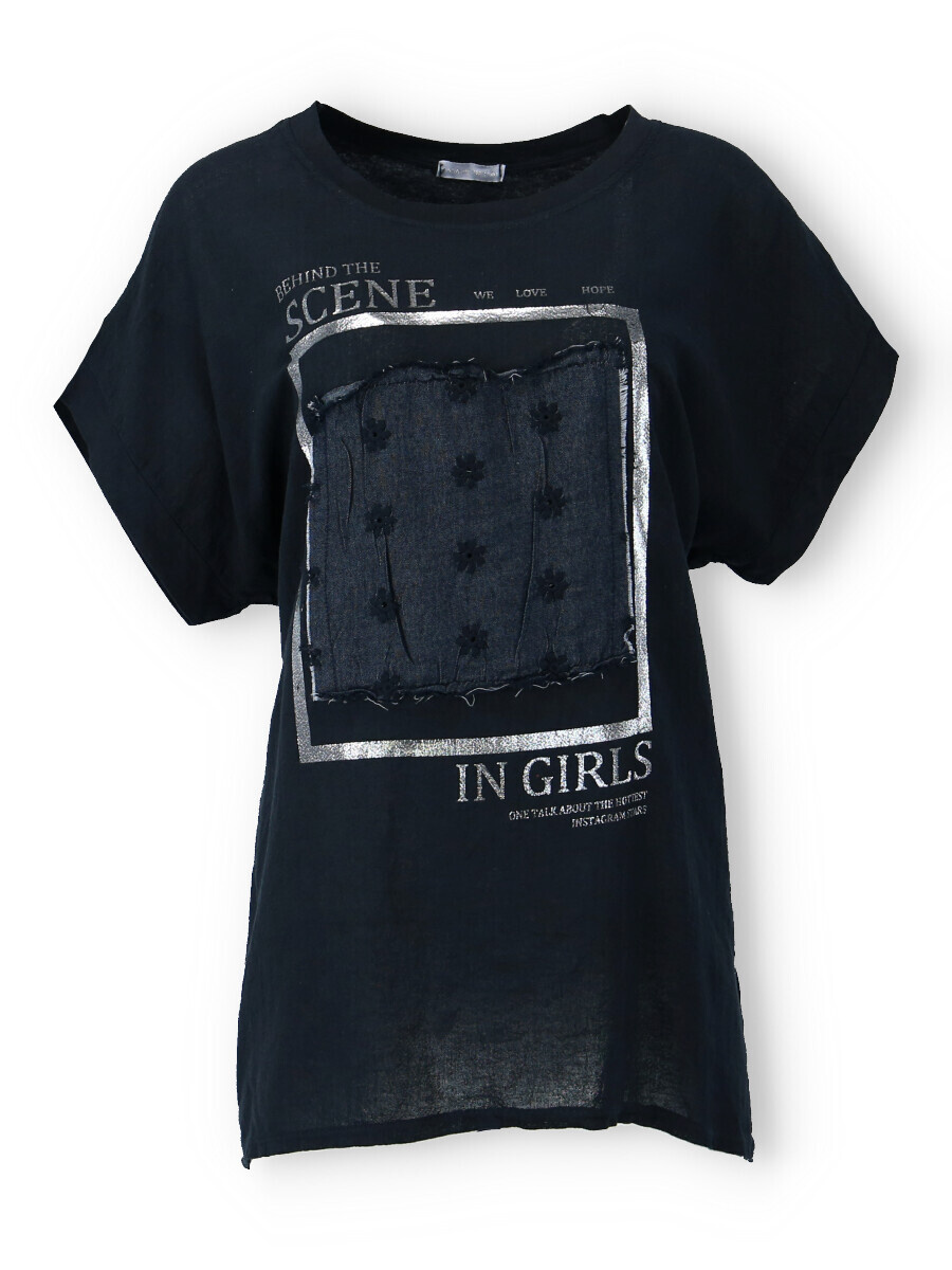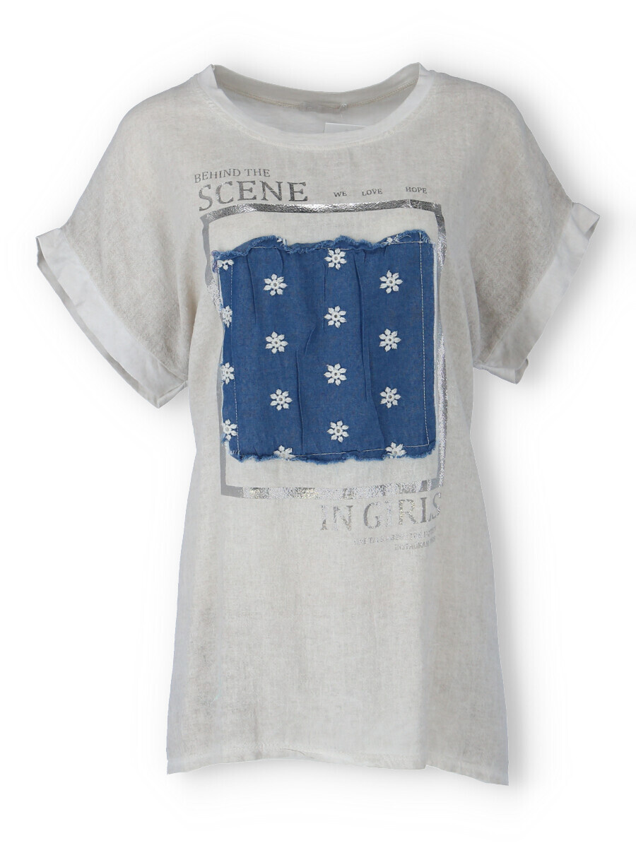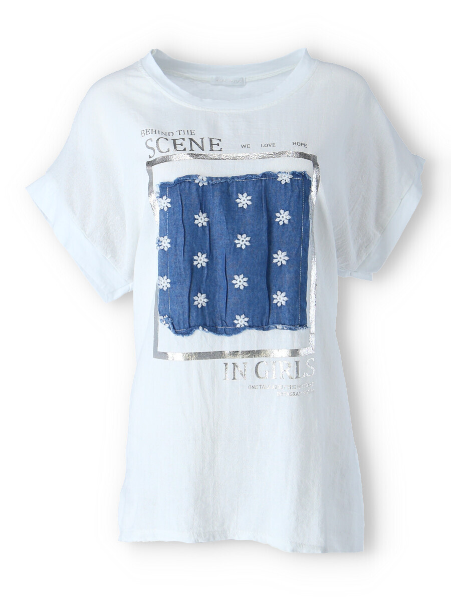 Dámské triko s aplikací džínové výšivky na přední straně. Triko je volnějšího střihu, má krátký rukáv a kulatý výstřih.