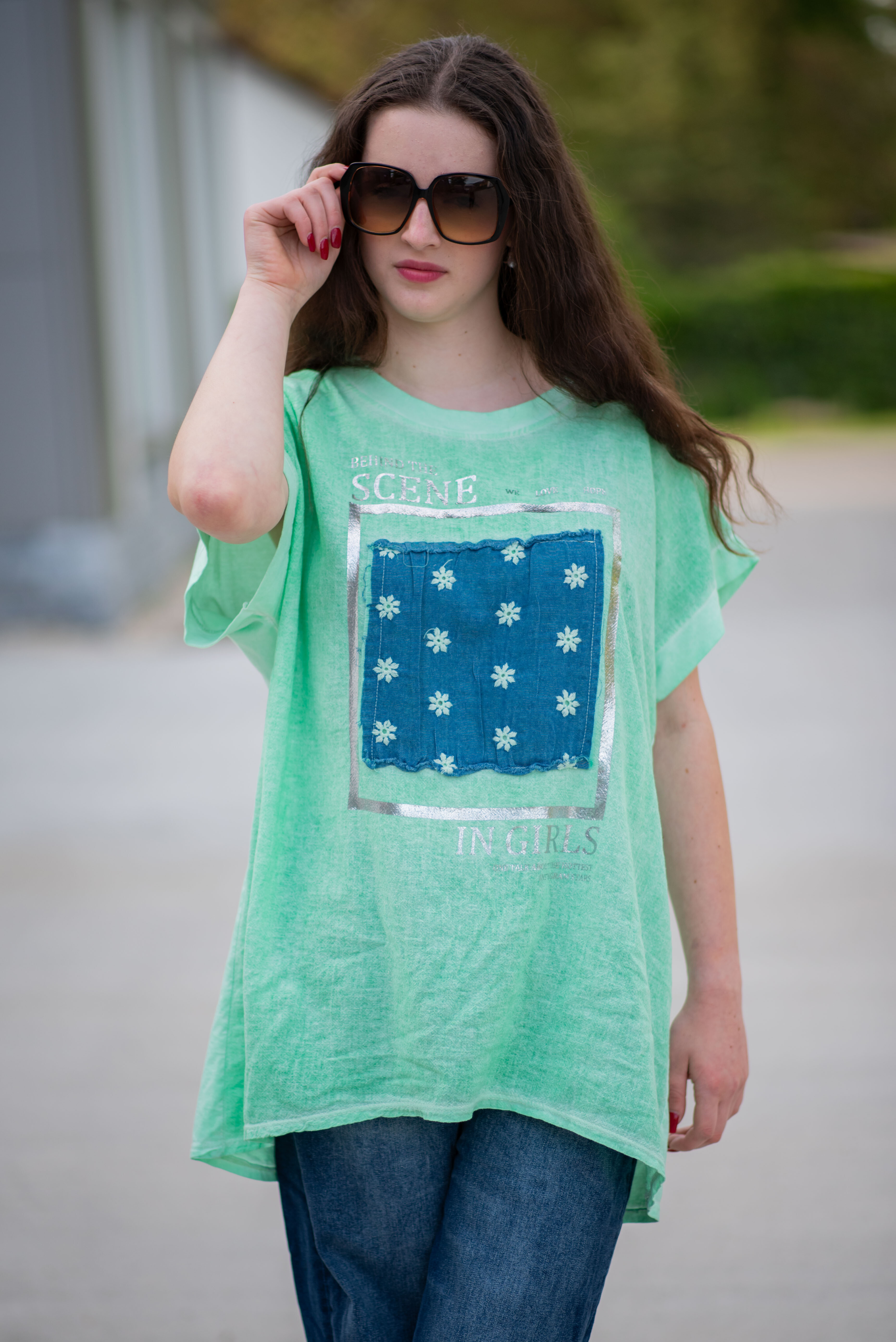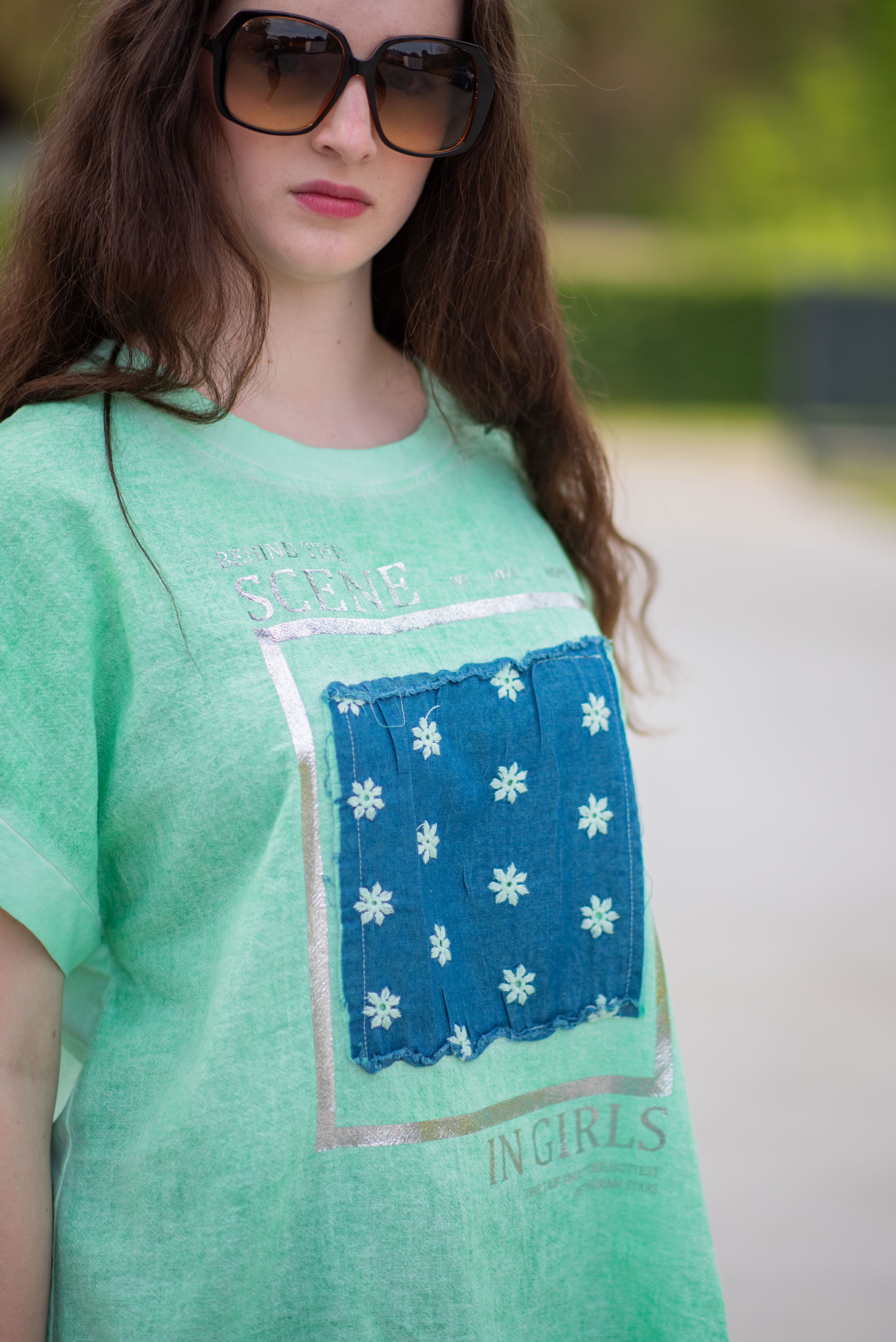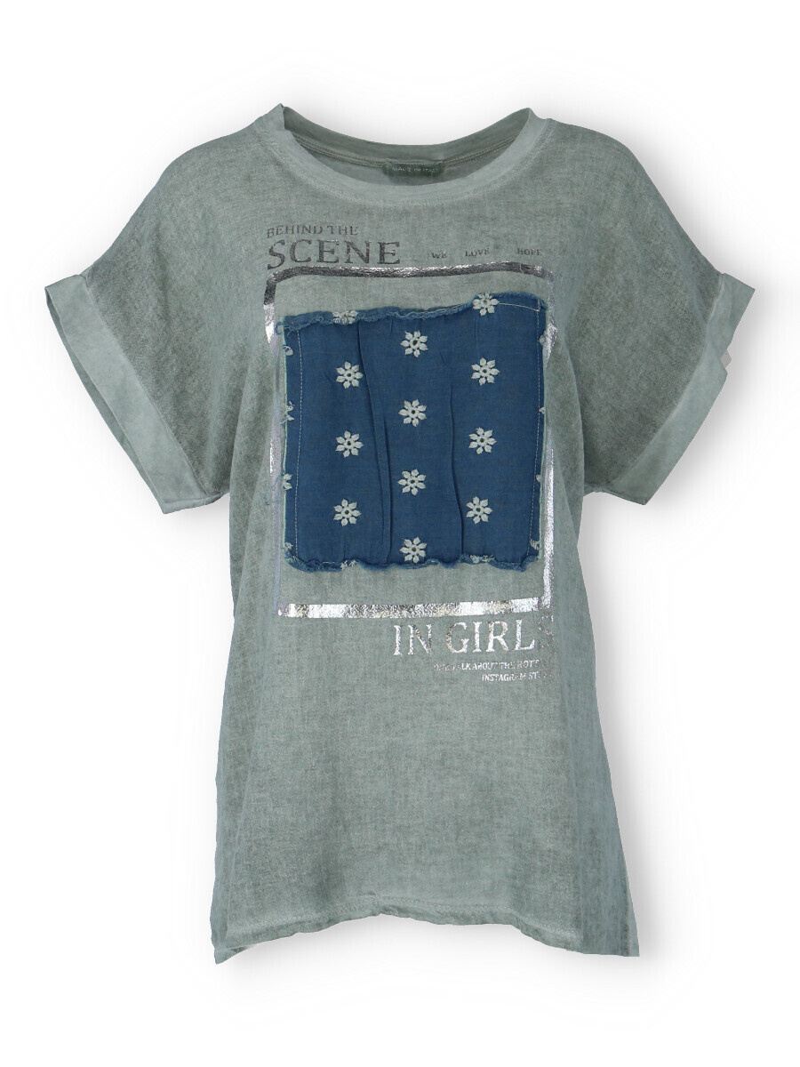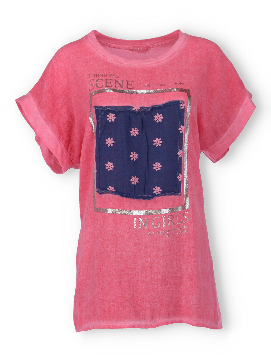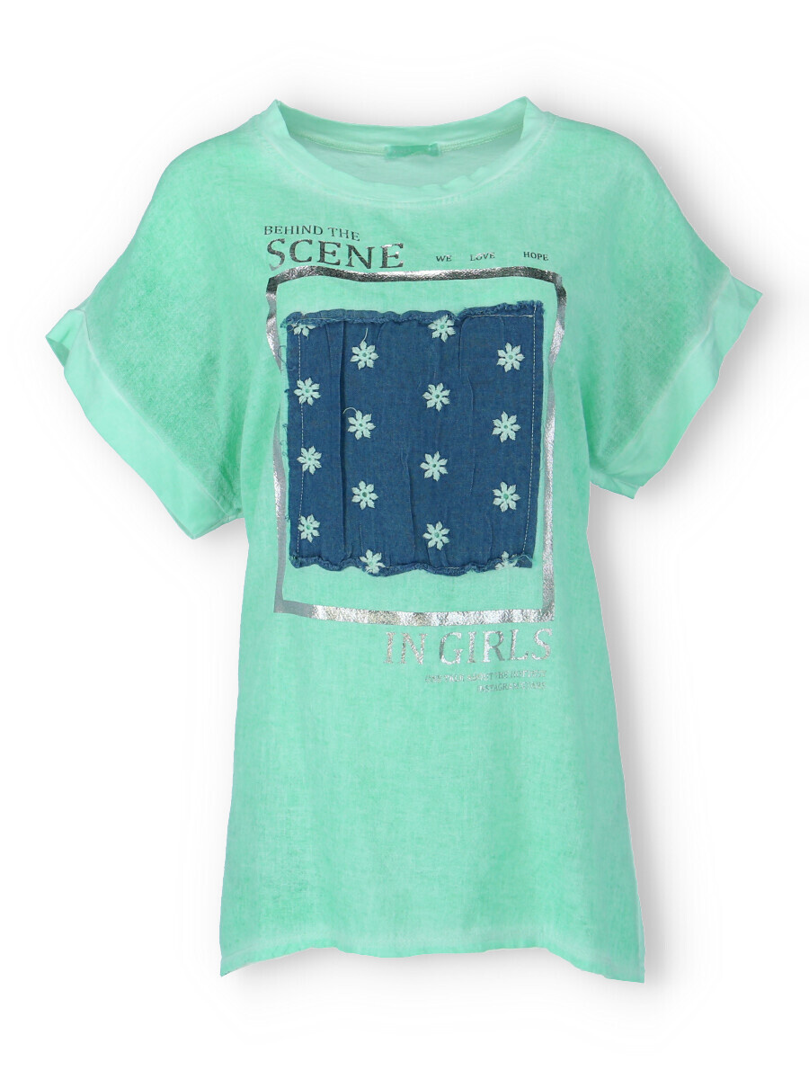 Dámské triko s aplikací džínové výšivky na přední straně. Triko je volnějšího střihu, má krátký rukáv a kulatý výstřih.