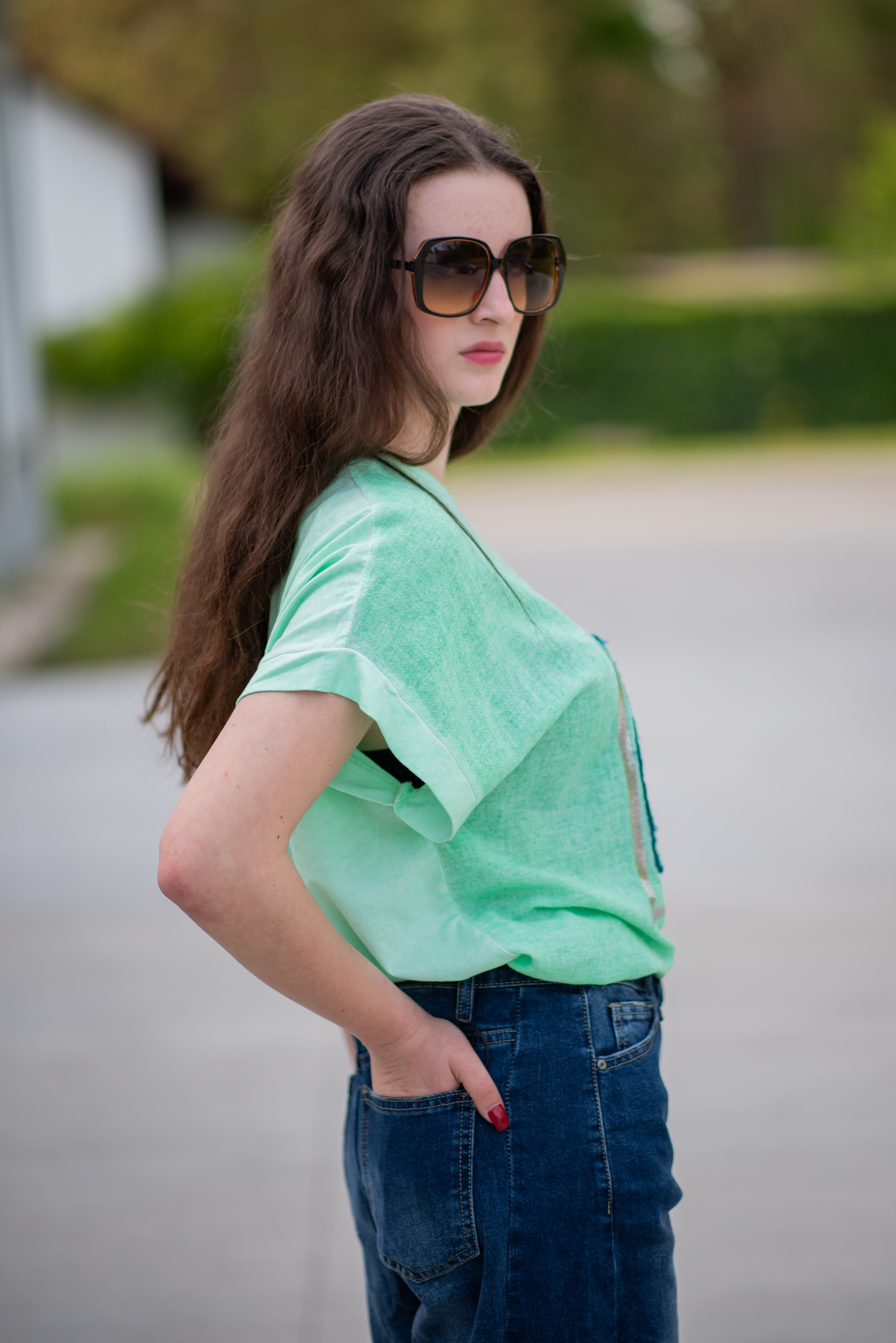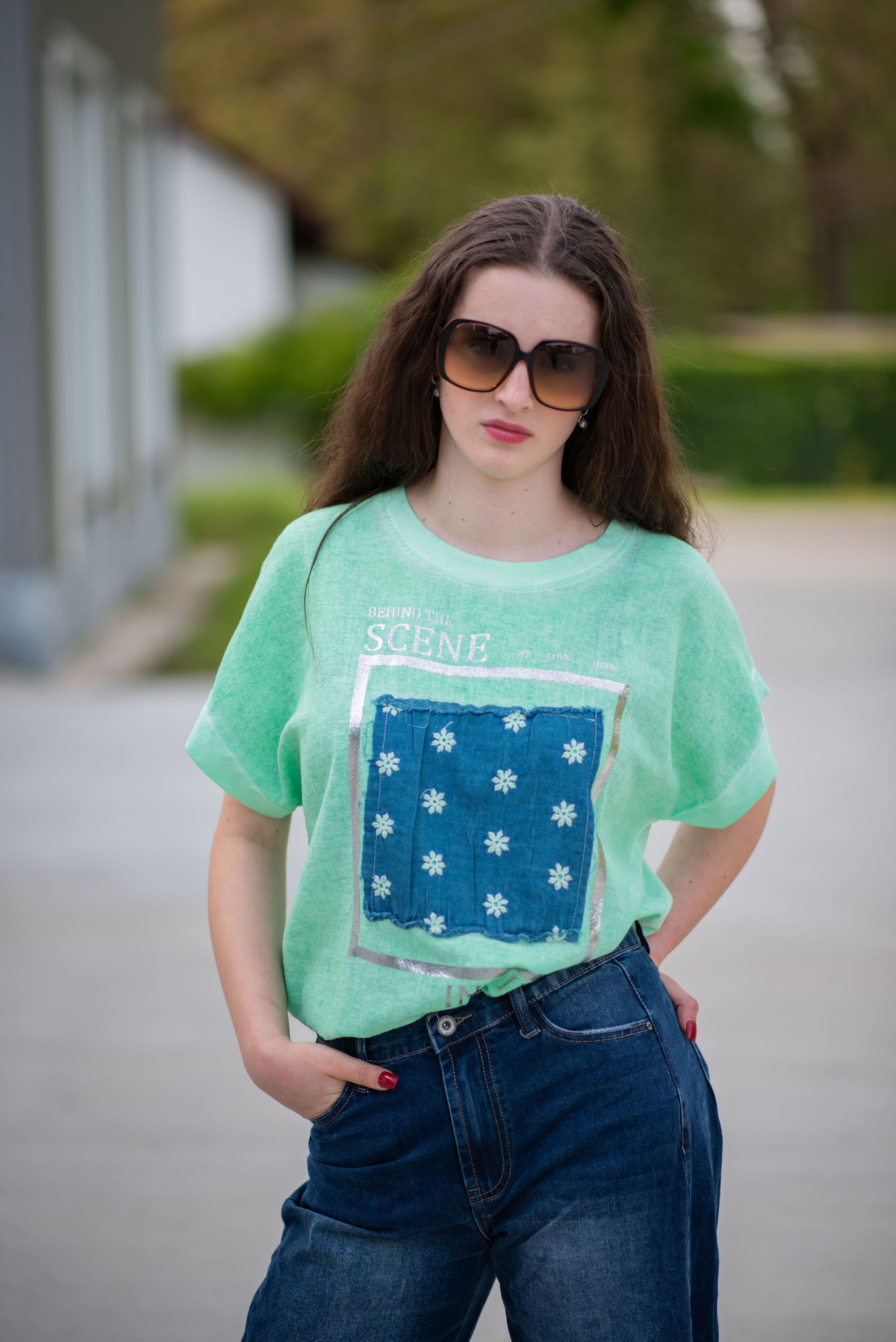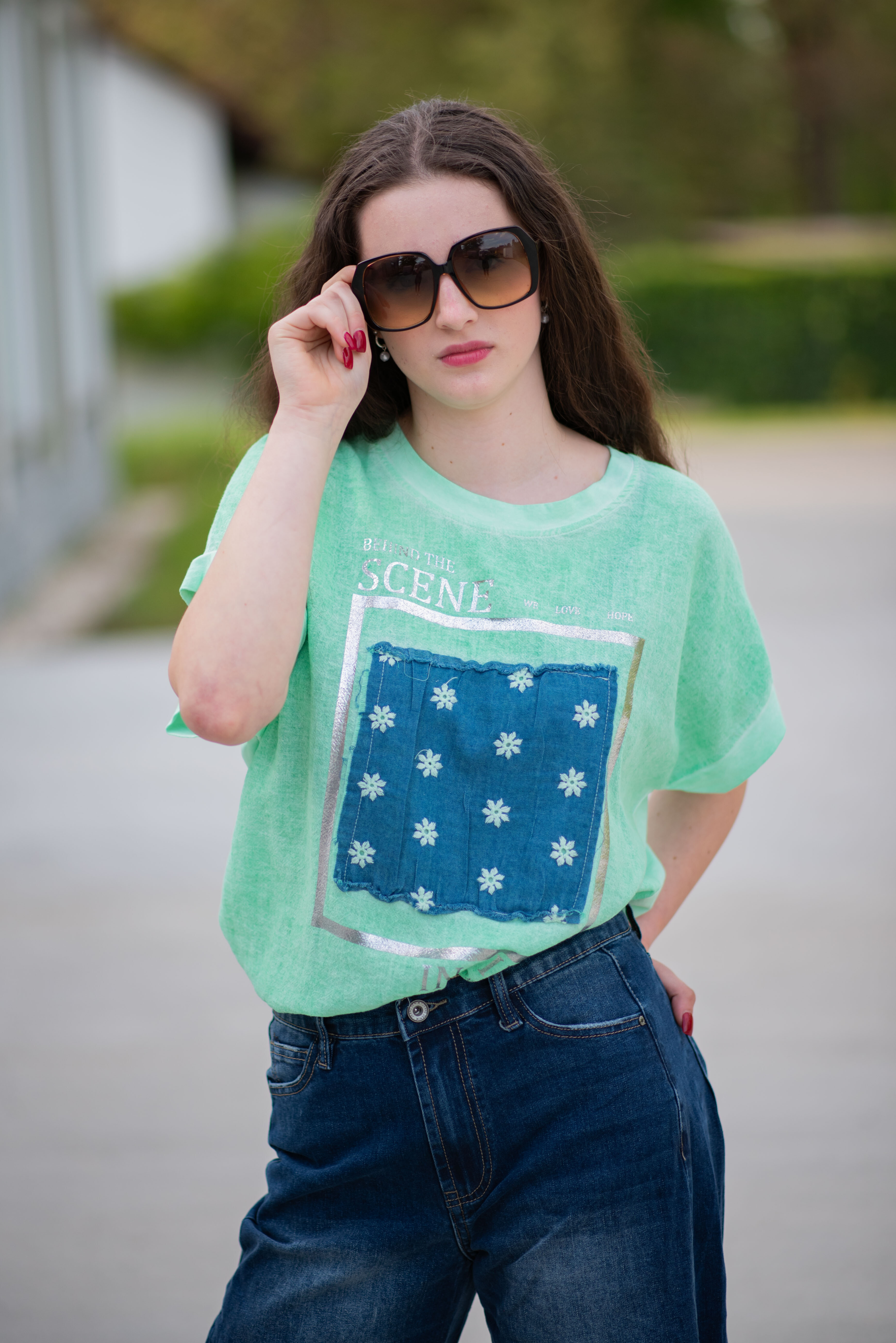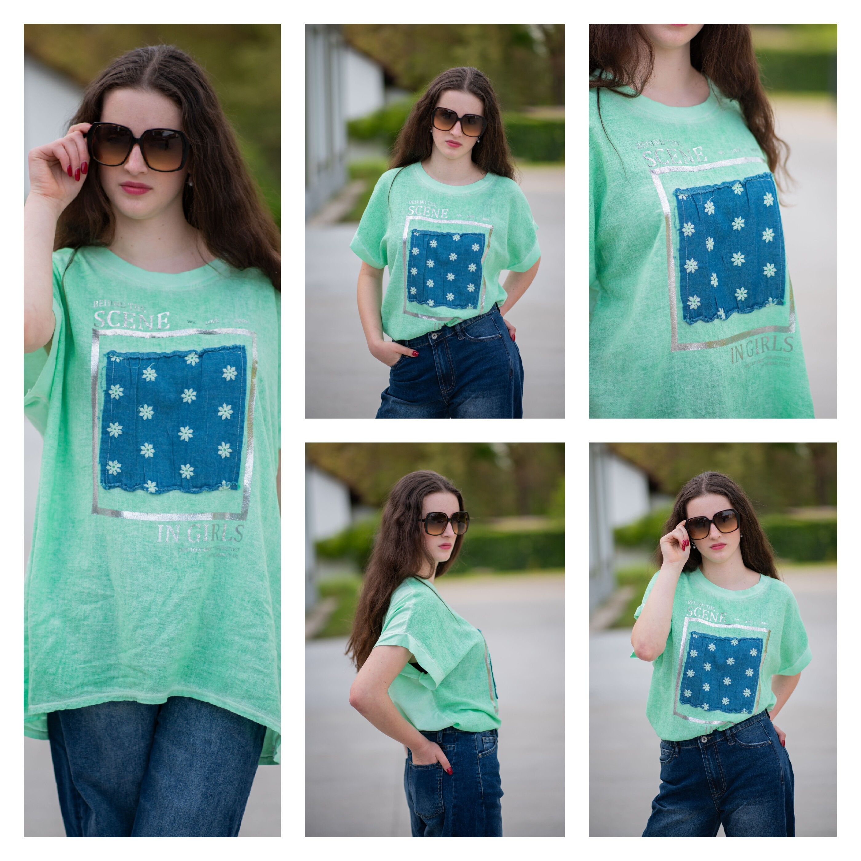 Dámské triko s aplikací džínové výšivky na přední straně. Triko je volnějšího střihu, má krátký rukáv a kulatý výstřih.