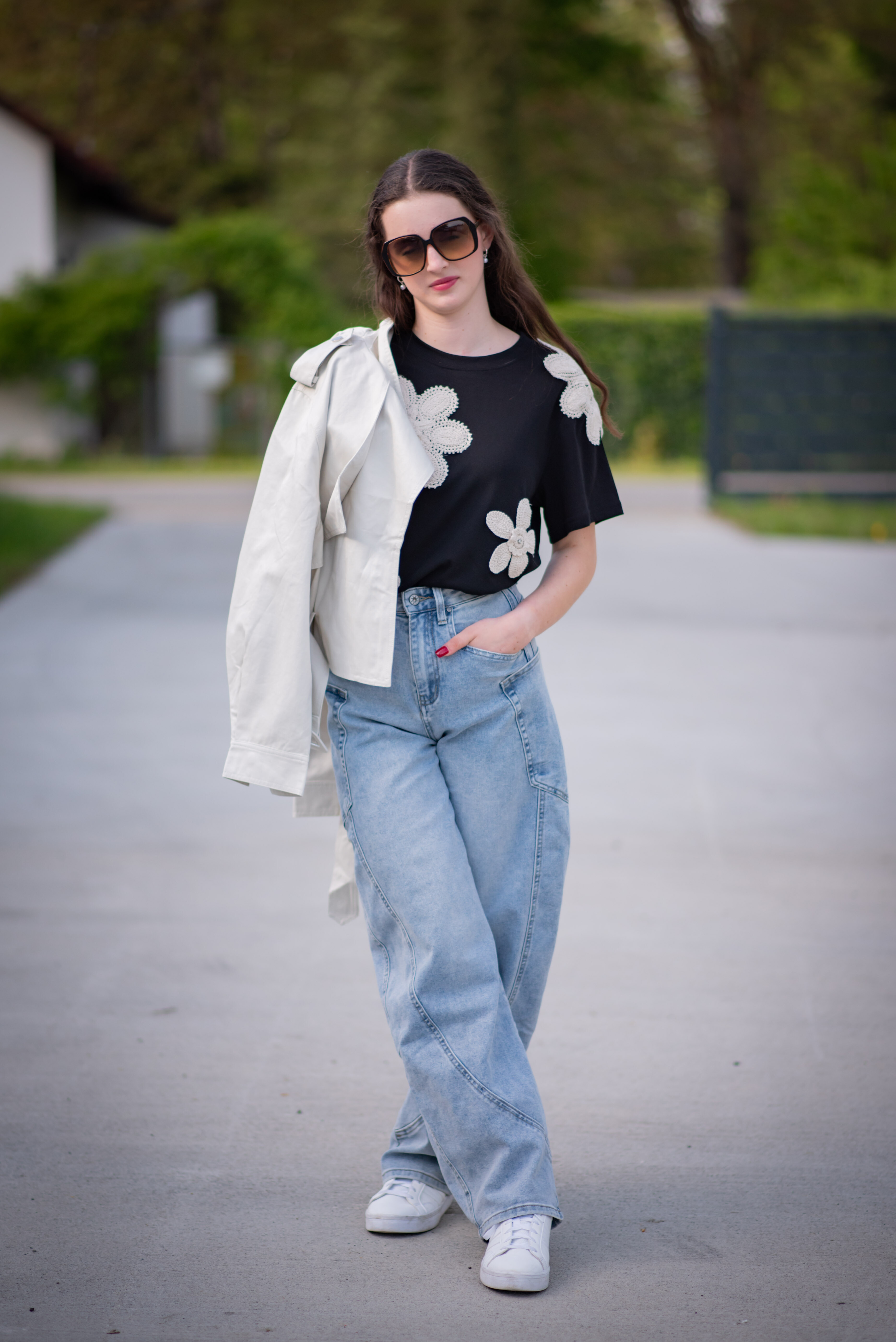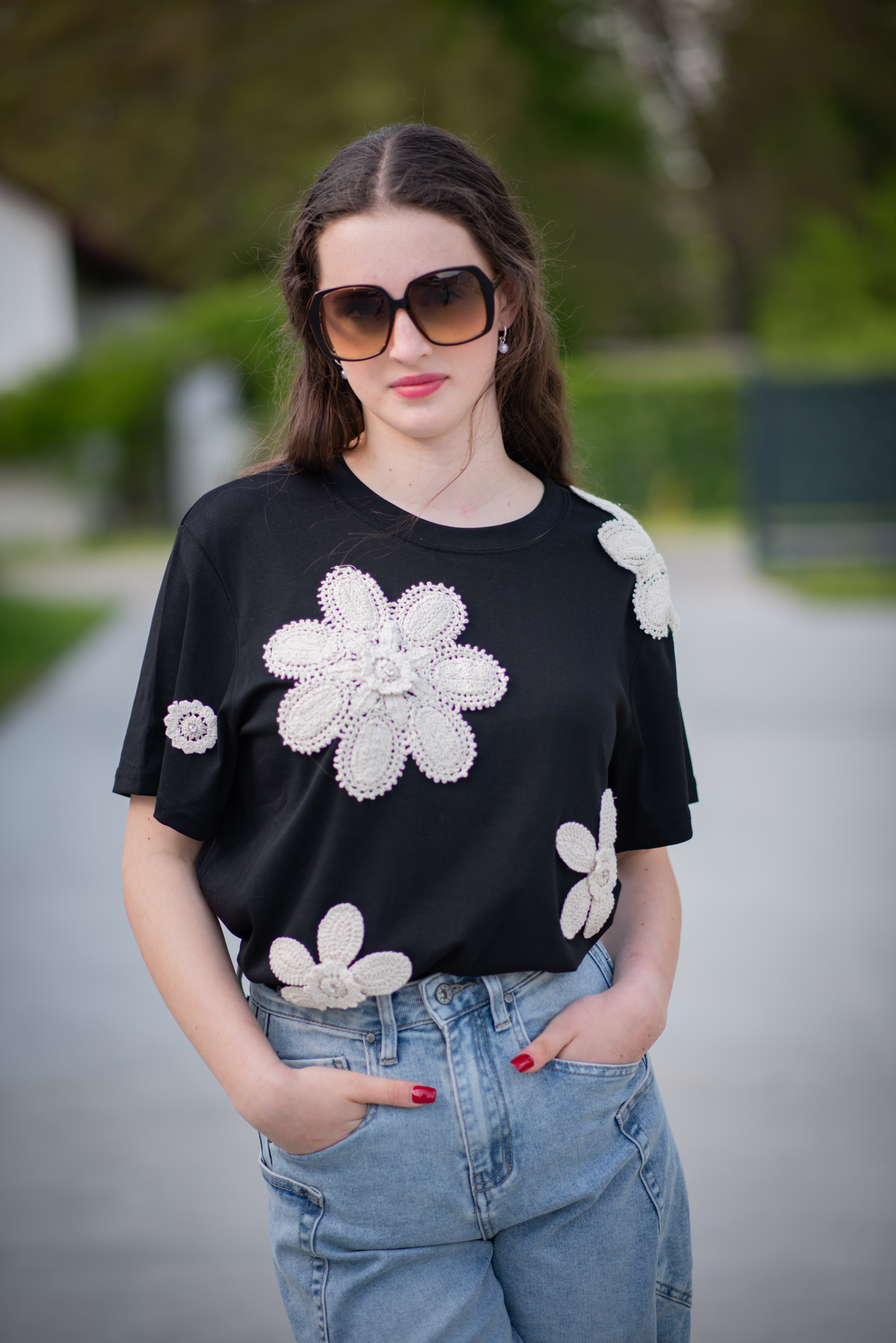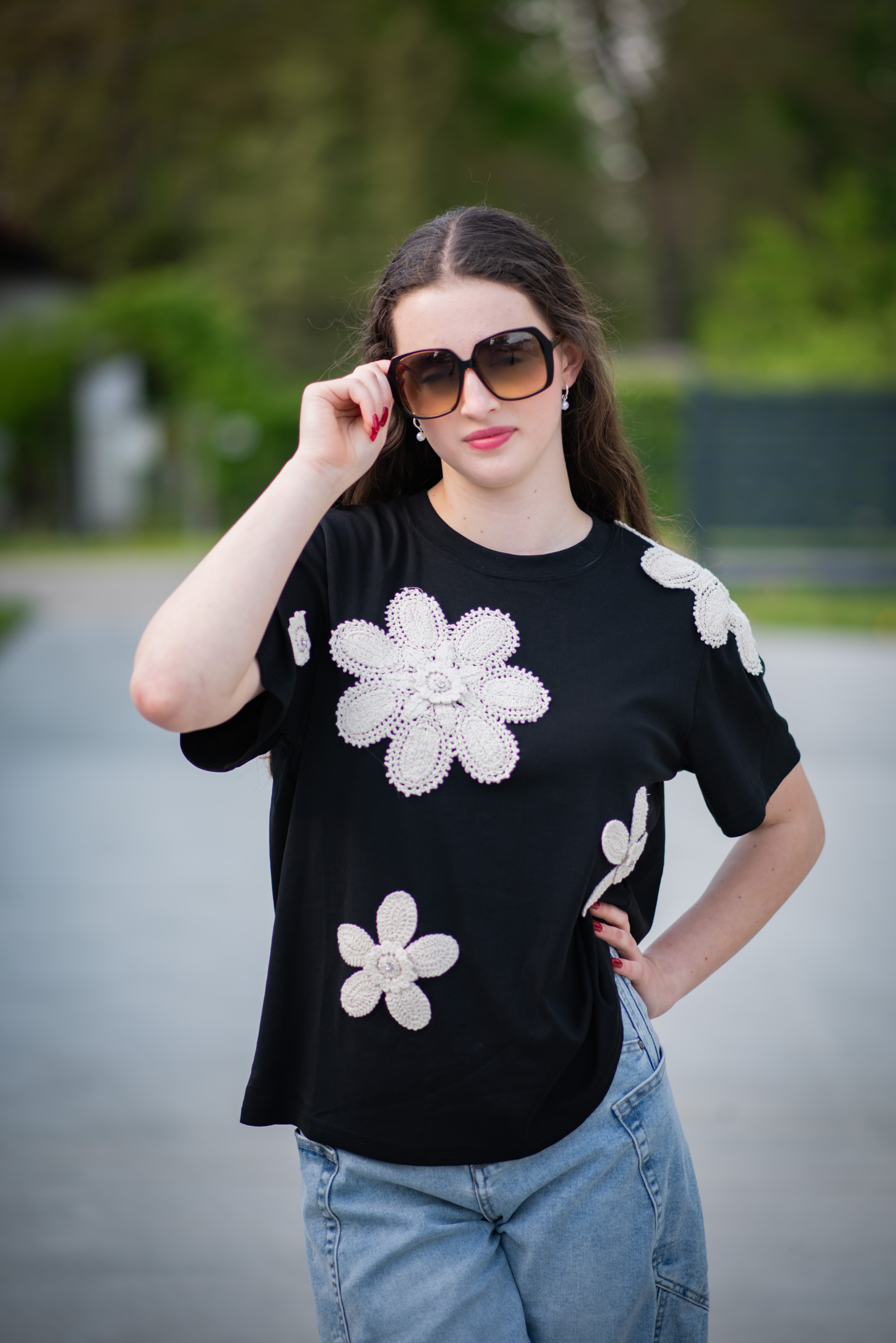 Dámské triko s krátkým rukávem. Triko má na přední straně háčkované květy a kulatý výstřih. Dovoz Itálie