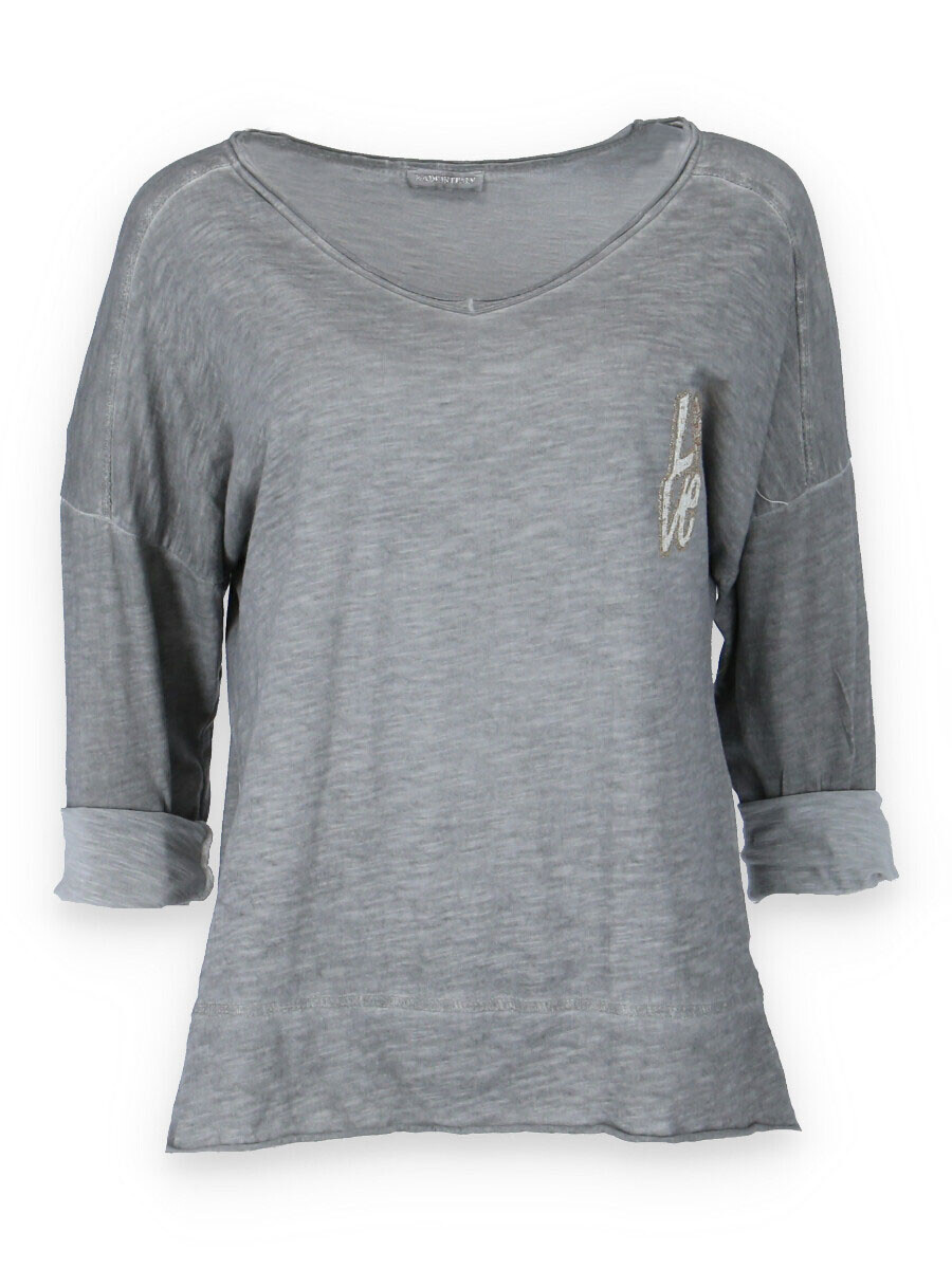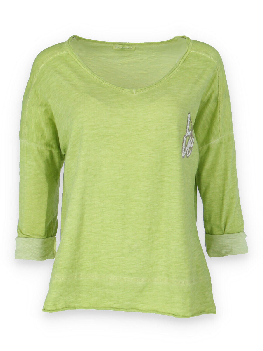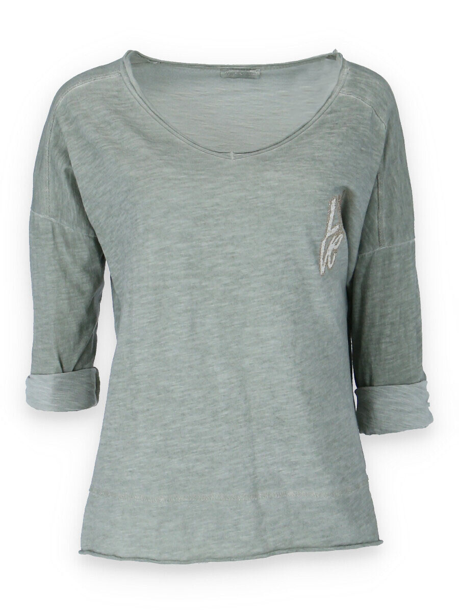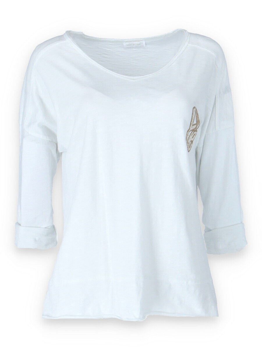 Basic triko s dlouhým rukávem a aplikací na prsou. Triko je volnějšího střihu, má prodlouženou zadní délku a výstřih do V.