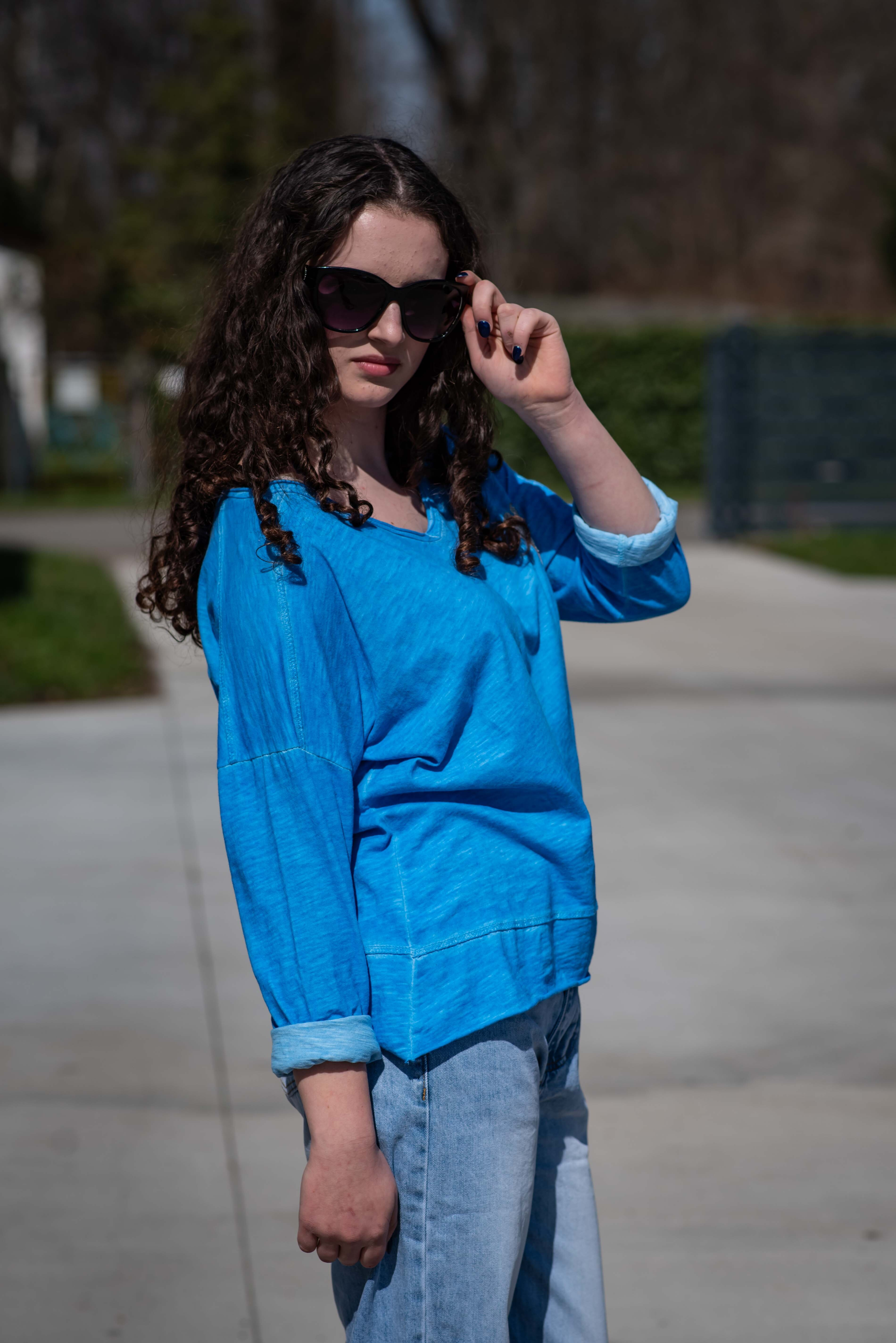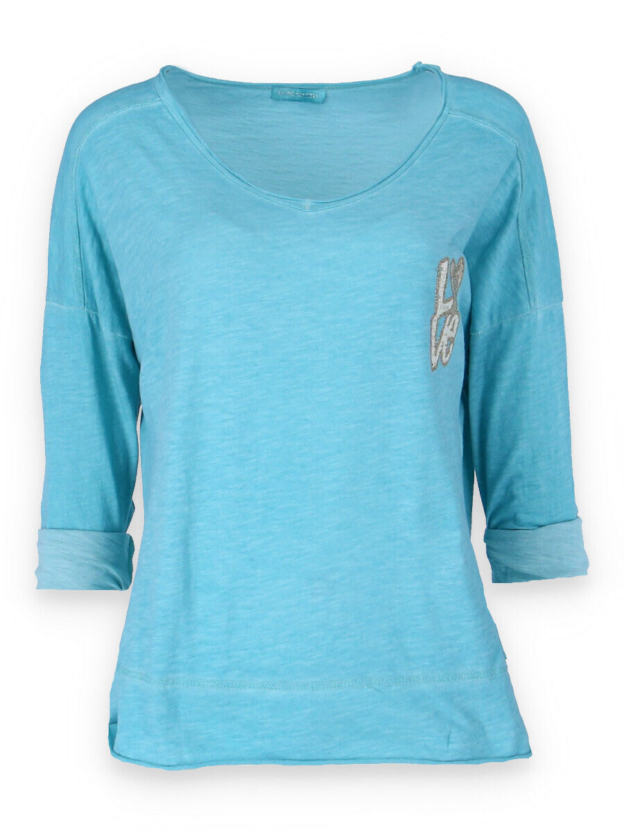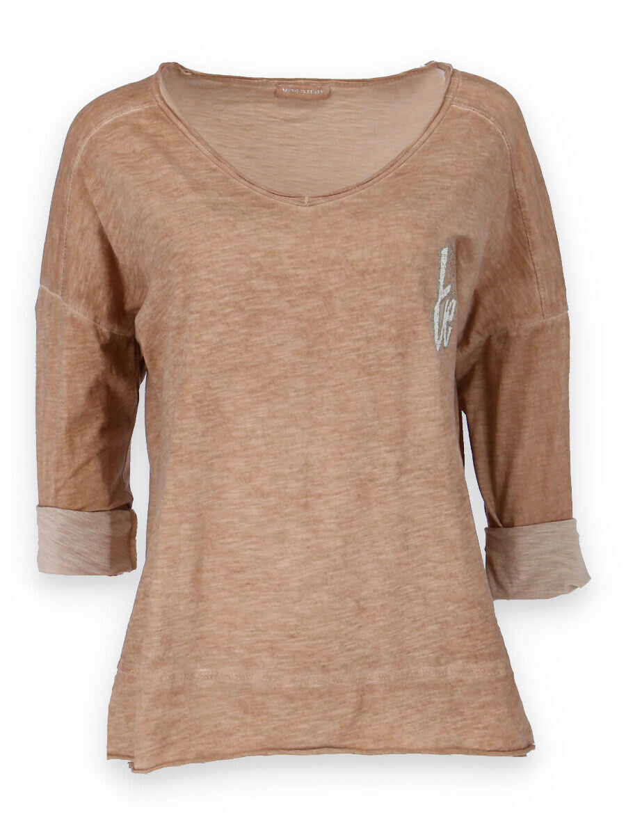Basic triko s dlouhým rukávem a aplikací na prsou. Triko je volnějšího střihu, má prodlouženou zadní délku a výstřih do V.