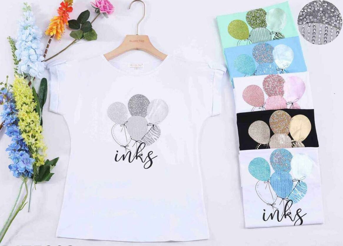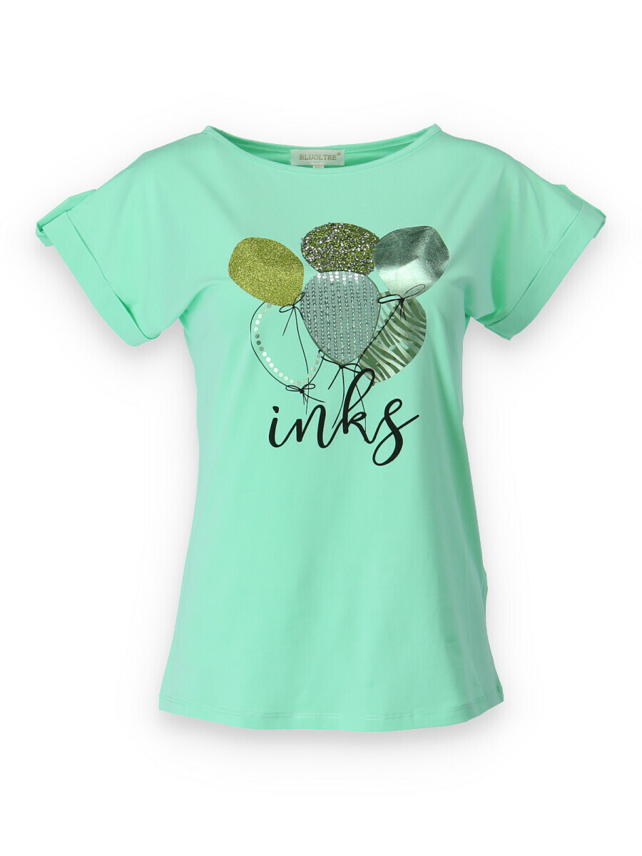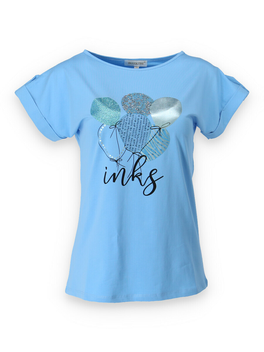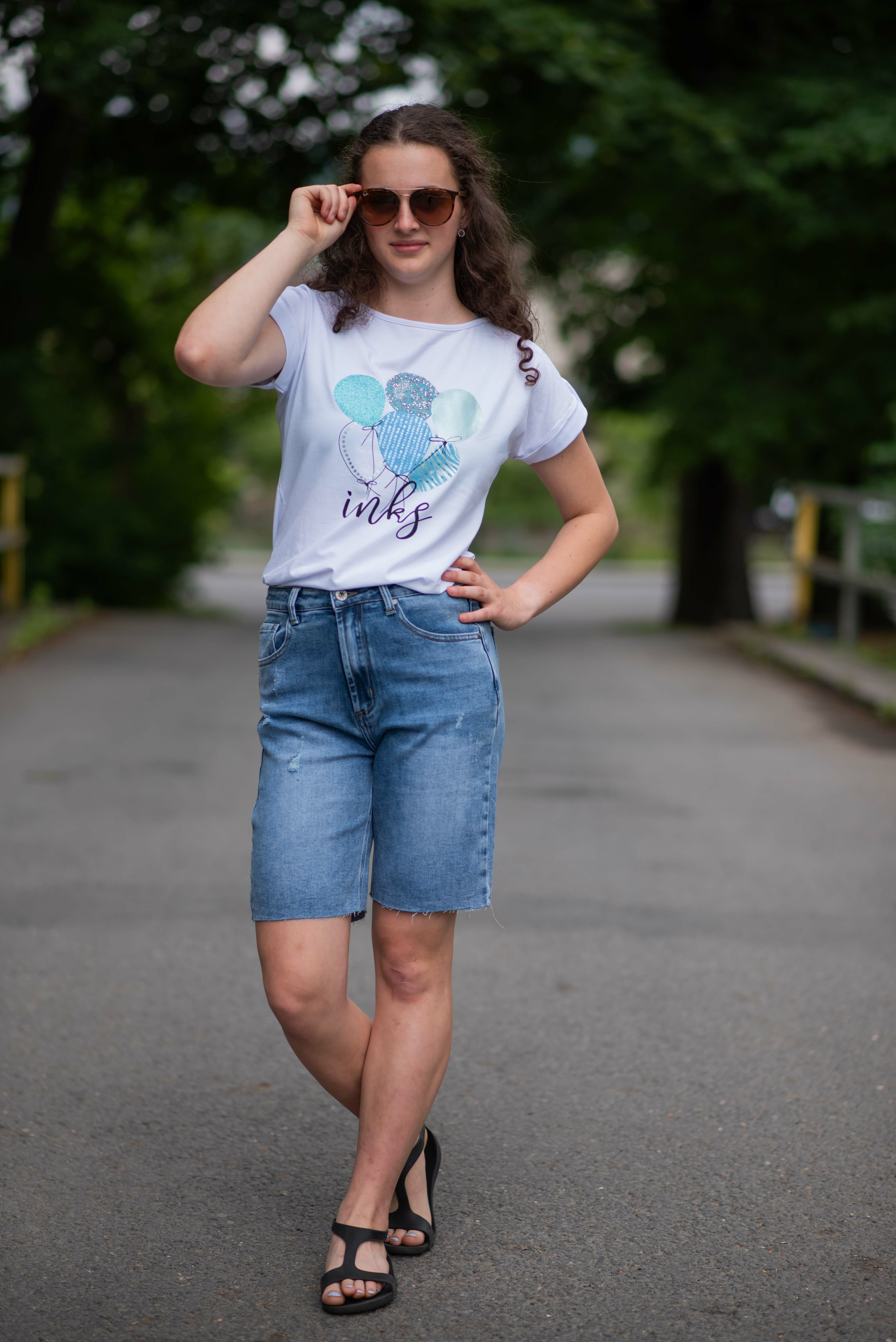 Dámské módní triko s potiskem. Triko má kulatý výstřih a krátký rukáv.