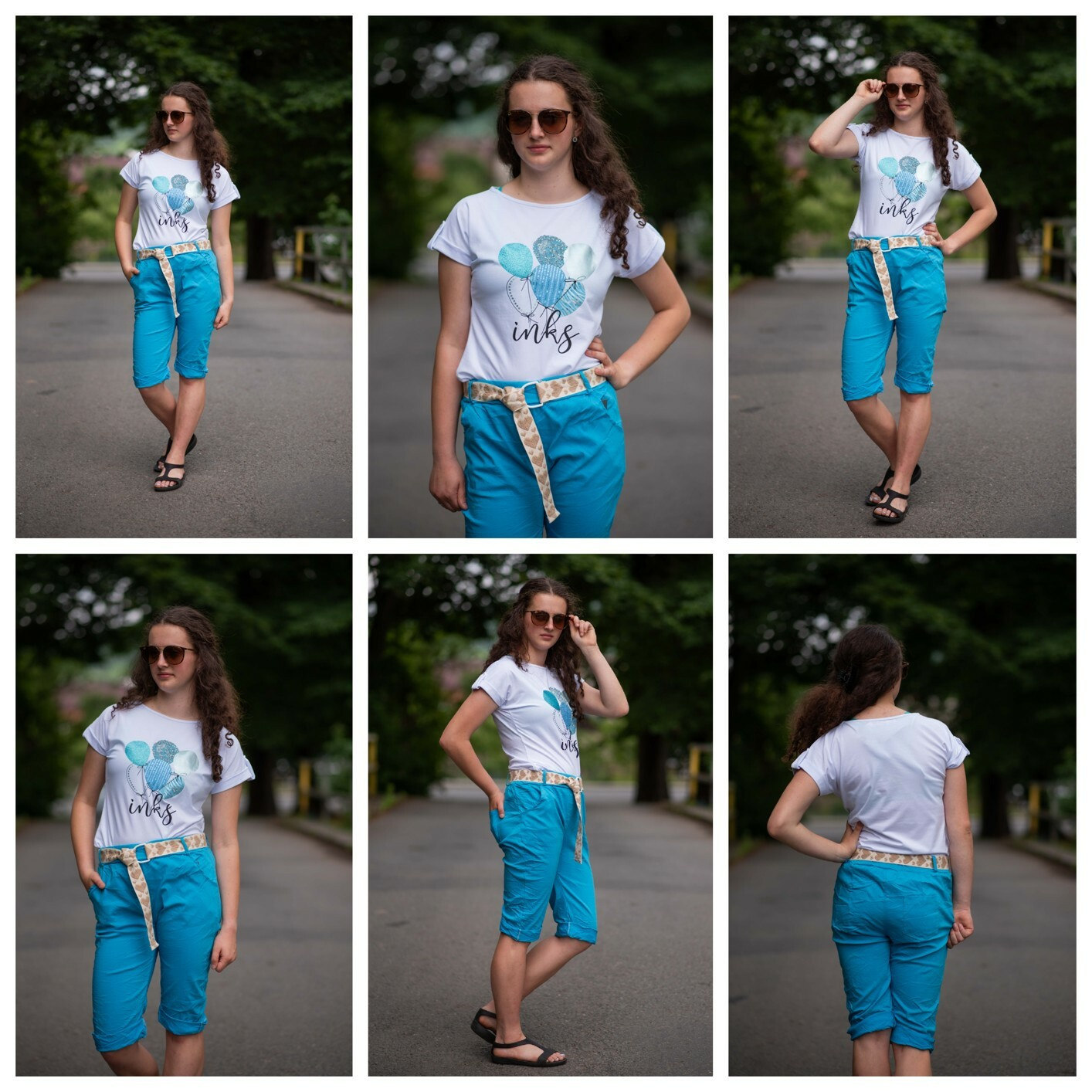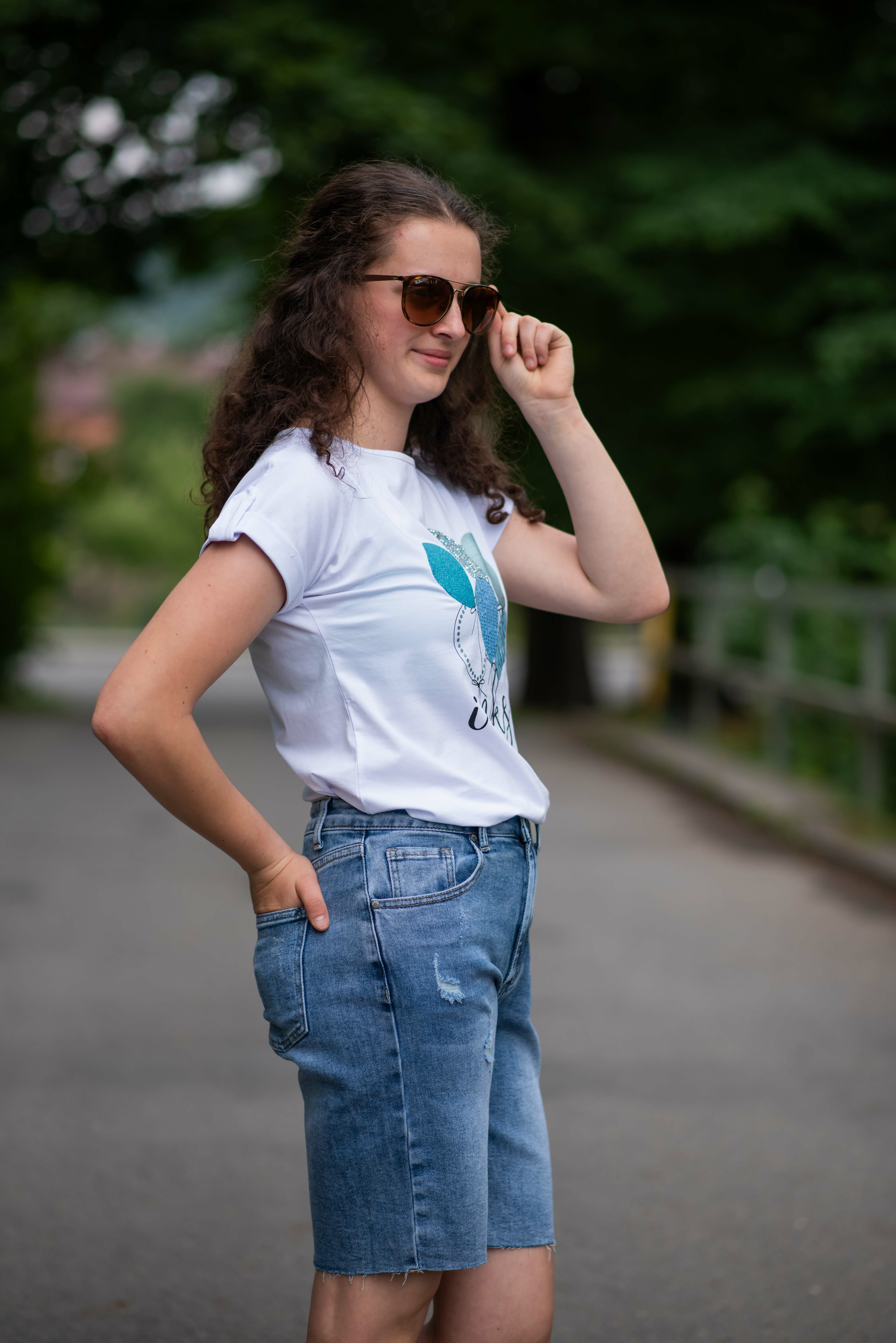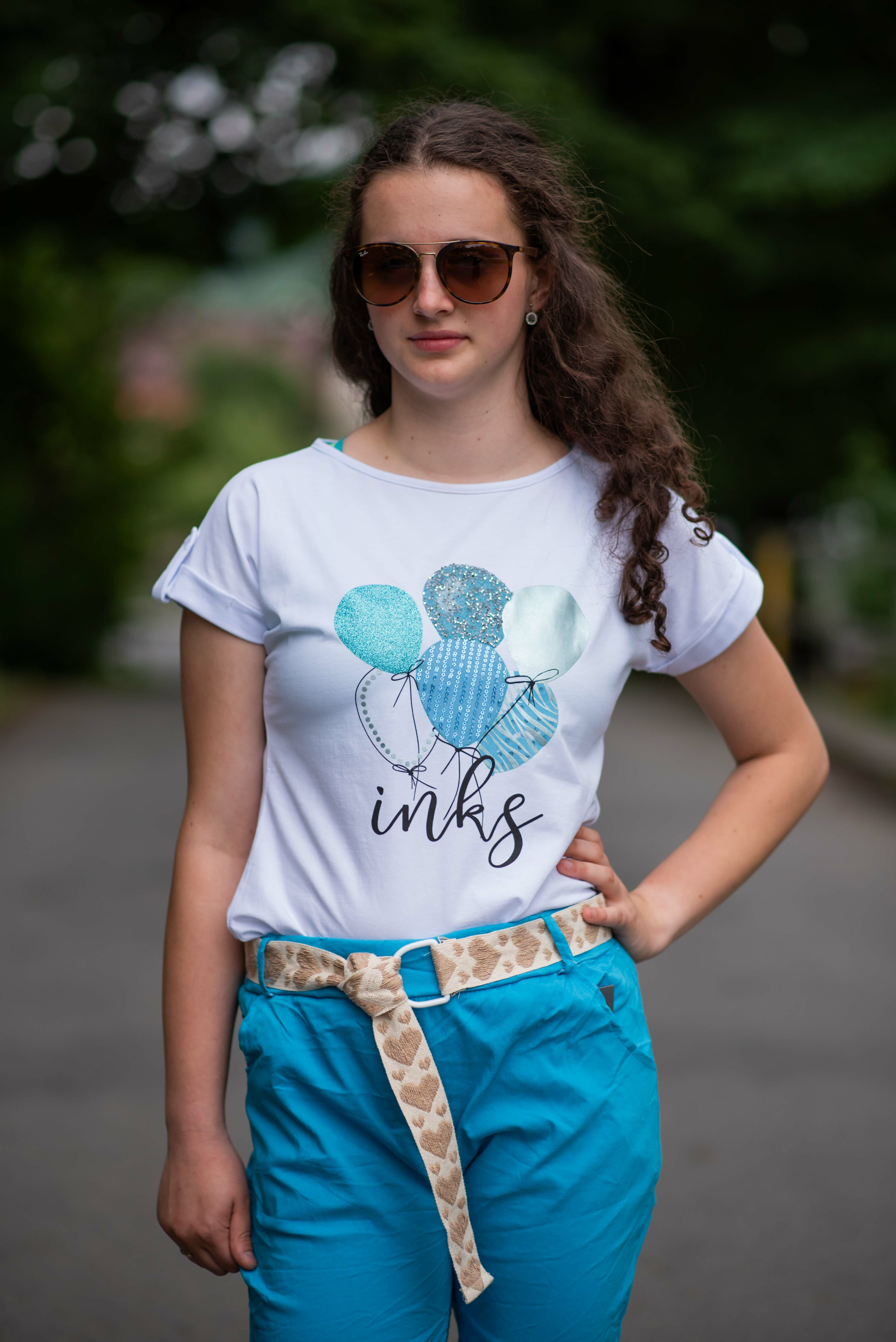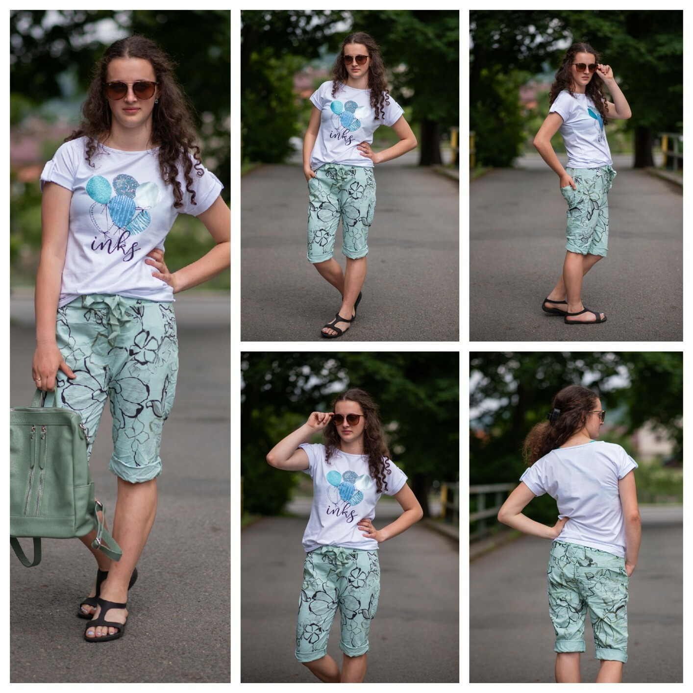 Dámské módní triko s potiskem. Triko má kulatý výstřih a krátký rukáv.