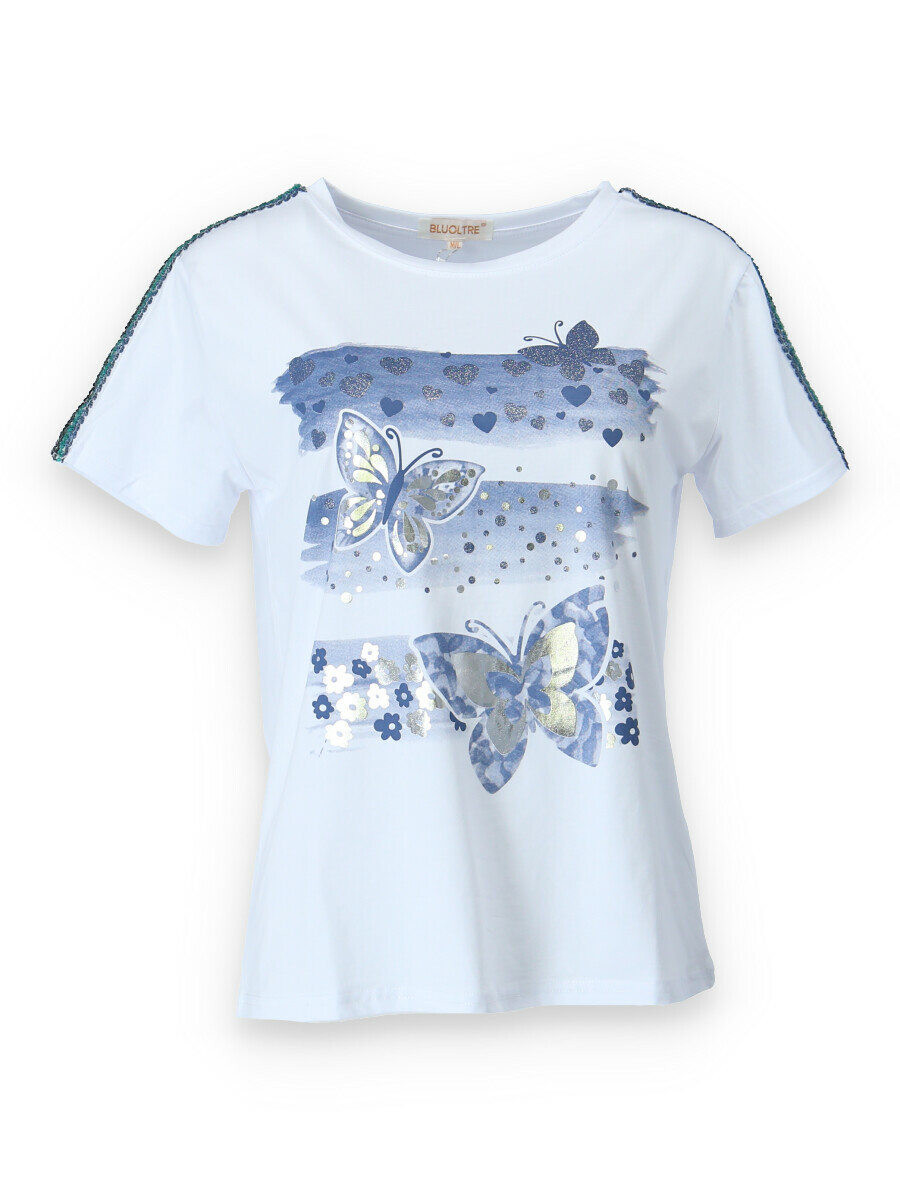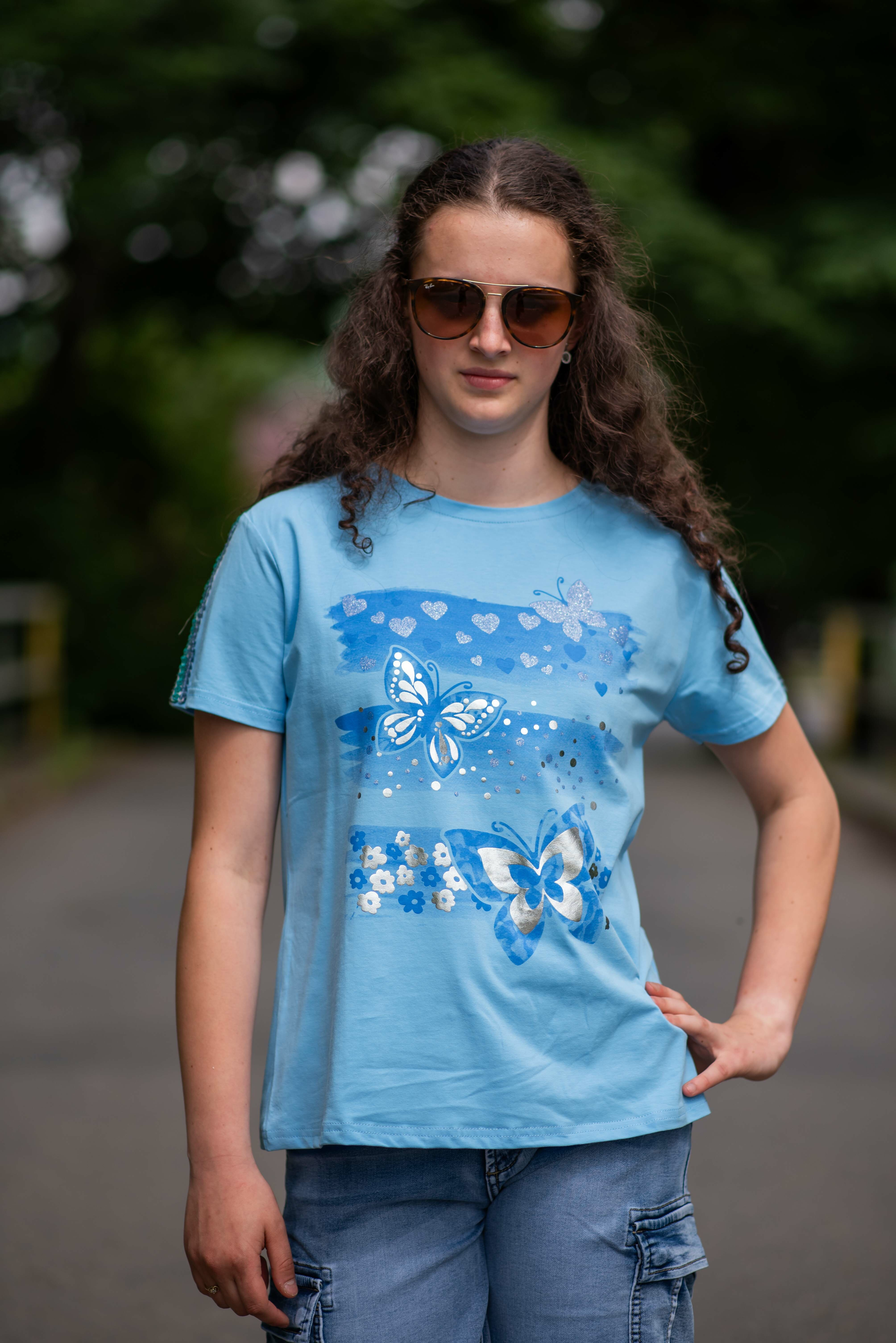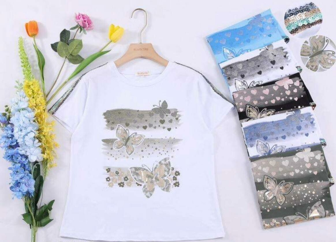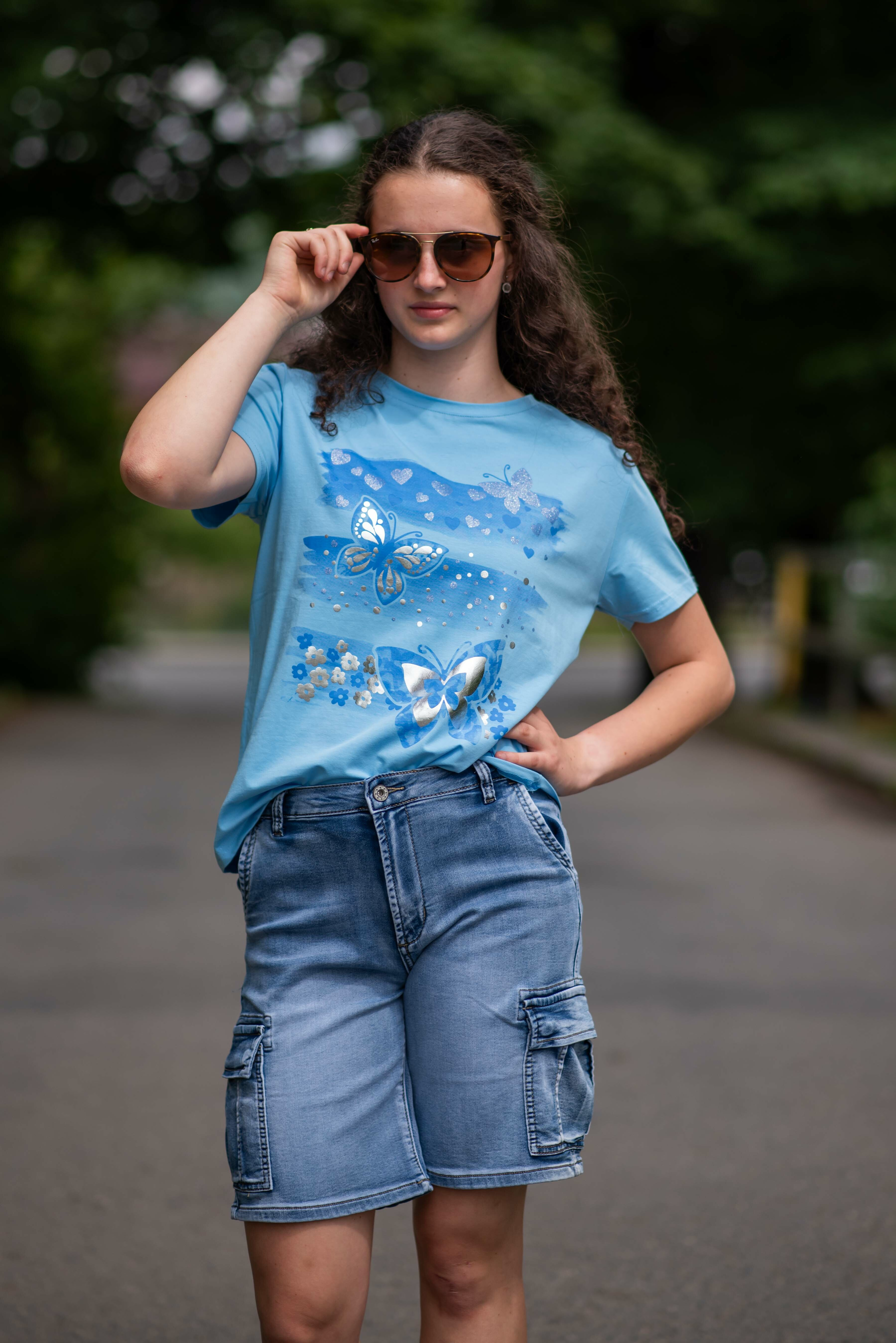 Dámské módní triko s potiskem. Triko má kulatý výstřih a krátký rukáv.