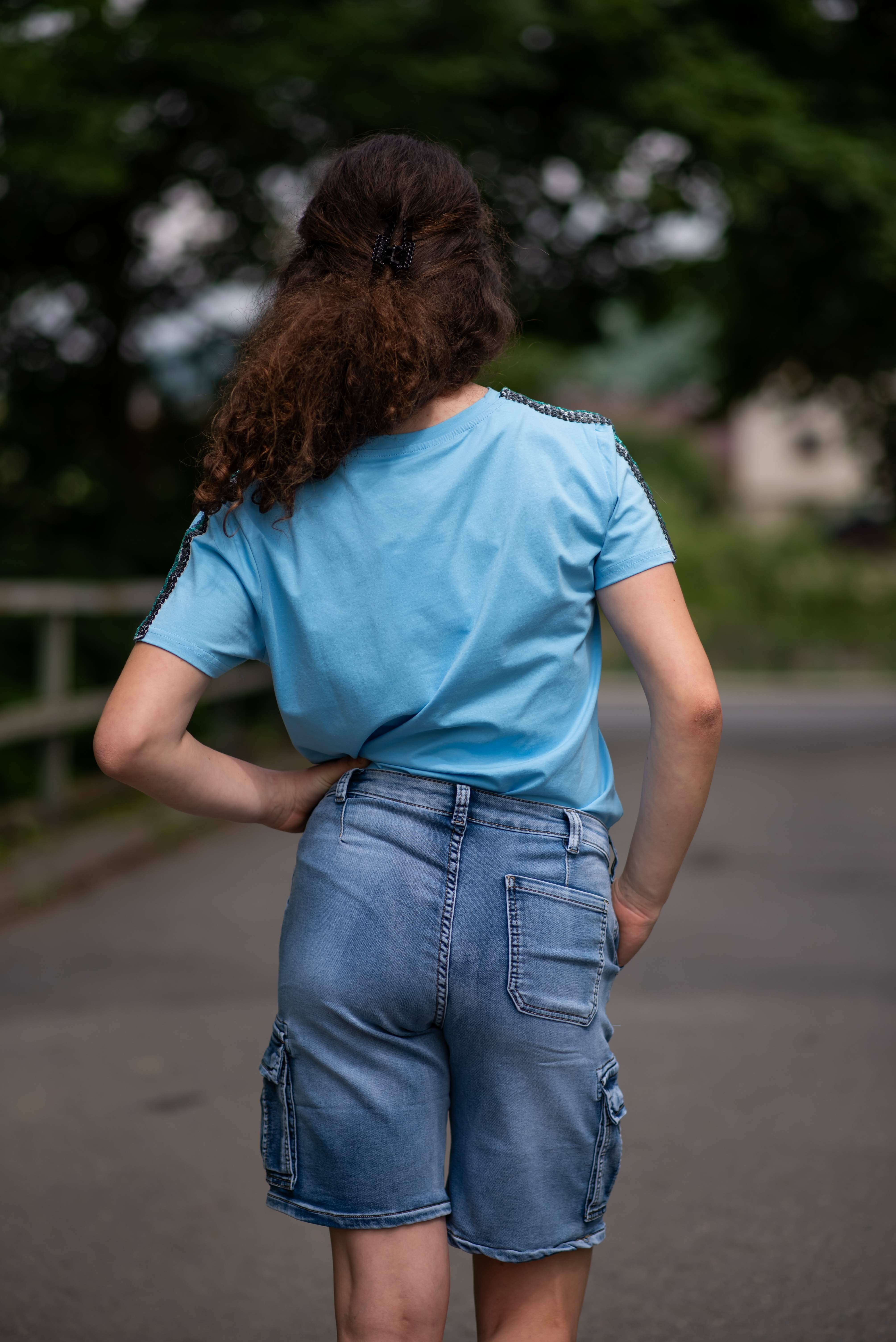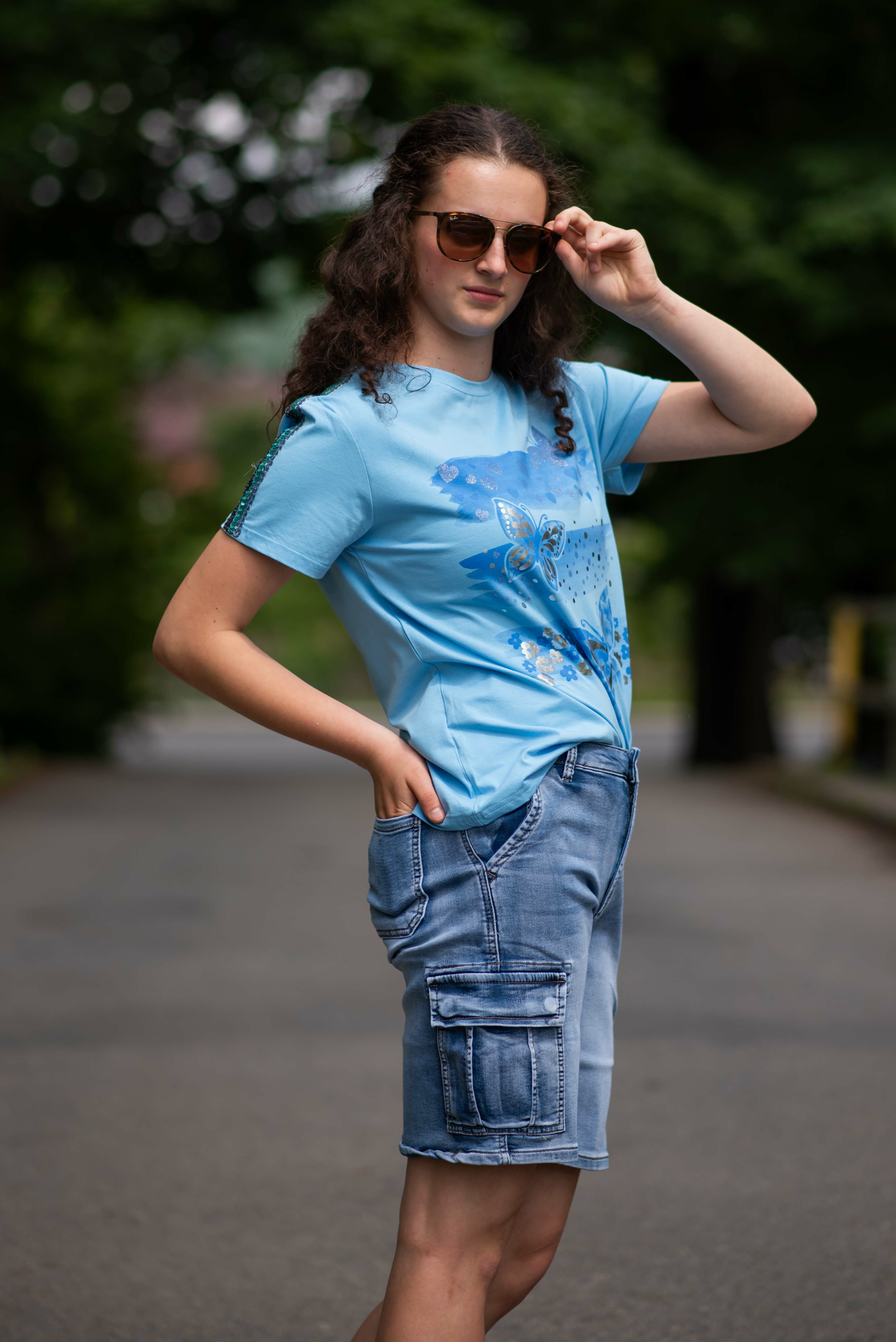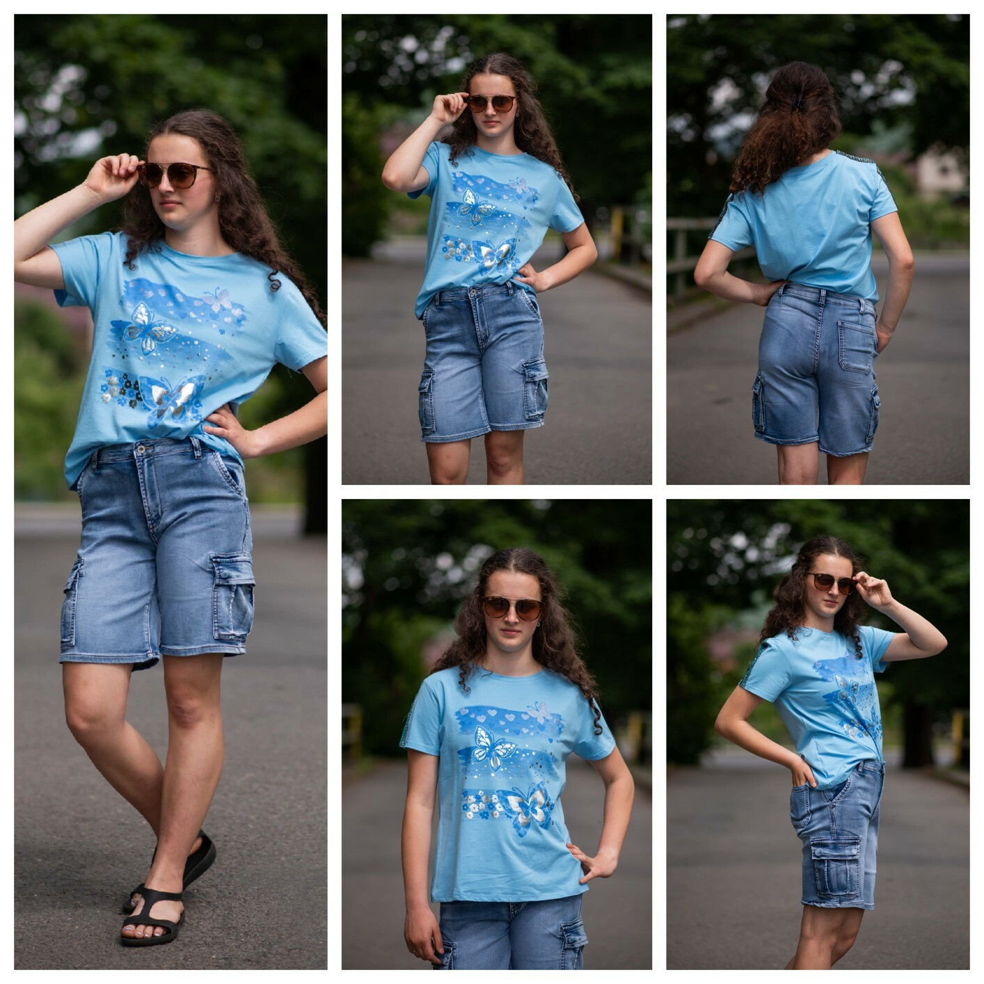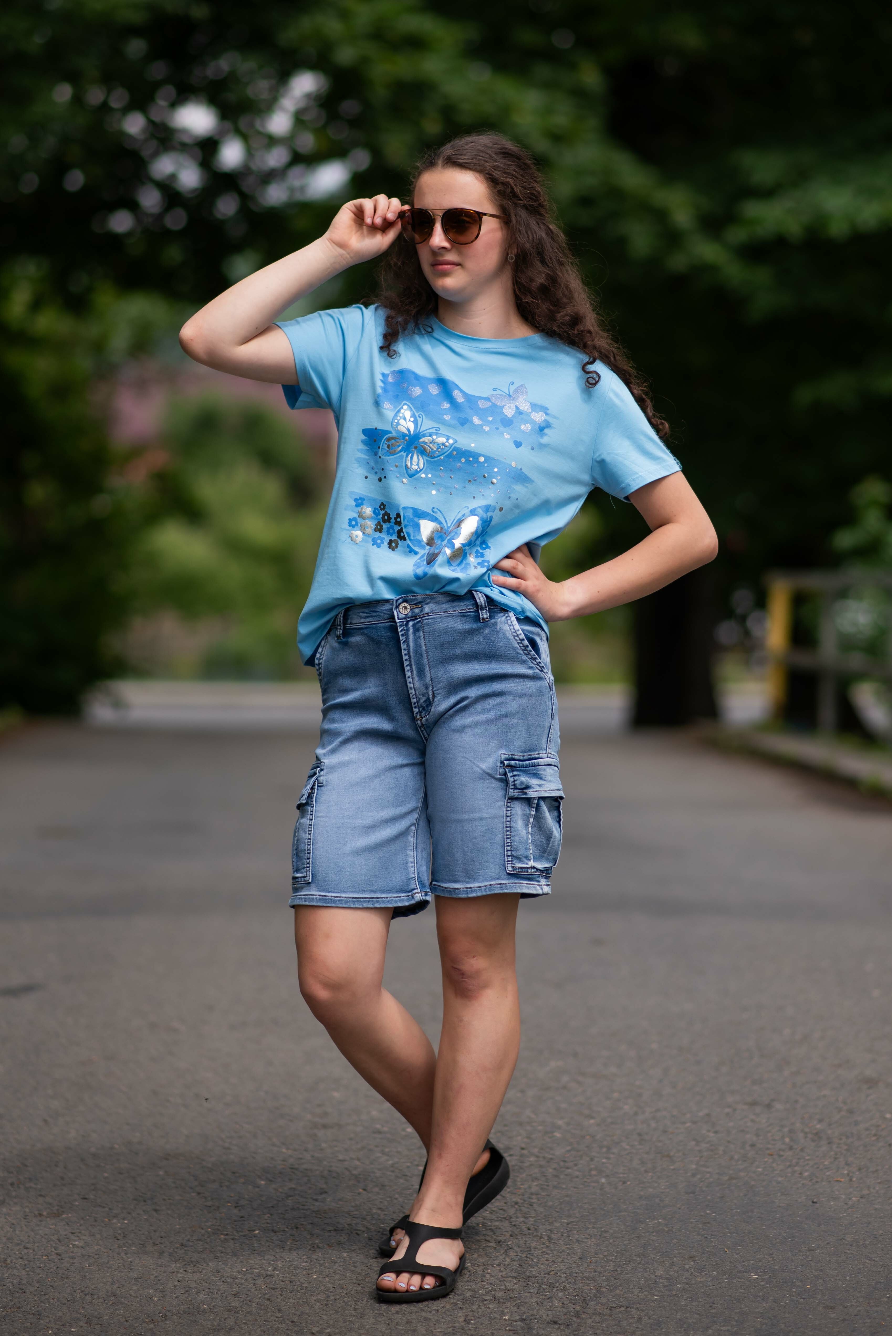Dámské módní triko s potiskem. Triko má kulatý výstřih a krátký rukáv.