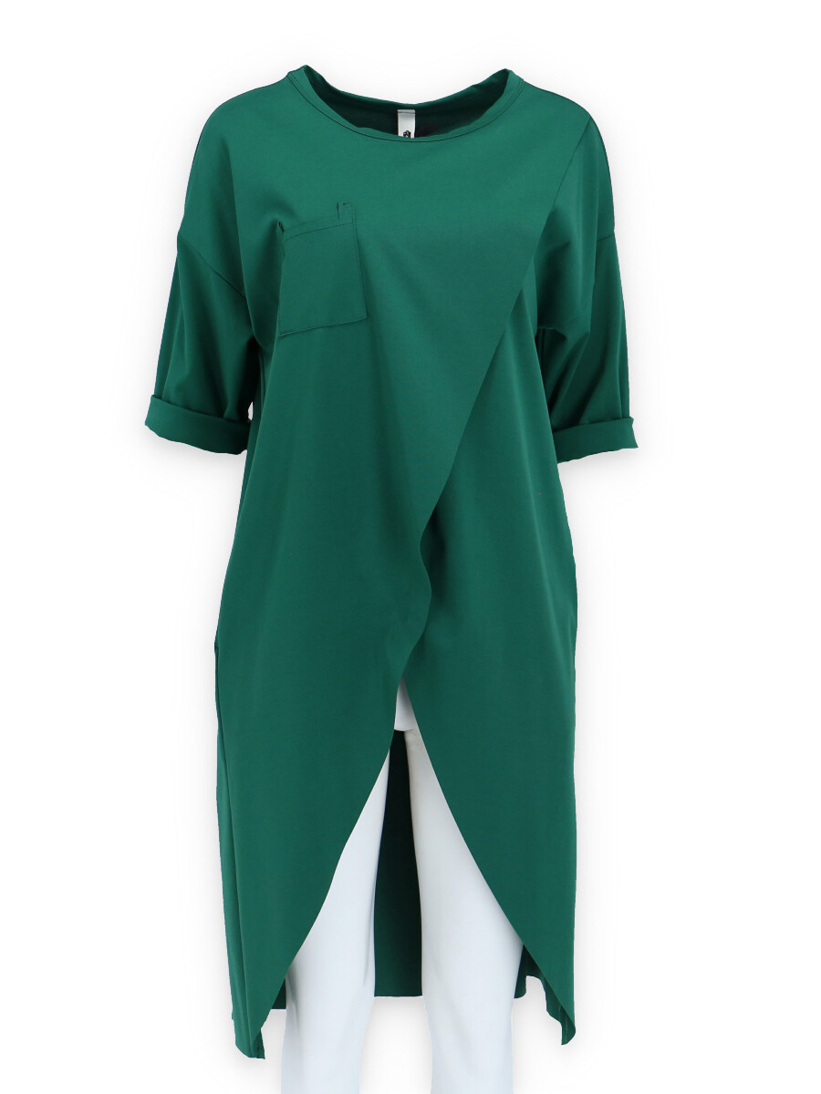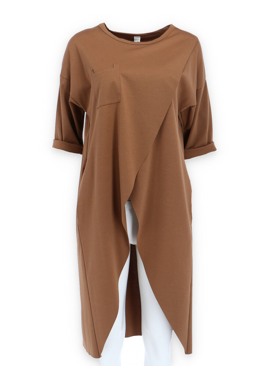 Dlouhá asymetrická tunika, volný střih, 3/4 rukáv, všité kapsy, vhodný doplněk k jeansovým kalhotám
