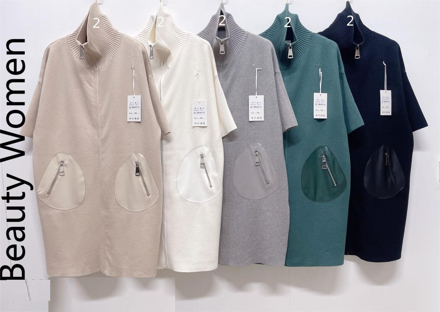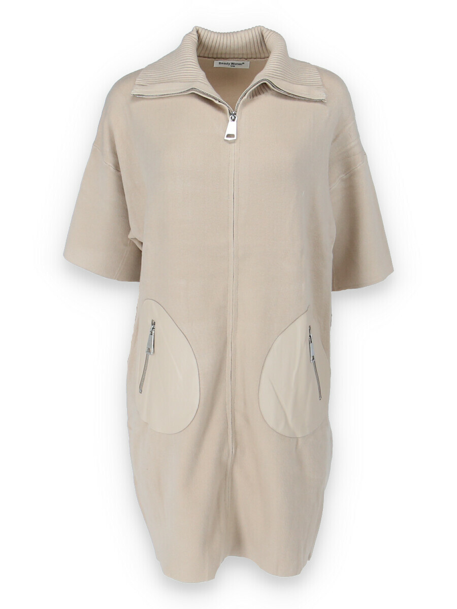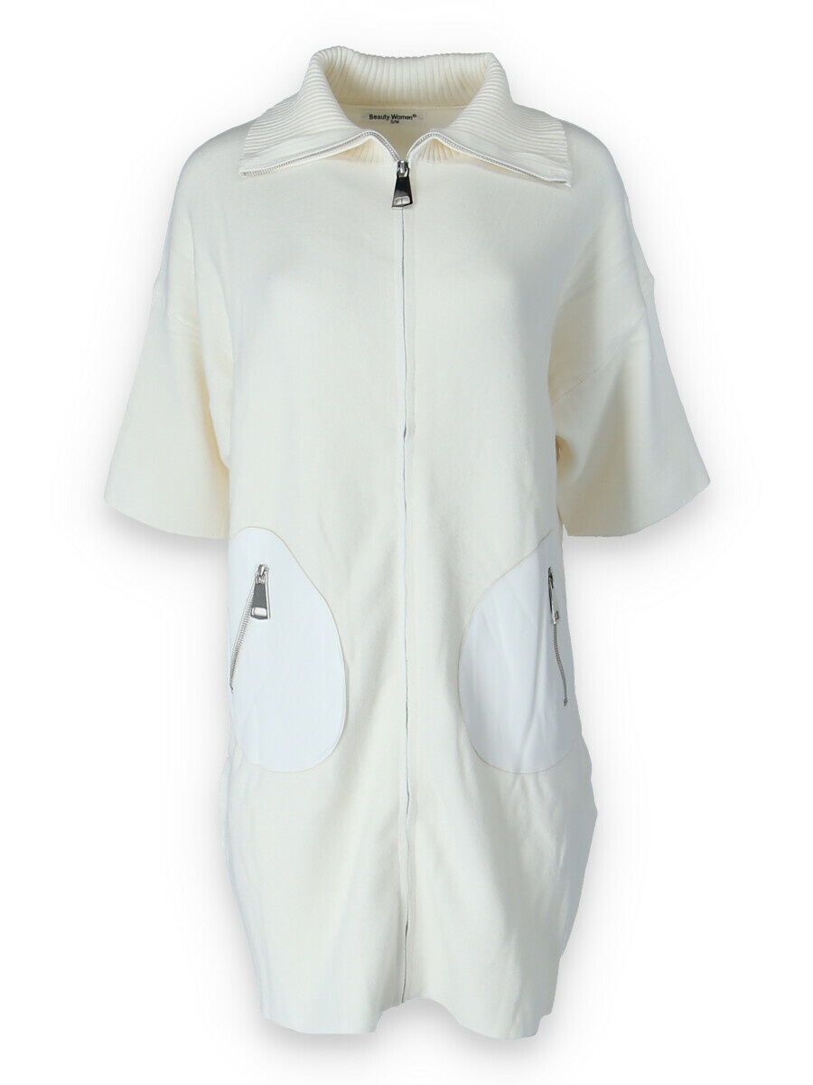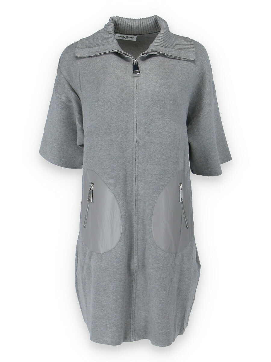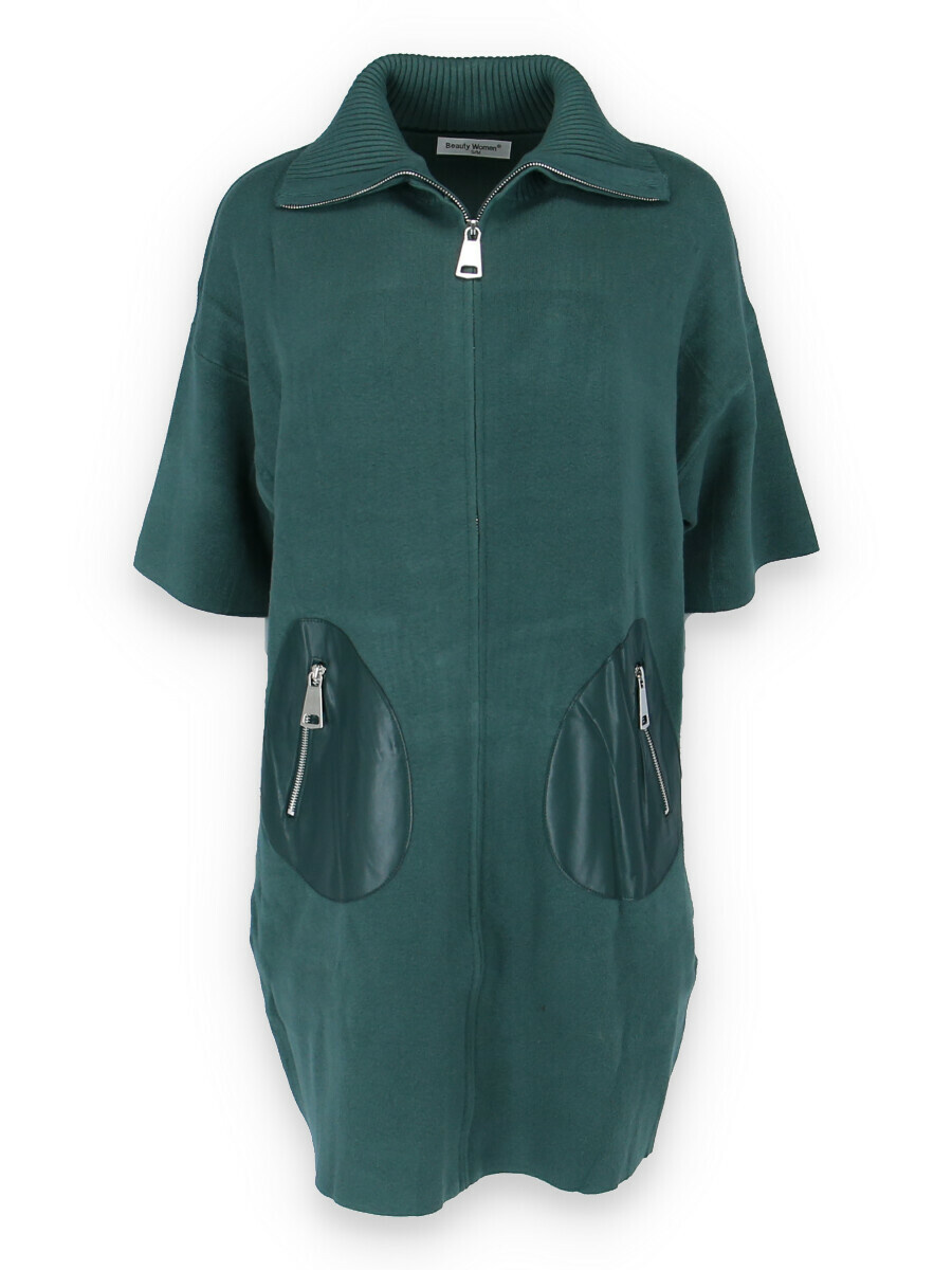 Tunika/svetr na zip úplet BW05870 Itálie. Delší úpletový svetřík/kabátek s rolákem, který lze zvolit jako svrchní část outfitu. Vhodné také k legínám nebo džínám. Na přední části všité kapsy na zip.