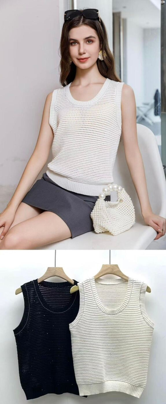 Trendy vesta úpletová s jemnou aplikací flitrů. Vesta má kulatý výstřih.