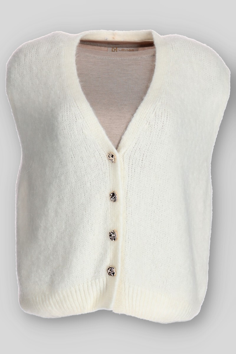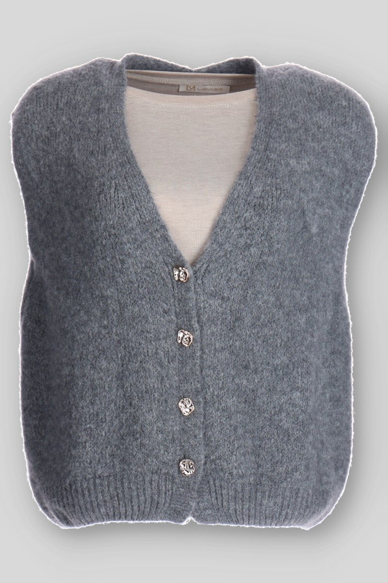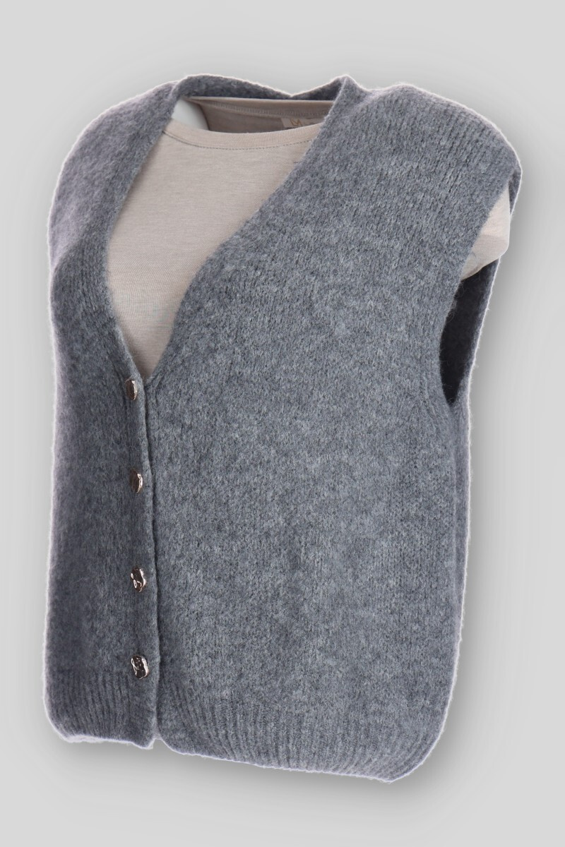 Vlněná vesta propínací volnějšího střihu. Vesta má véčkový výstřih.