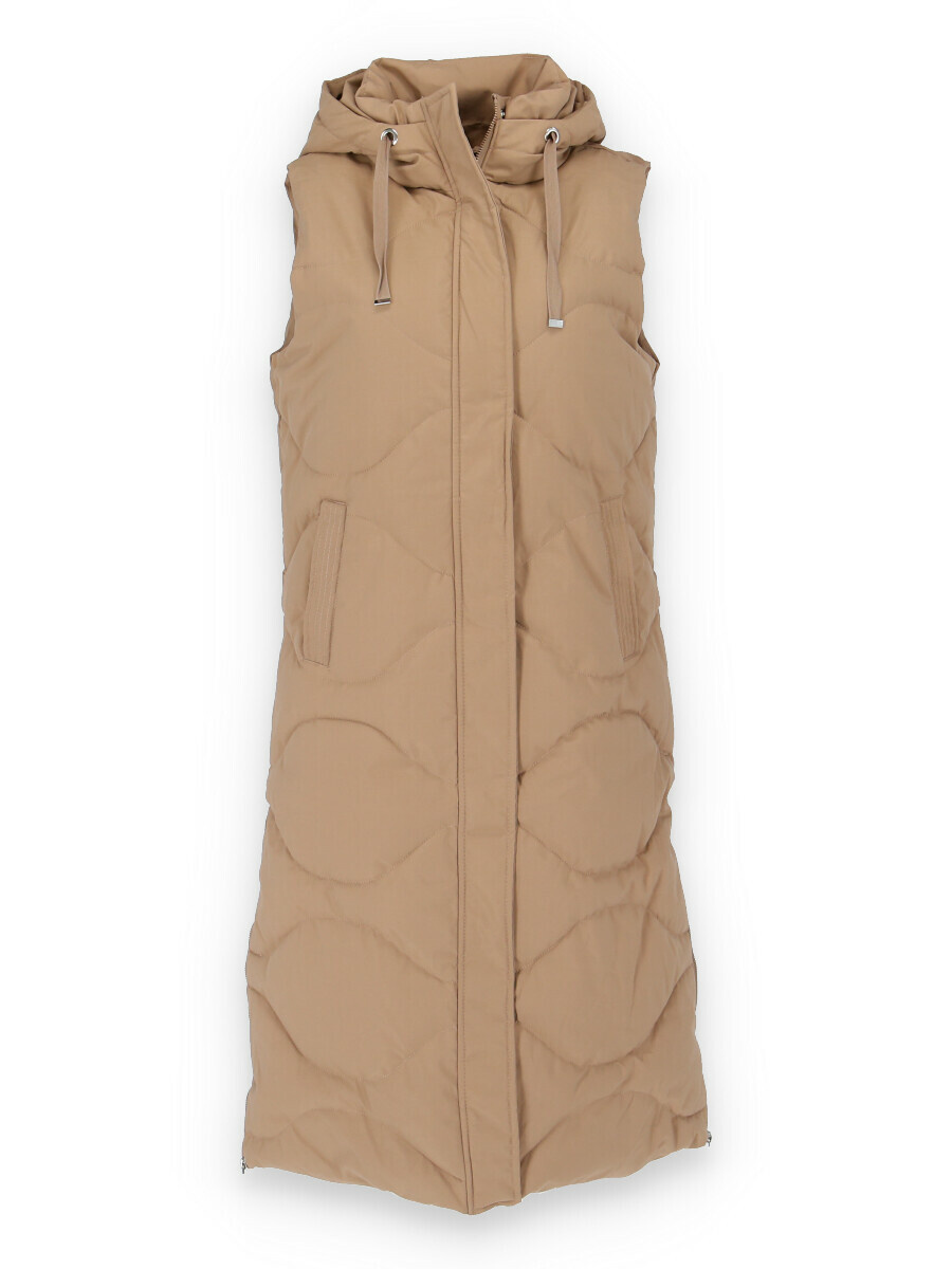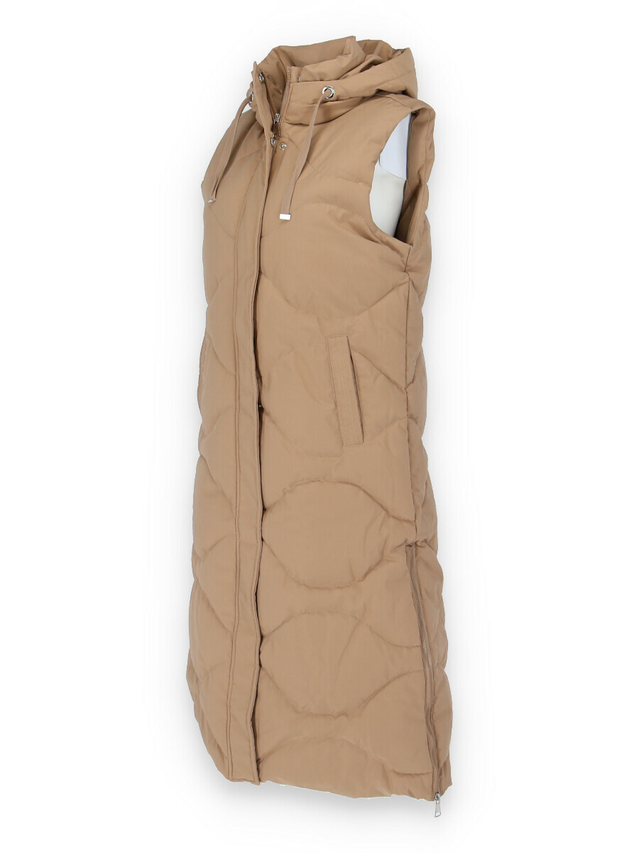 Dámská delší zimní vesta s kapucí , ve spodní části zip po stranách . Odnímatelná kapuce