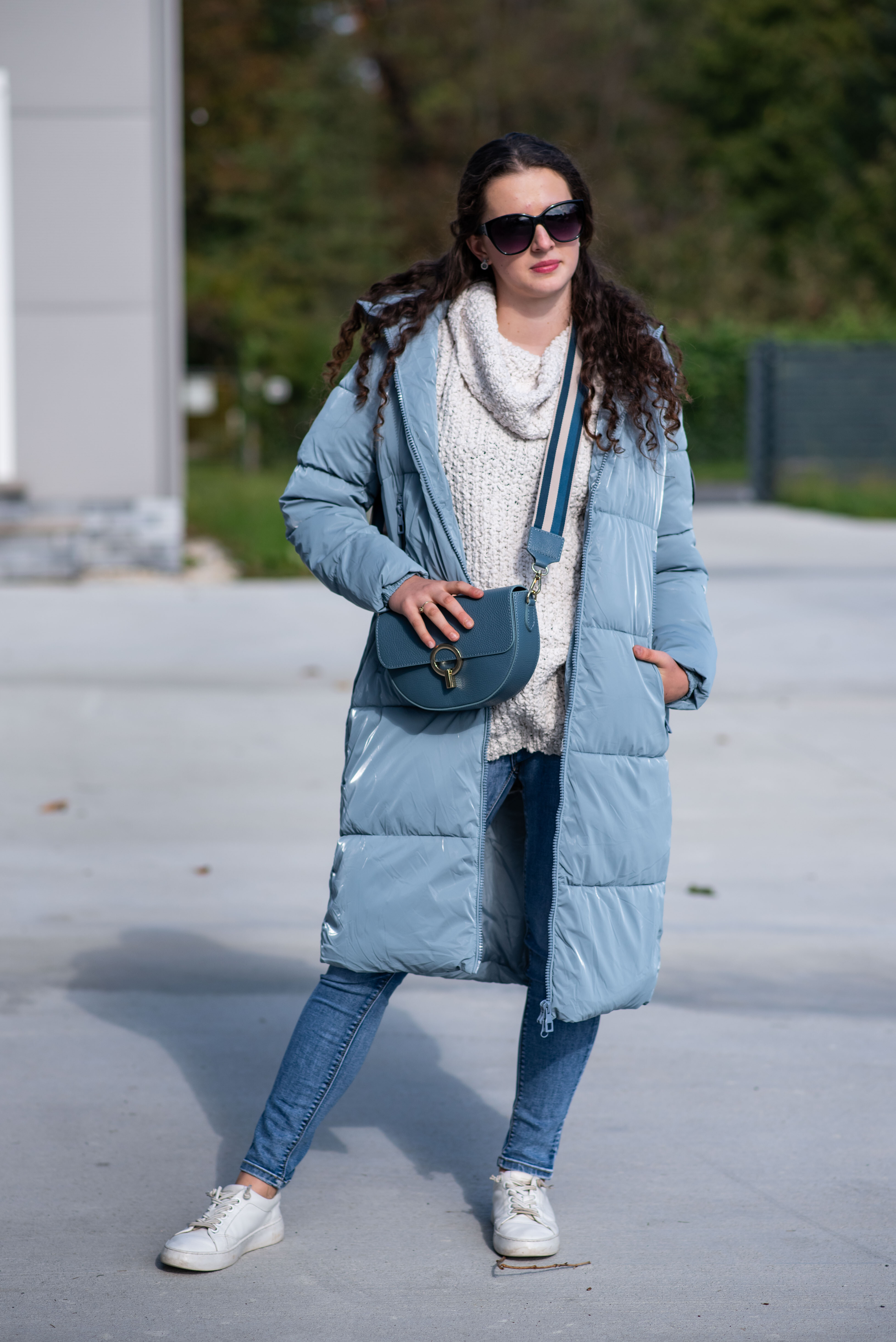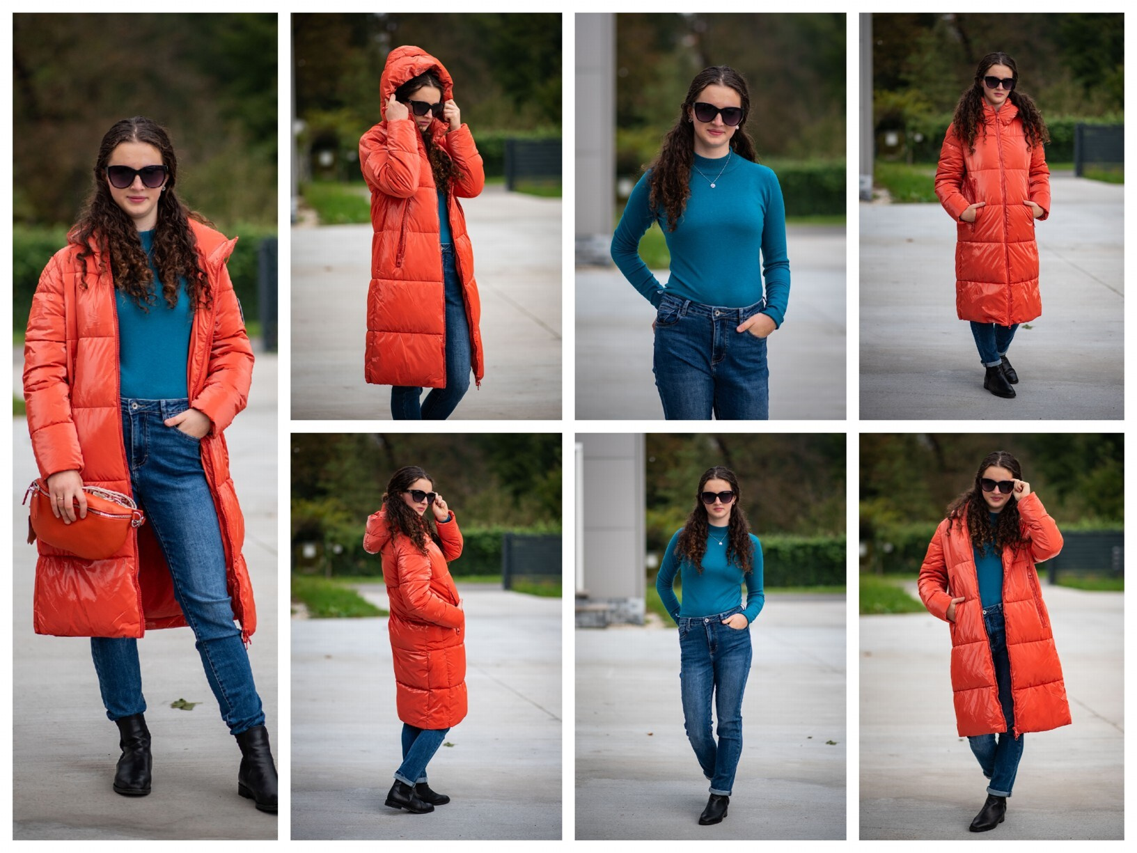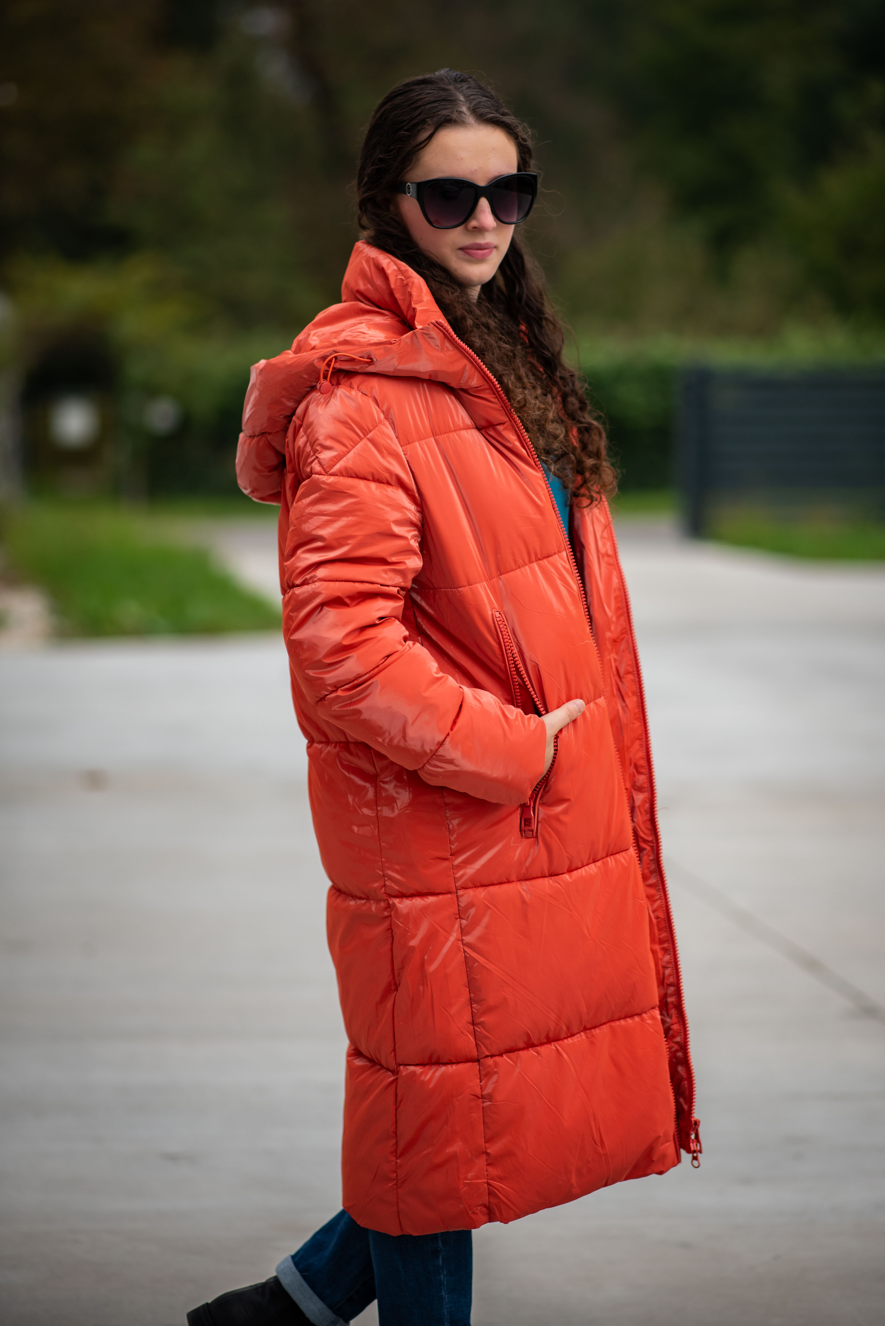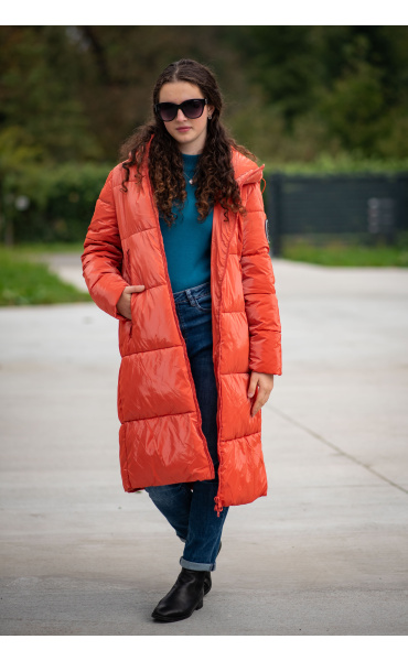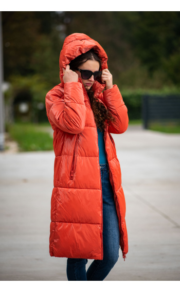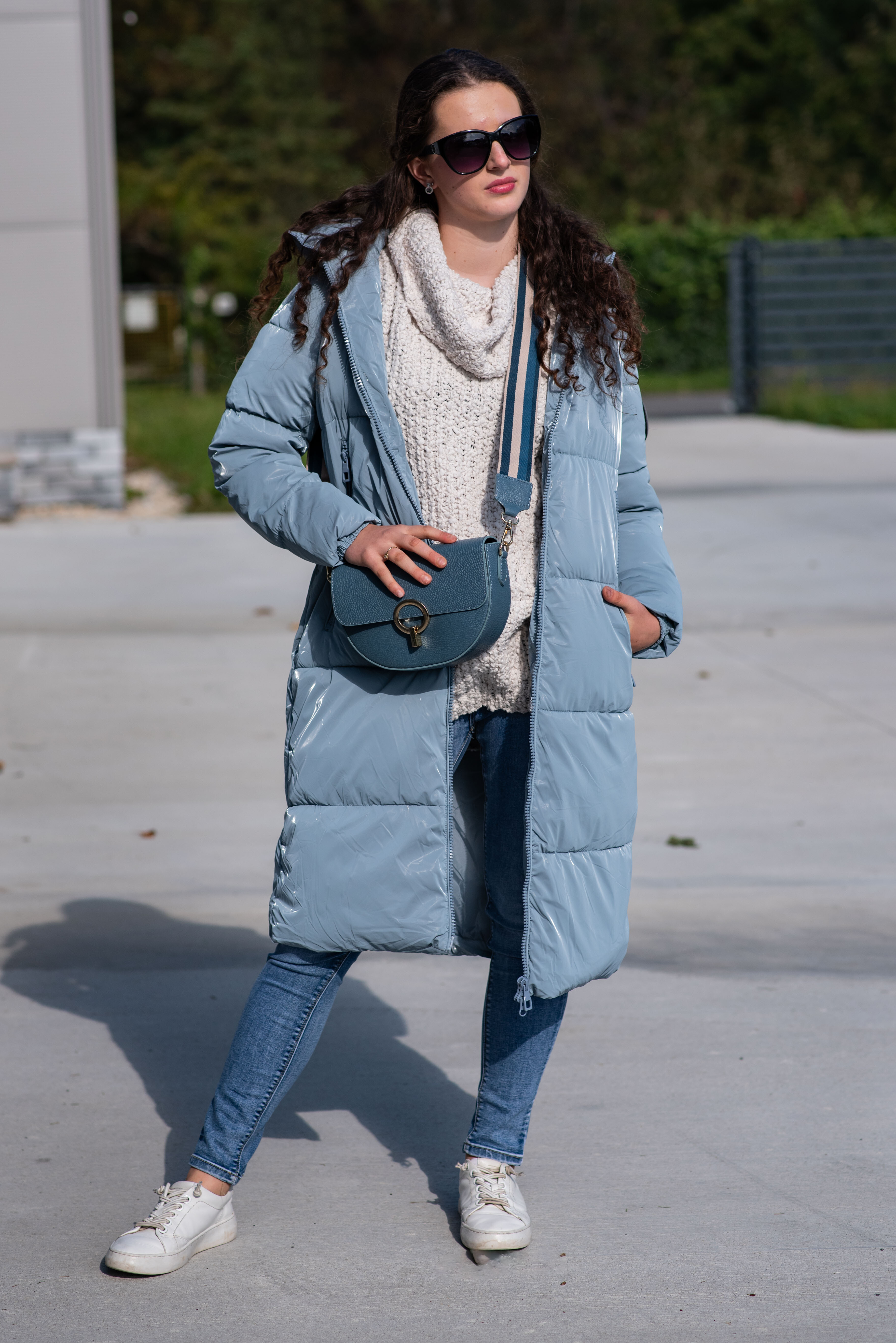 Módní delší zimní bunda s odepínací kapucí , vnitřní kapsa na mobil. Itálie