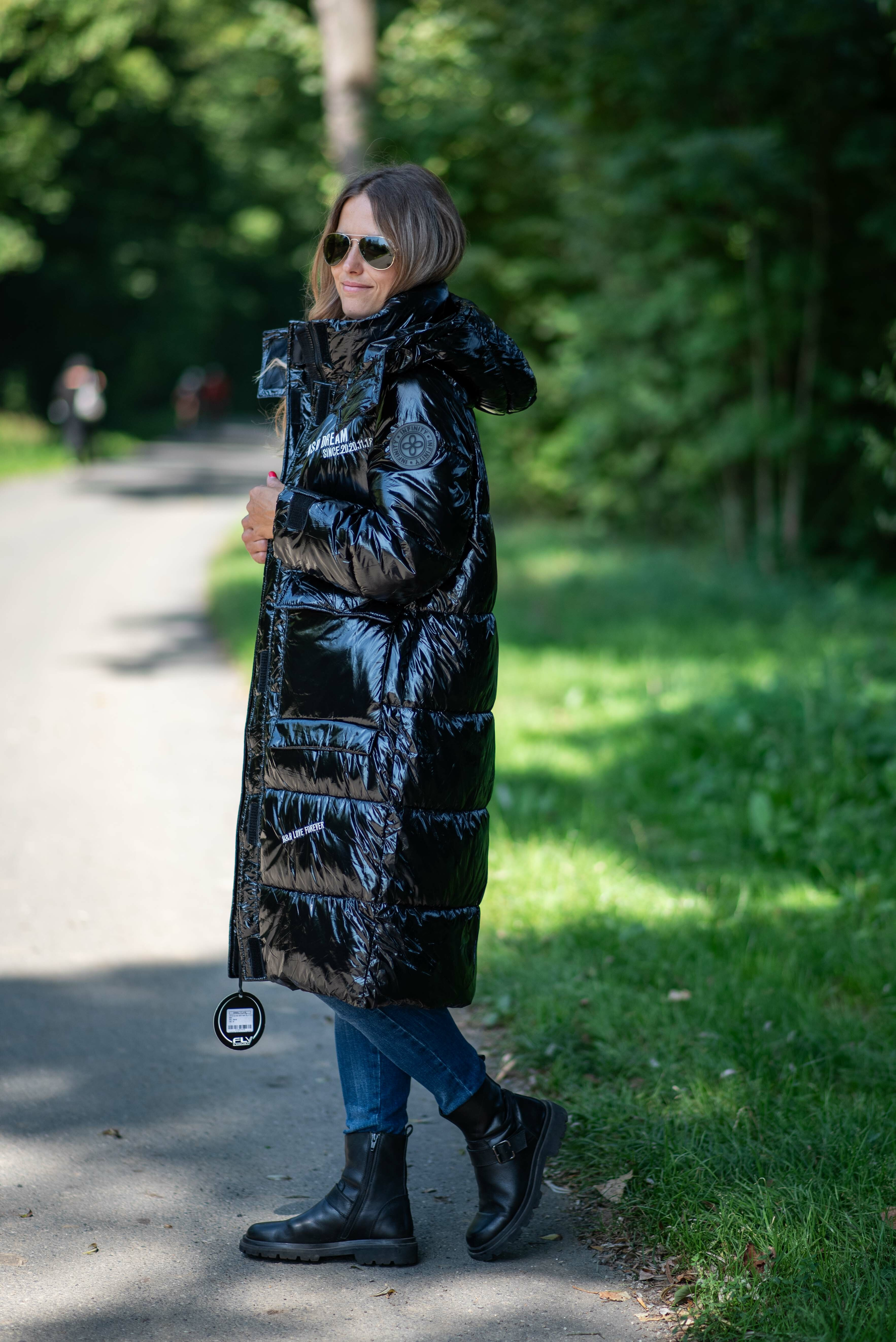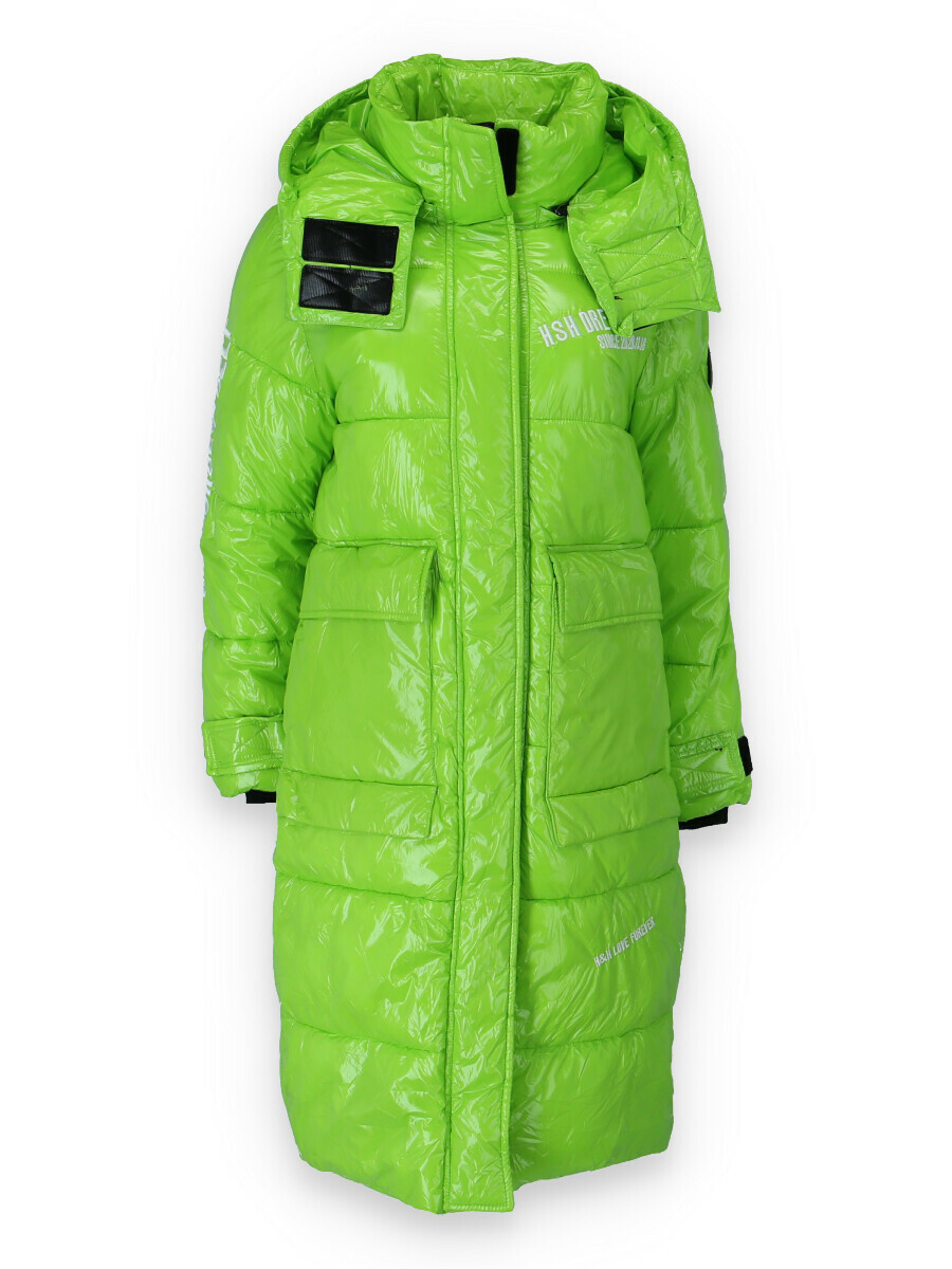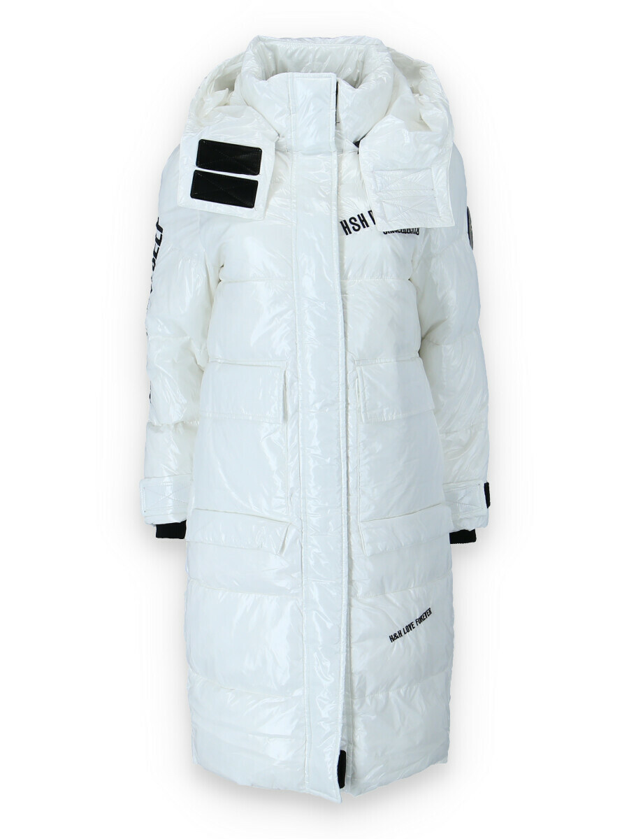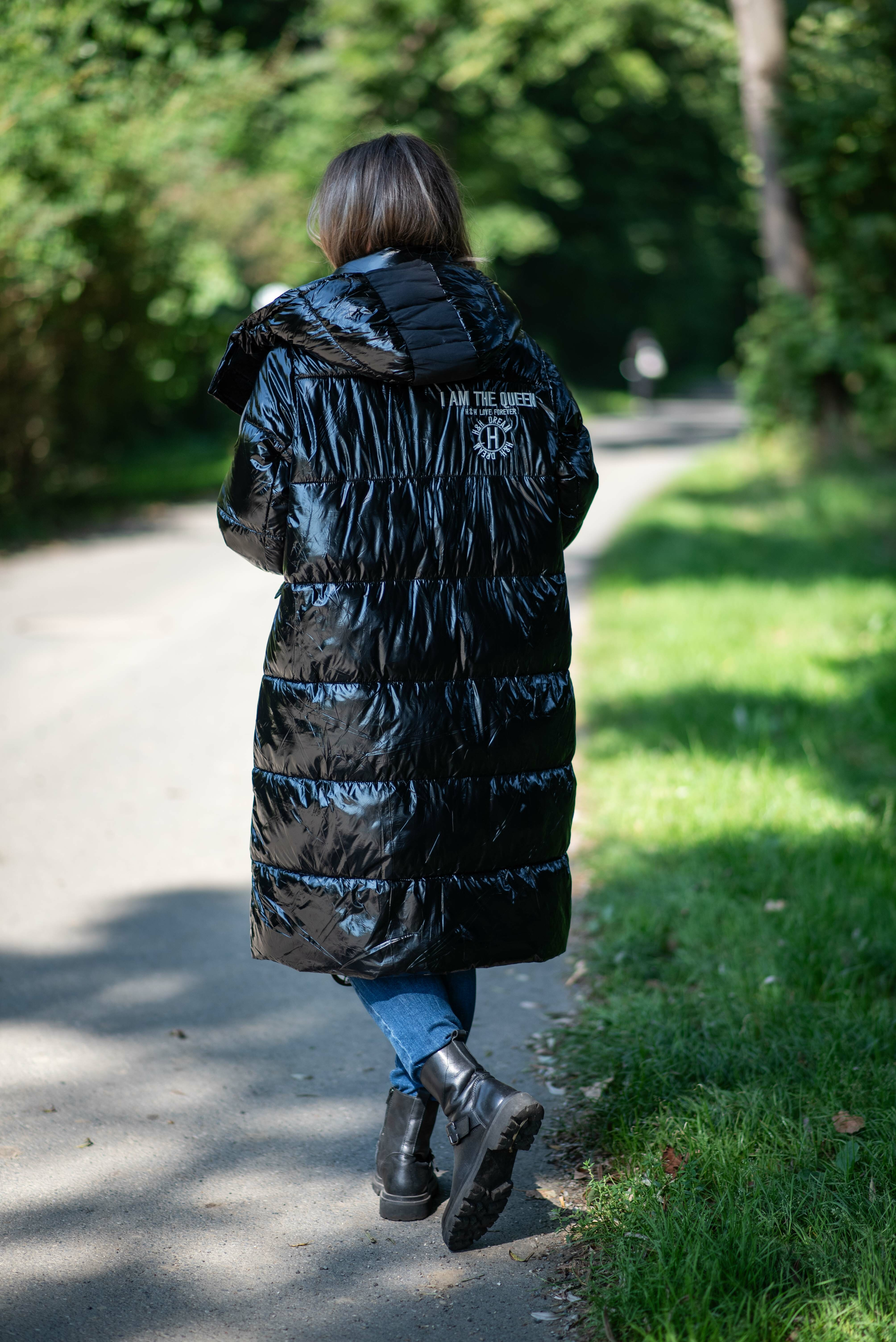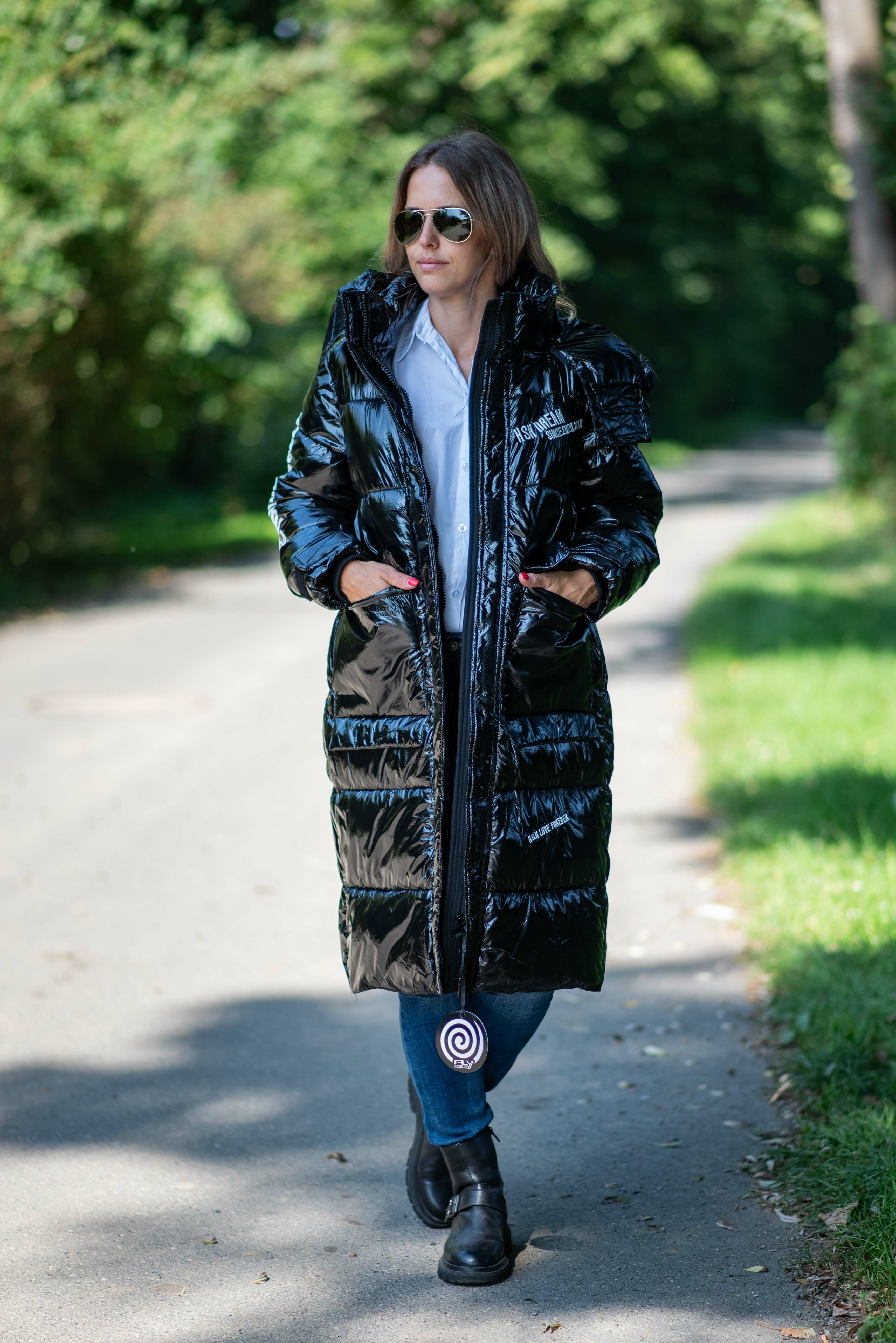 Módní delší zimní bunda kapucí lesklá odnímatelná kapuce. Itálie