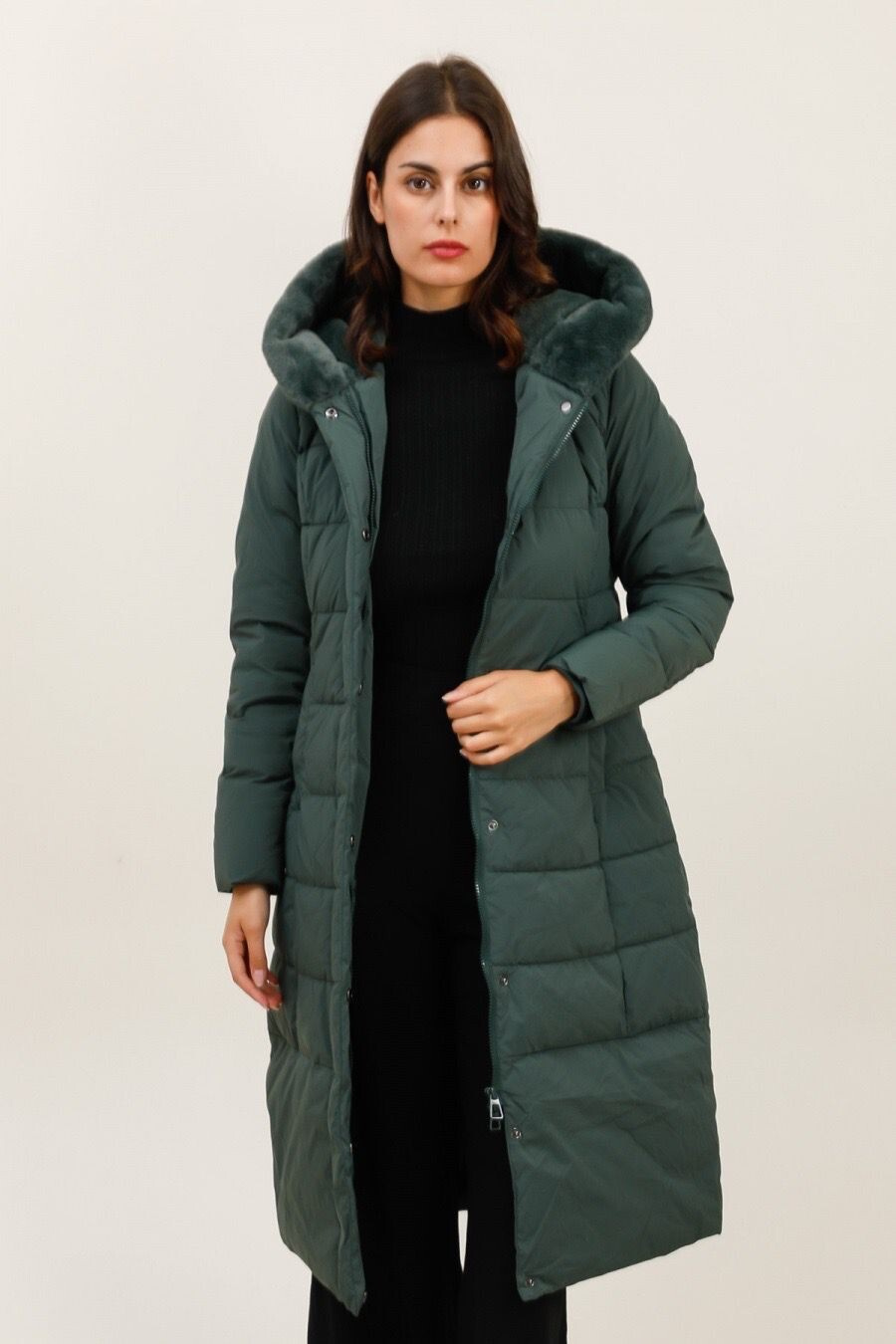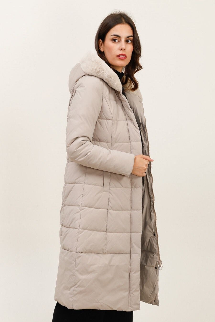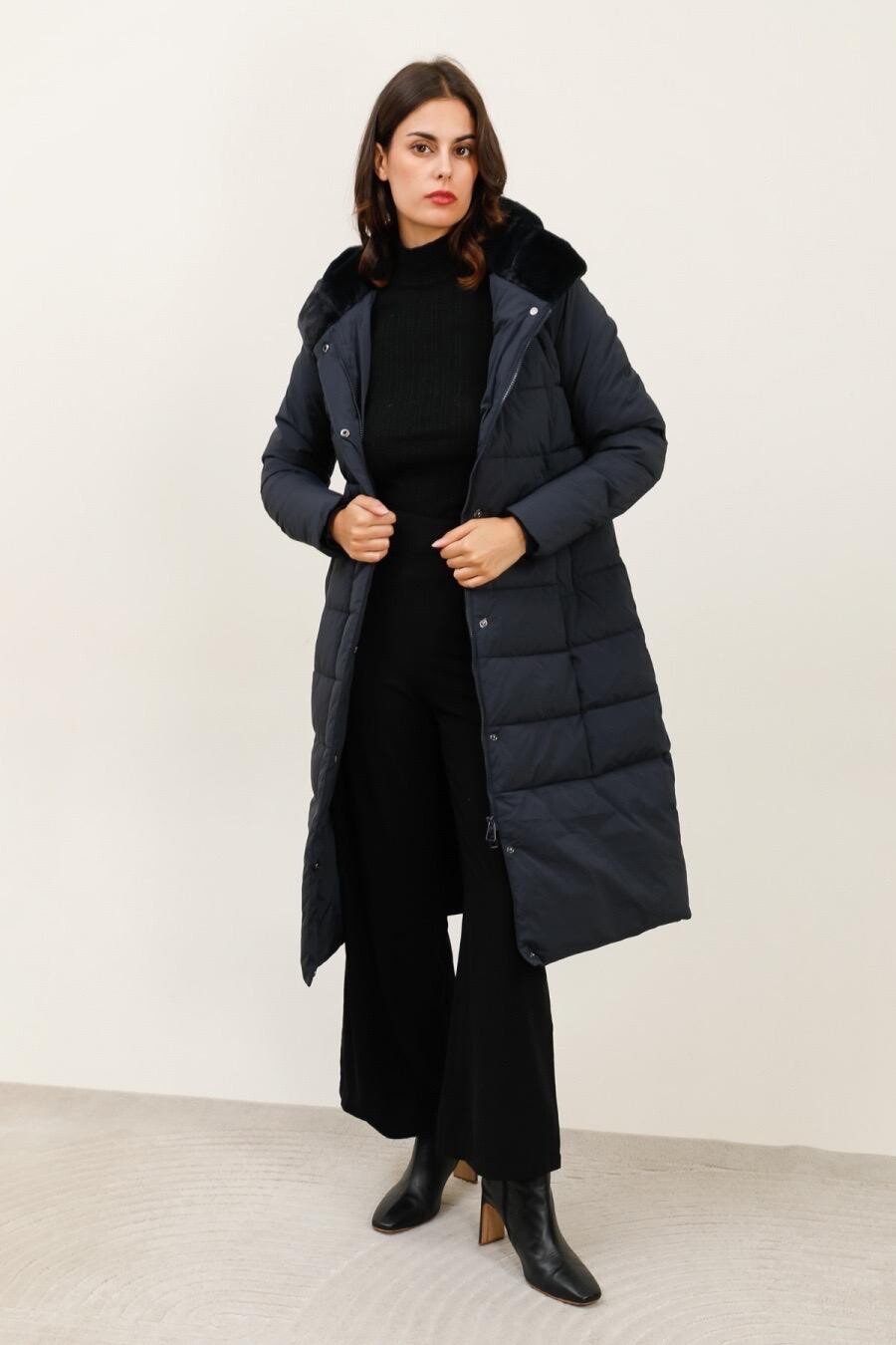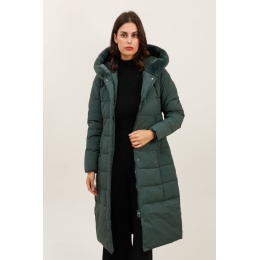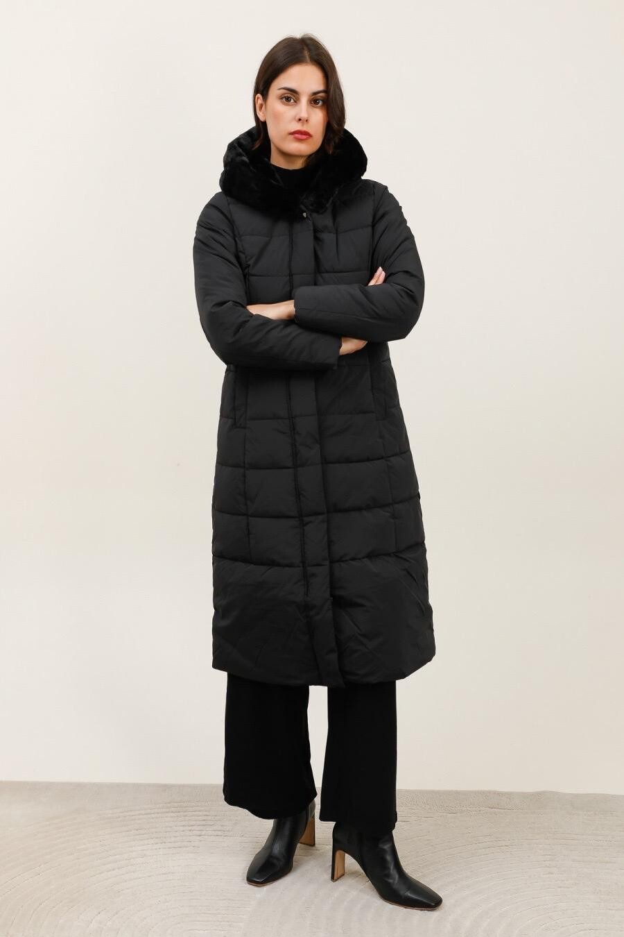 Módní prošívaný zimní kabát dlouhý. Kabát má zapínání na zip s klopou na druky, kožešinovou kapuci a všité kapsy po stranách.