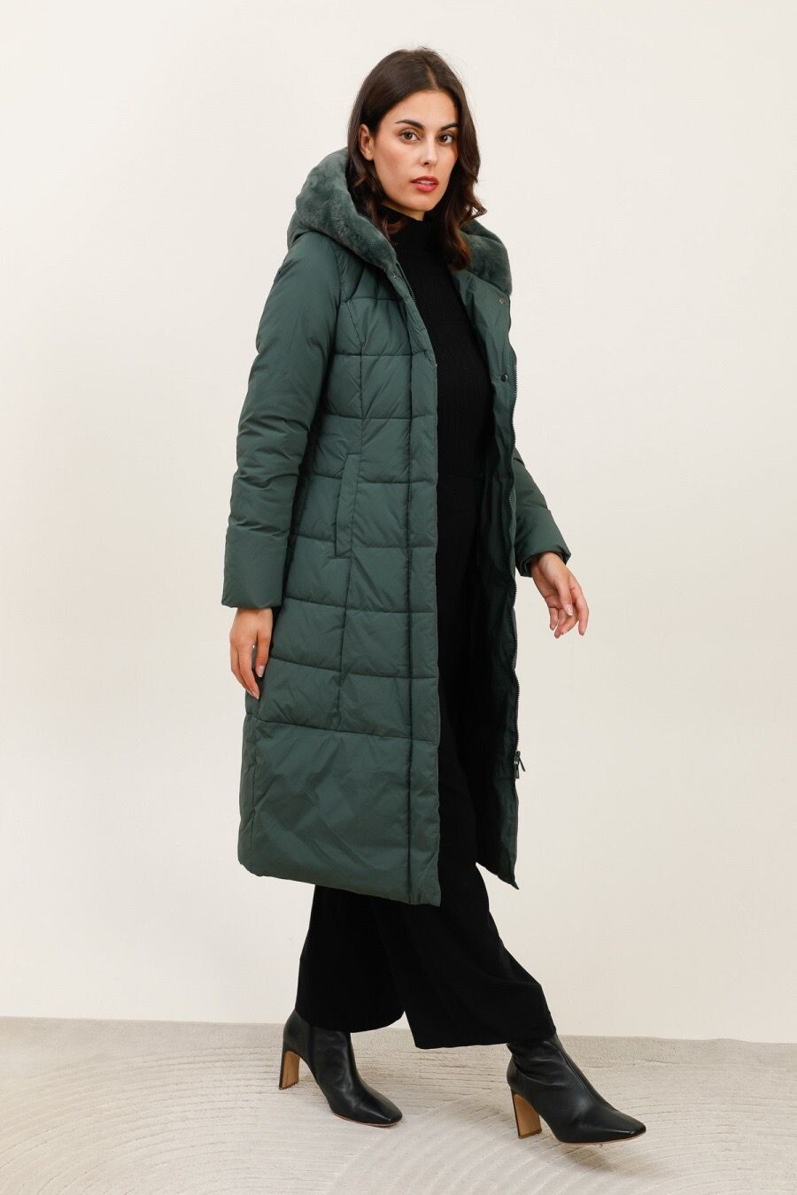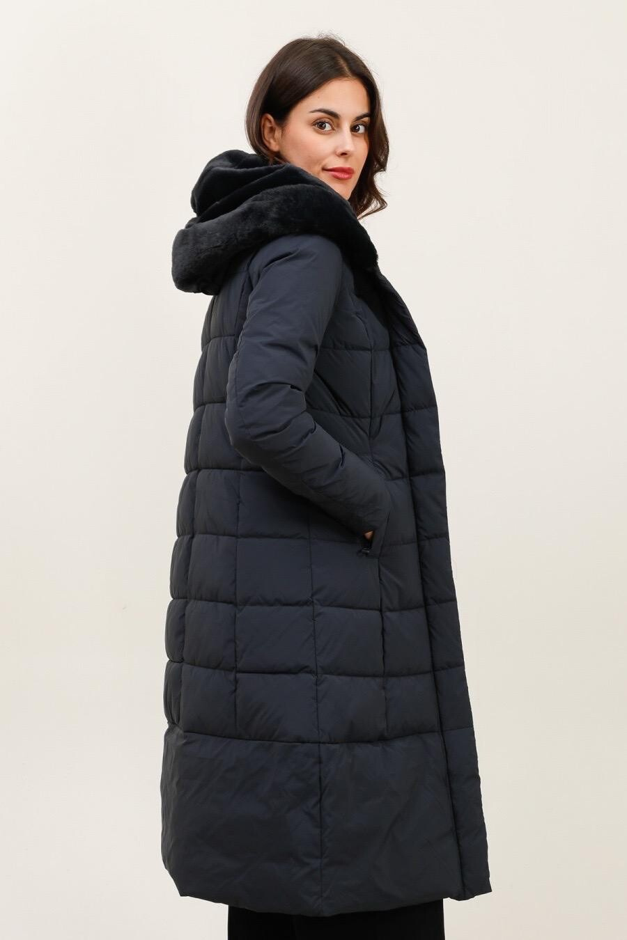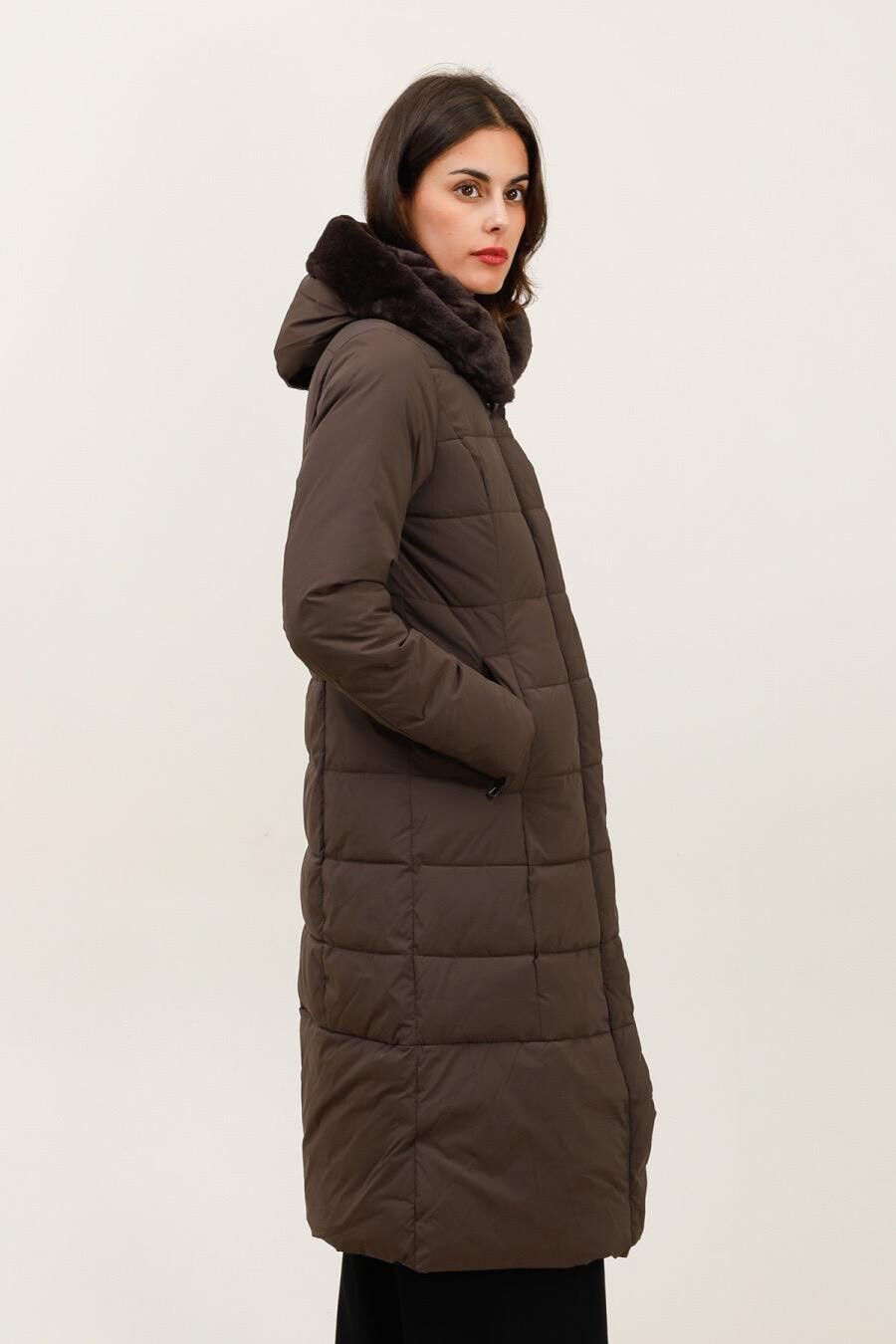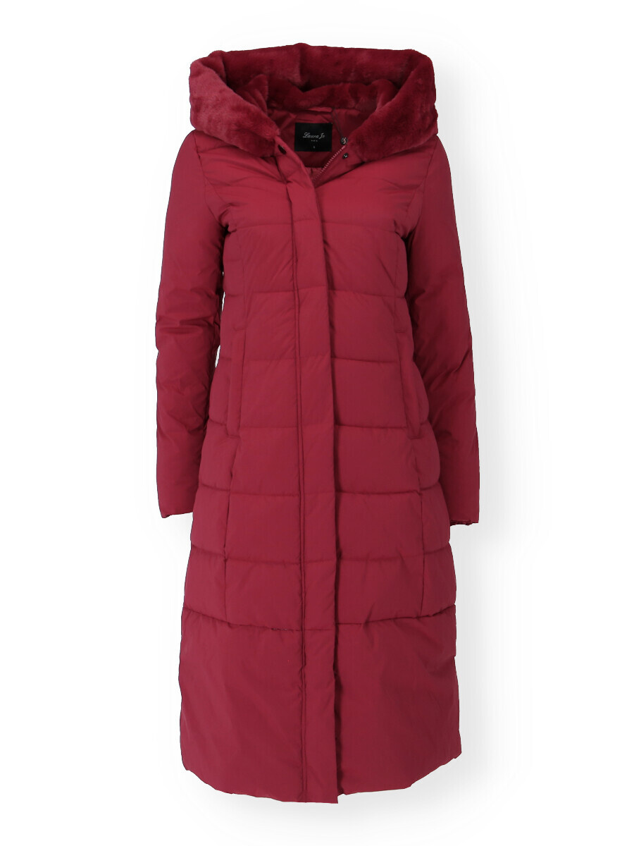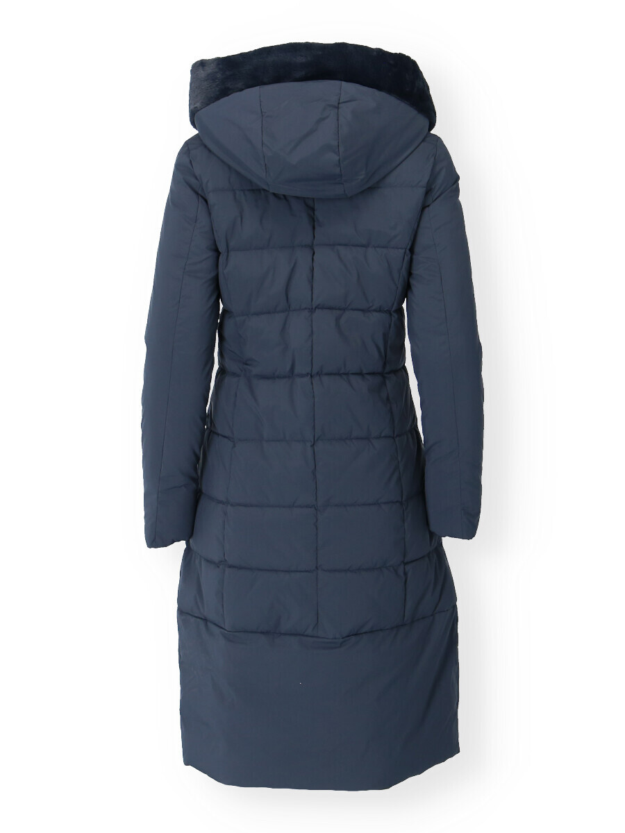 Módní prošívaný zimní kabát dlouhý. Kabát má zapínání na zip s klopou na druky, kožešinovou kapuci a všité kapsy po stranách.