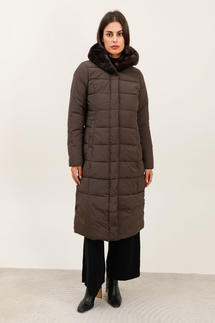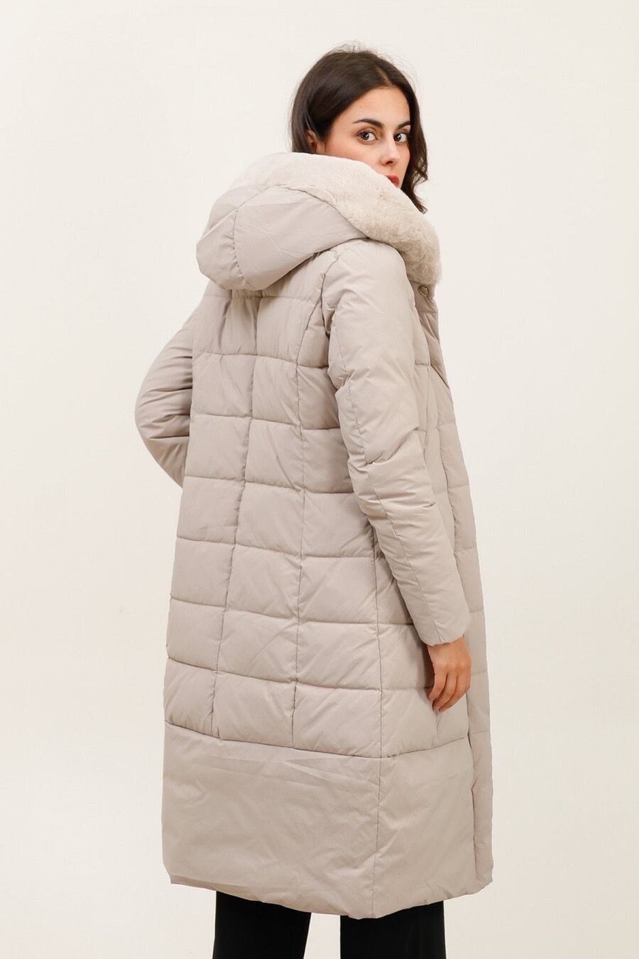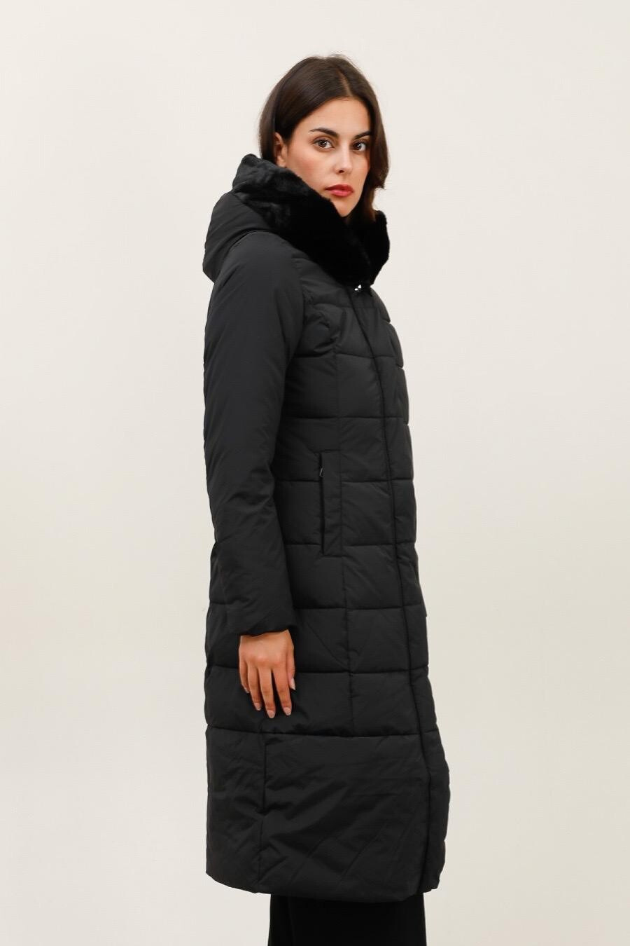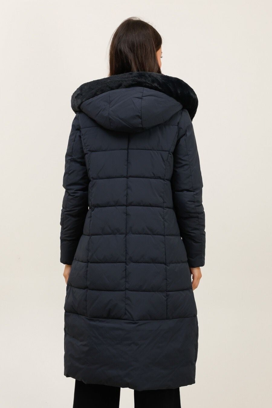 Módní prošívaný zimní kabát dlouhý. Kabát má zapínání na zip s klopou na druky, kožešinovou kapuci a všité kapsy po stranách.