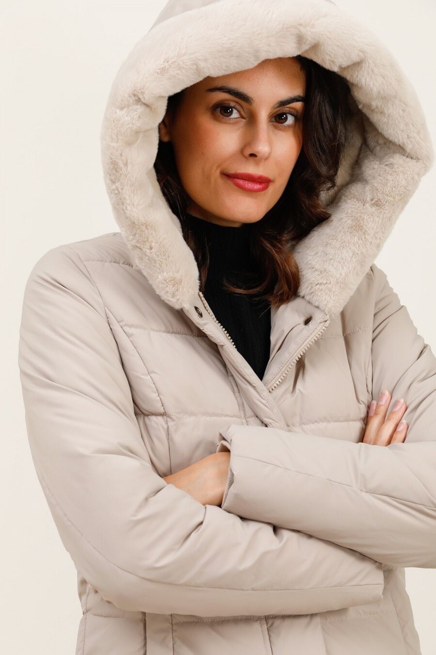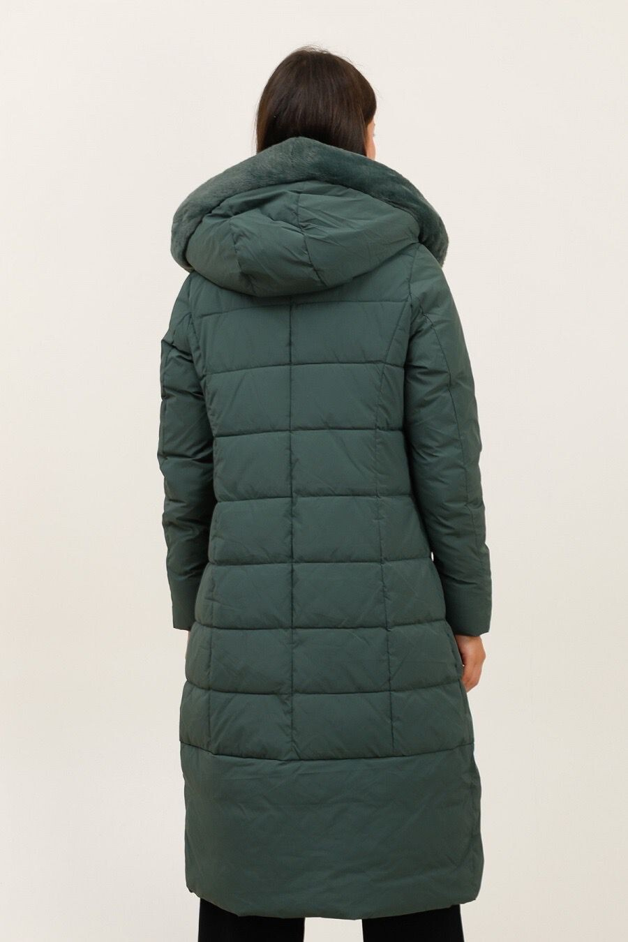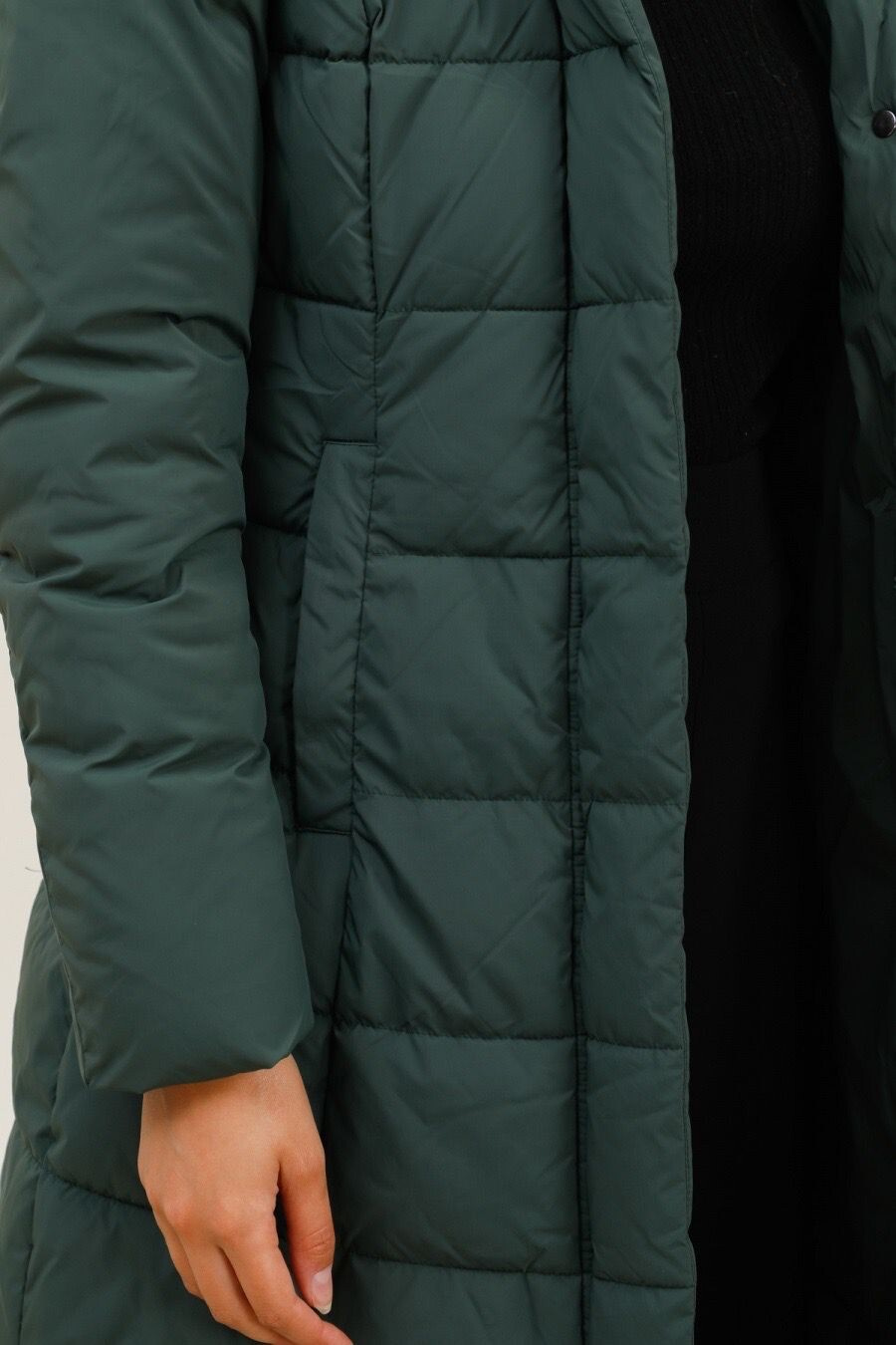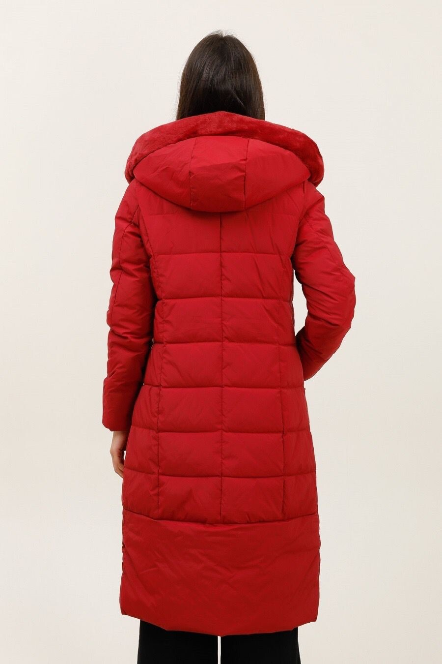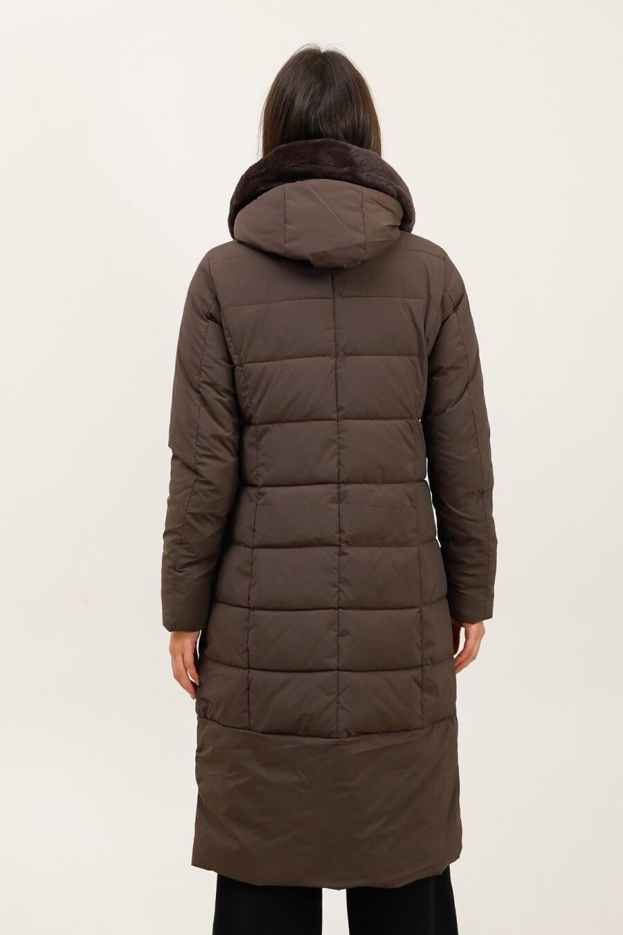 Módní prošívaný zimní kabát dlouhý. Kabát má zapínání na zip s klopou na druky, kožešinovou kapuci a všité kapsy po stranách.