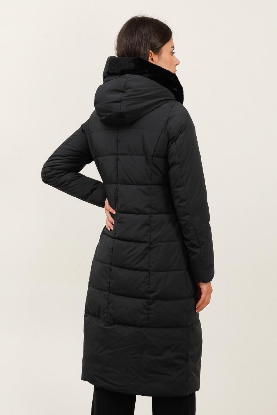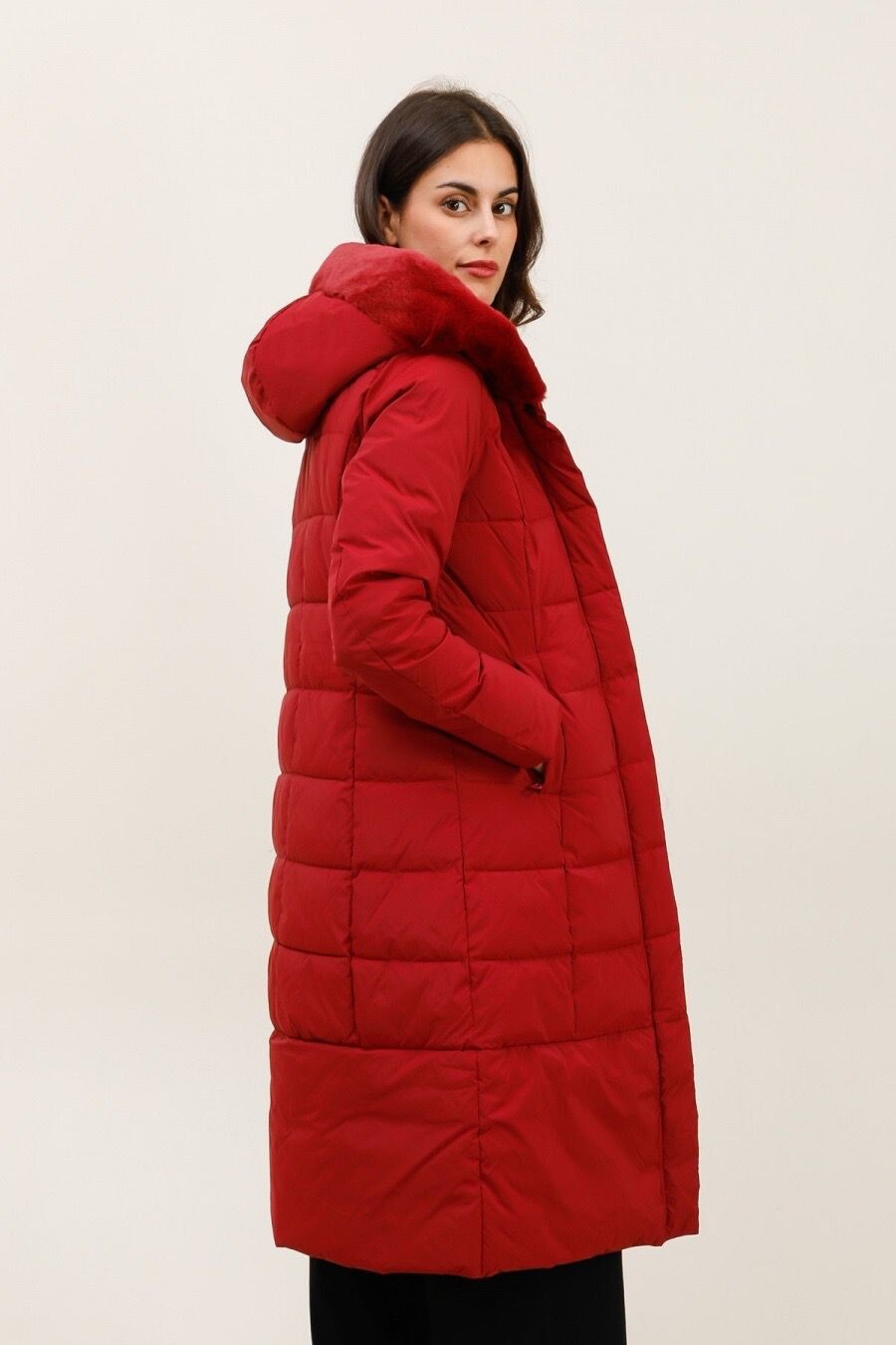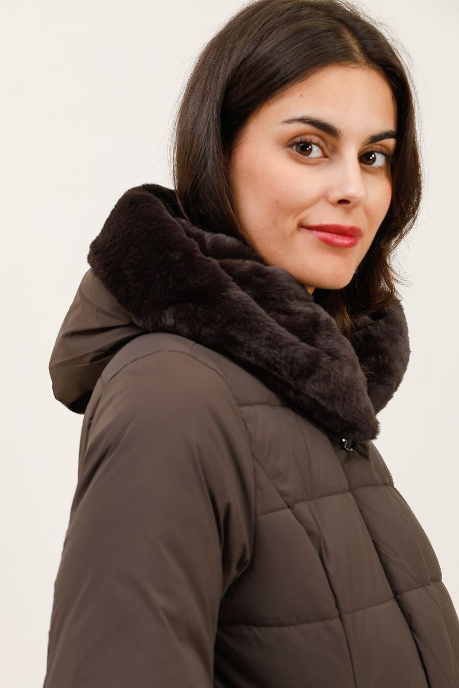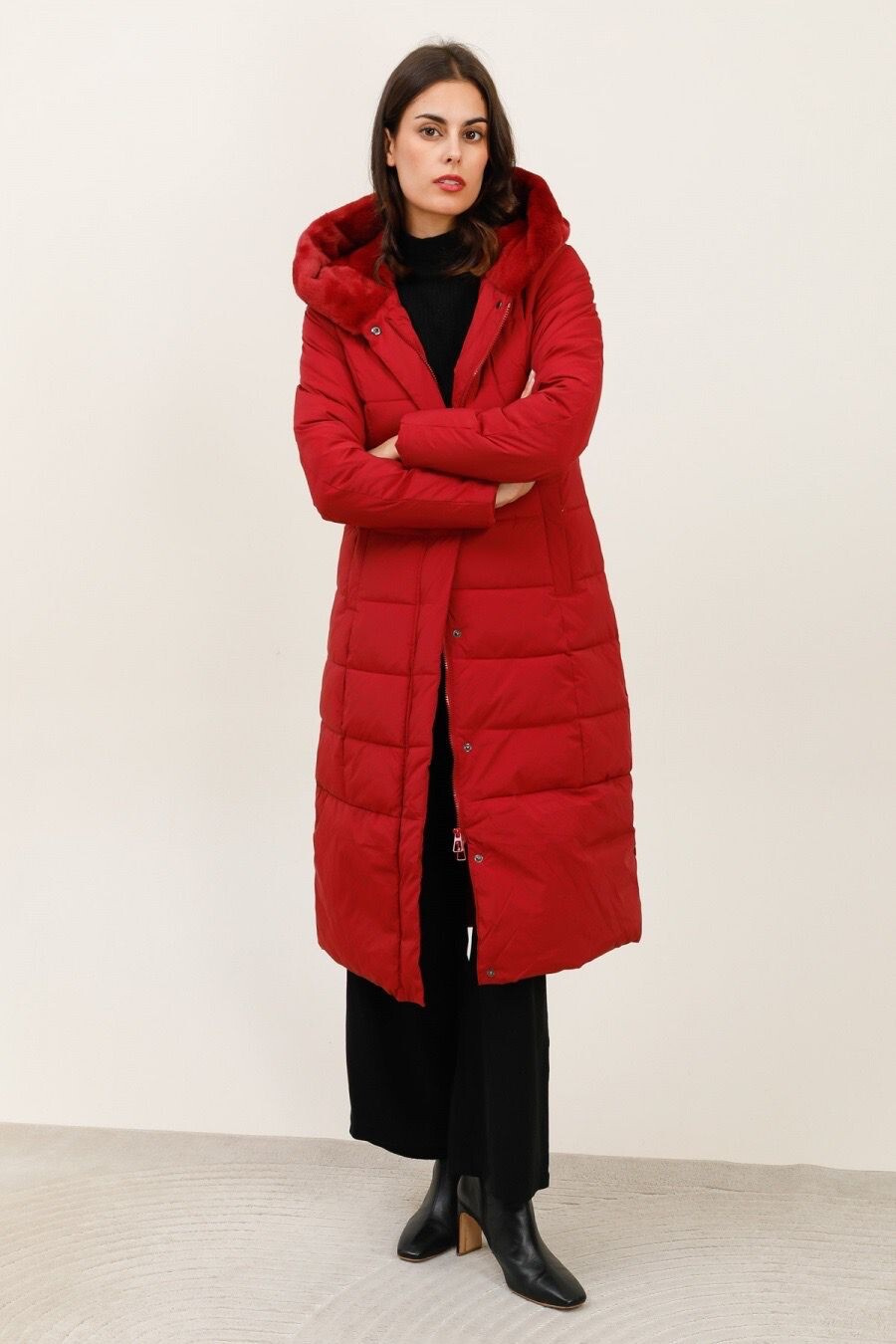 Módní prošívaný zimní kabát dlouhý. Kabát má zapínání na zip s klopou na druky, kožešinovou kapuci a všité kapsy po stranách.
